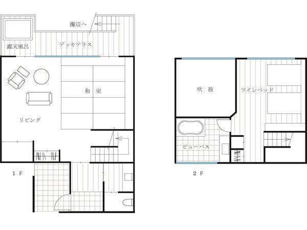 2階には34平米のツインルームと、広々としたビューバスがあります。離れ1階からは古茂江の渚までデッキがのび、海を間近に感じながら過ごすことができます。