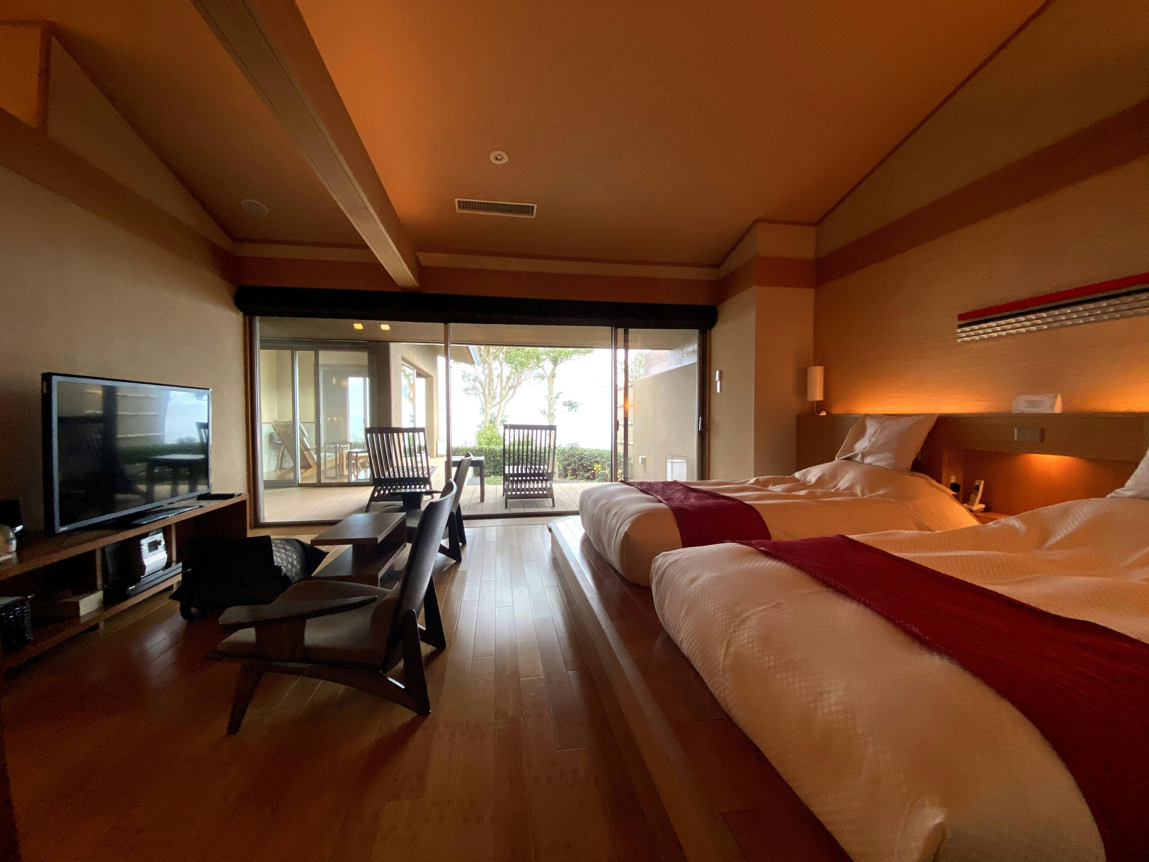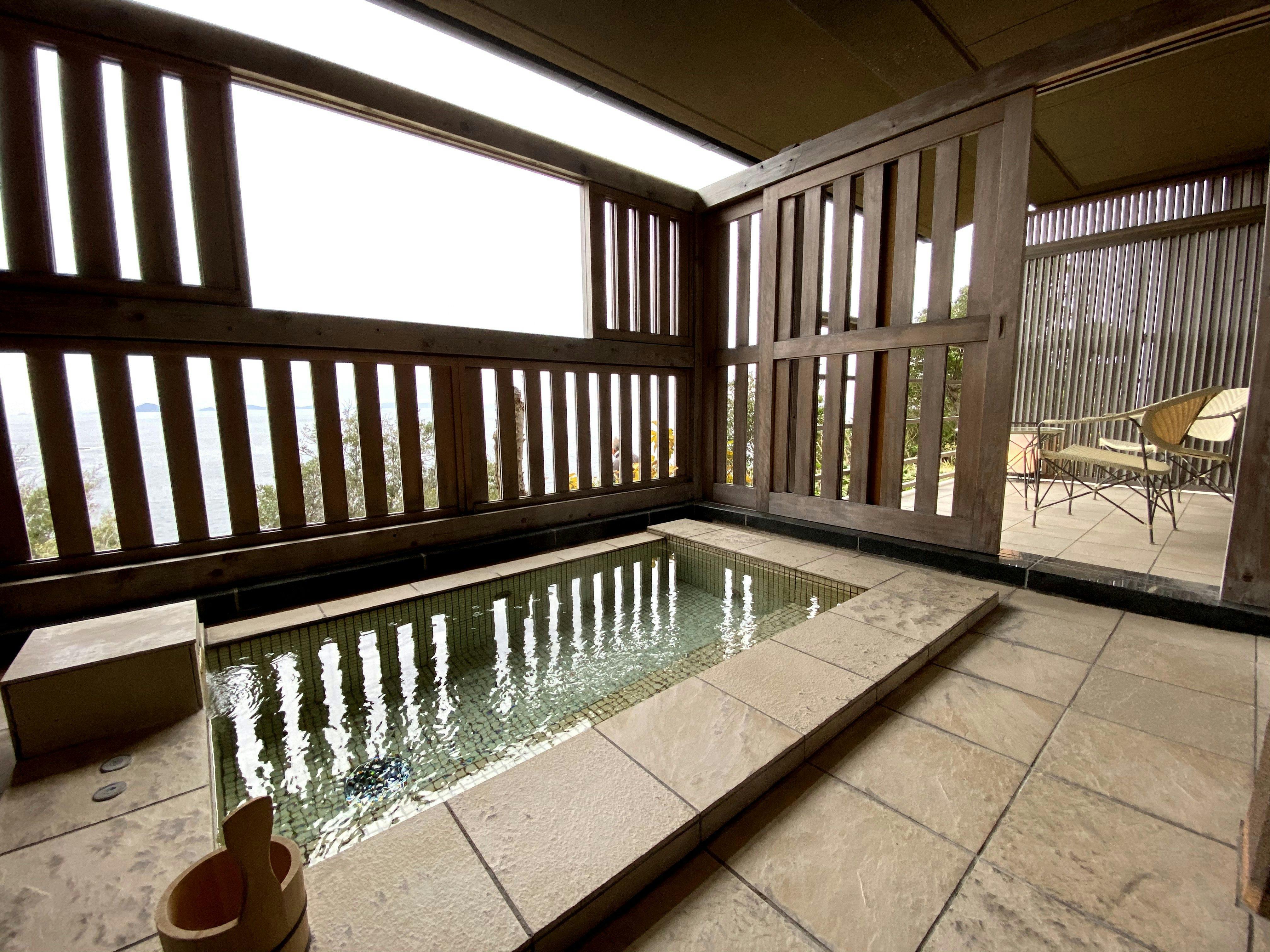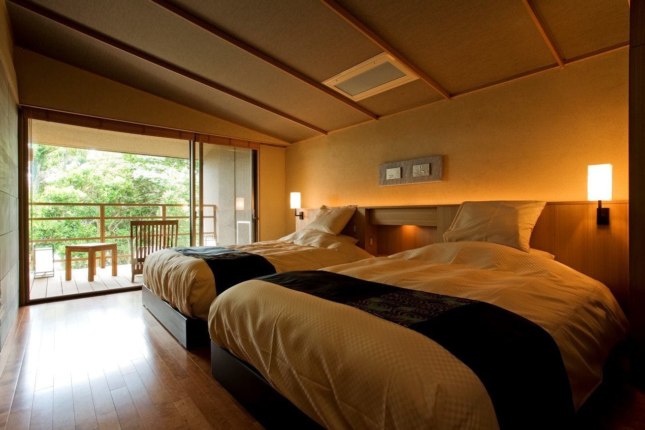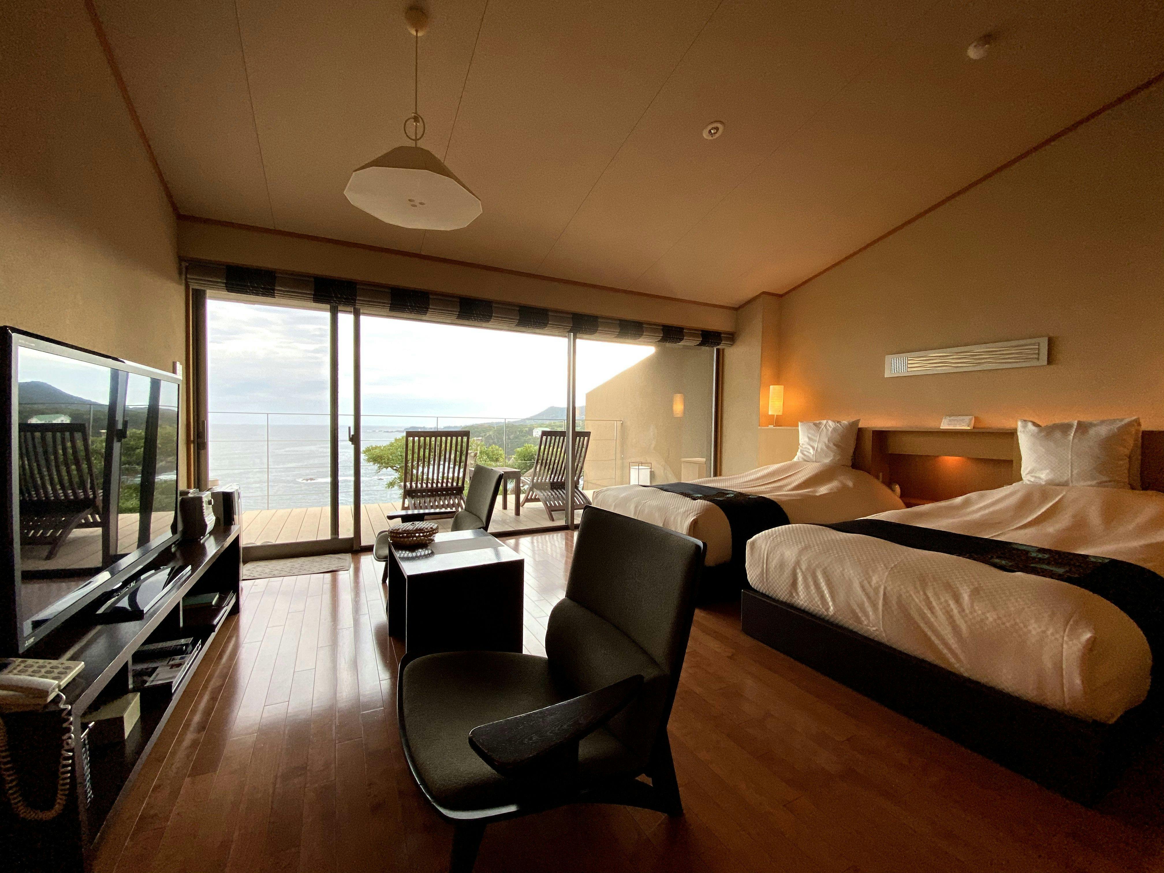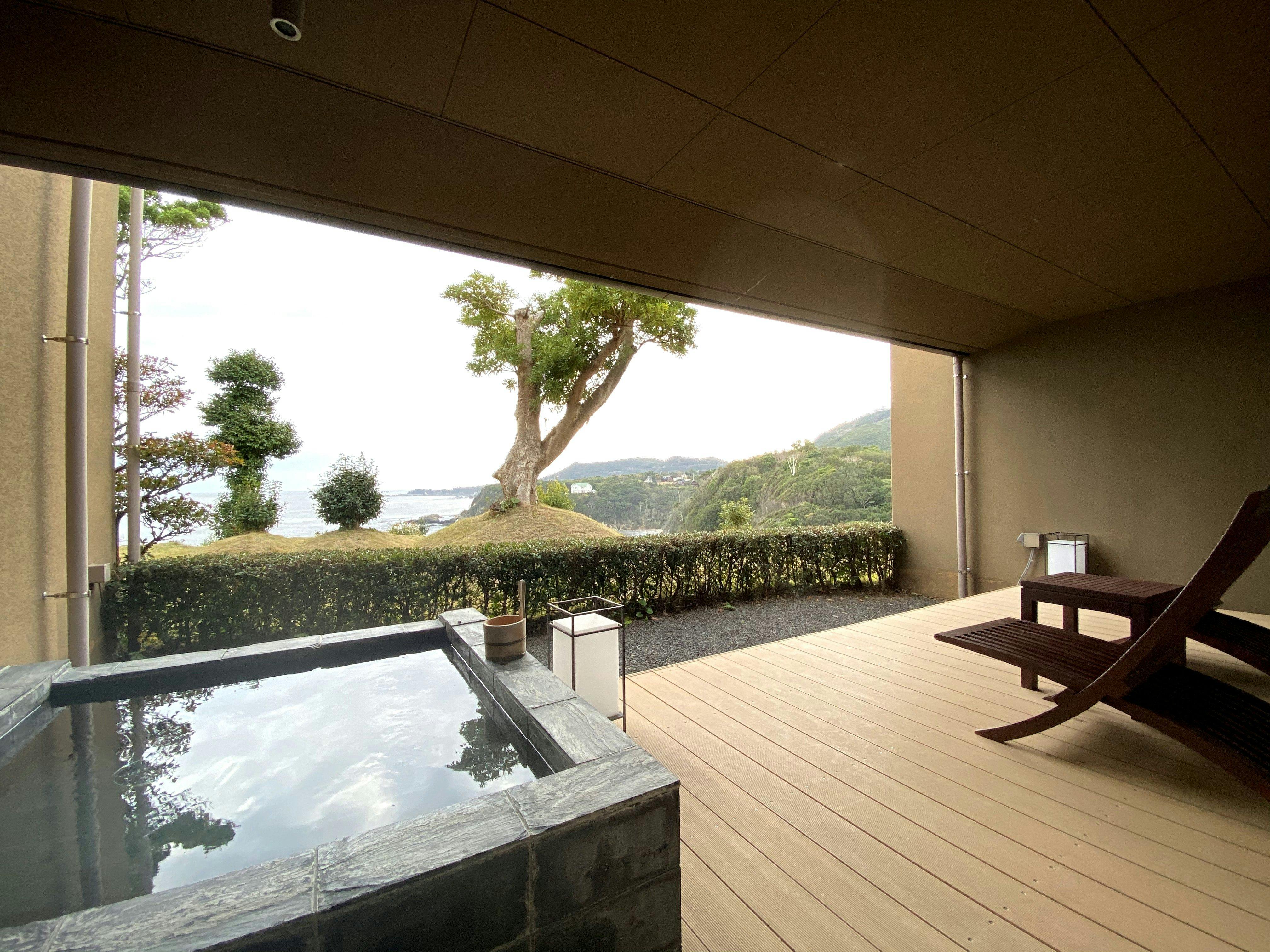 客室内の専用露天風呂まで段差のないユニバーサルデザインの客室大きな窓から原生林を手前に、合間から広がる雄大な海を望む景色はまるで一枚の絵画手付かずの自然の風景をお楽しみいただけます特別な“二人旅”を演出する2名様定員の客室となります