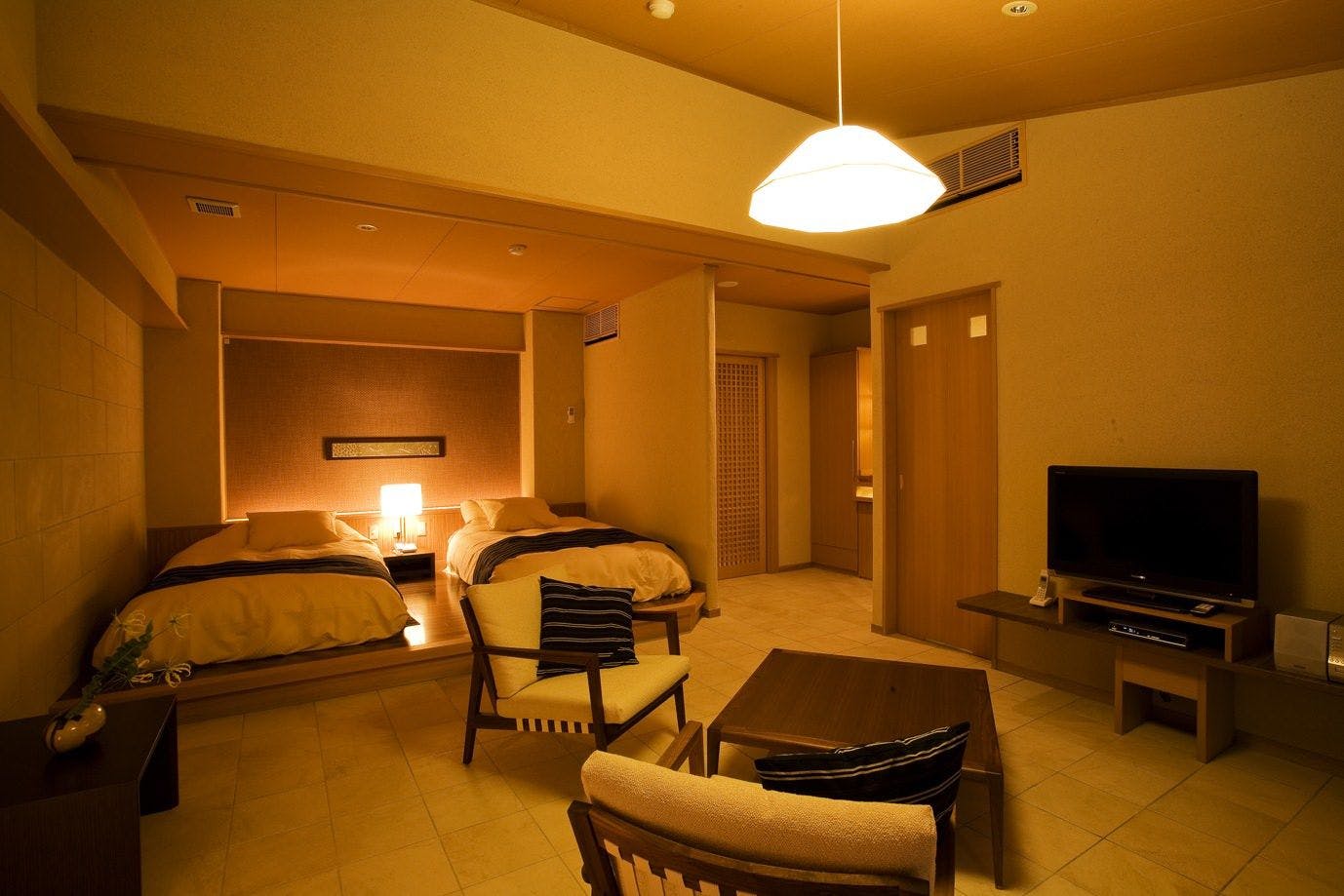 リビング、ベットルーム、露天風呂のほかに客室外にリラクゼーションルームを備えた客室ゆっくりと時間を忘れ、読書や絵画の制作など自分の時間を楽しむためのお部屋です東向きに創られた客室からは夜には「月」そして朝日をご覧頂くことができます