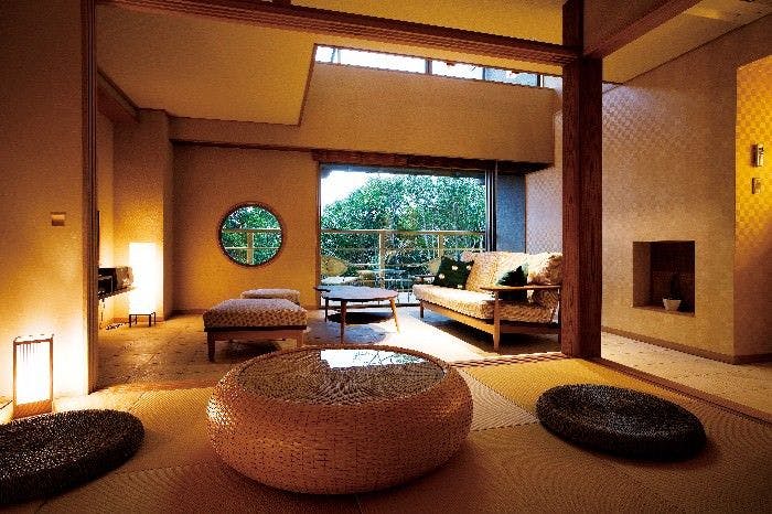 原生林の合間から見える雄大な海を望む客室自生する原生の森をそのままに、日本の庭園文化が持つ技法「天・地・人」を生かした“借景”はただゆっくりと眺めをお楽しみいただけます。