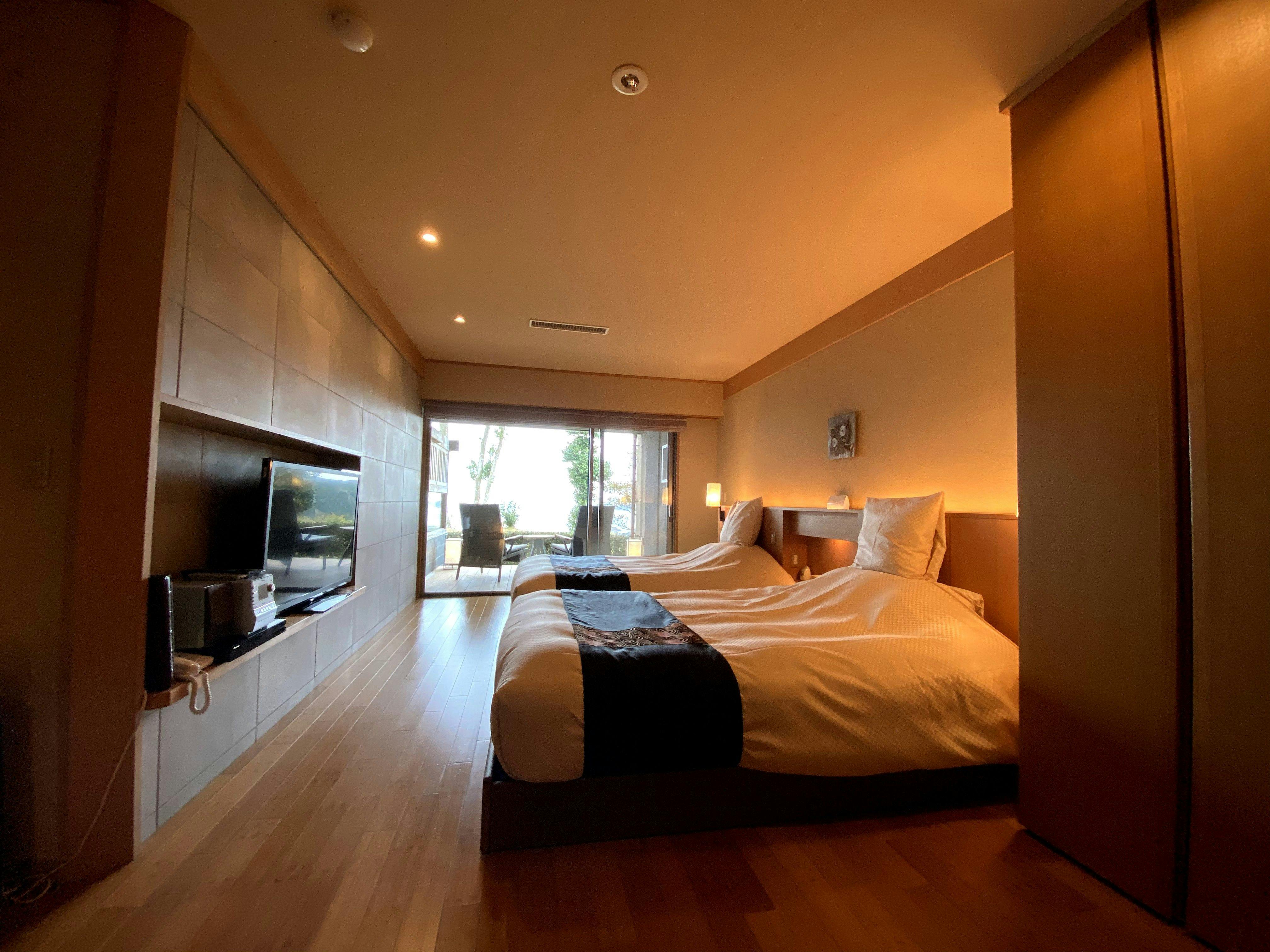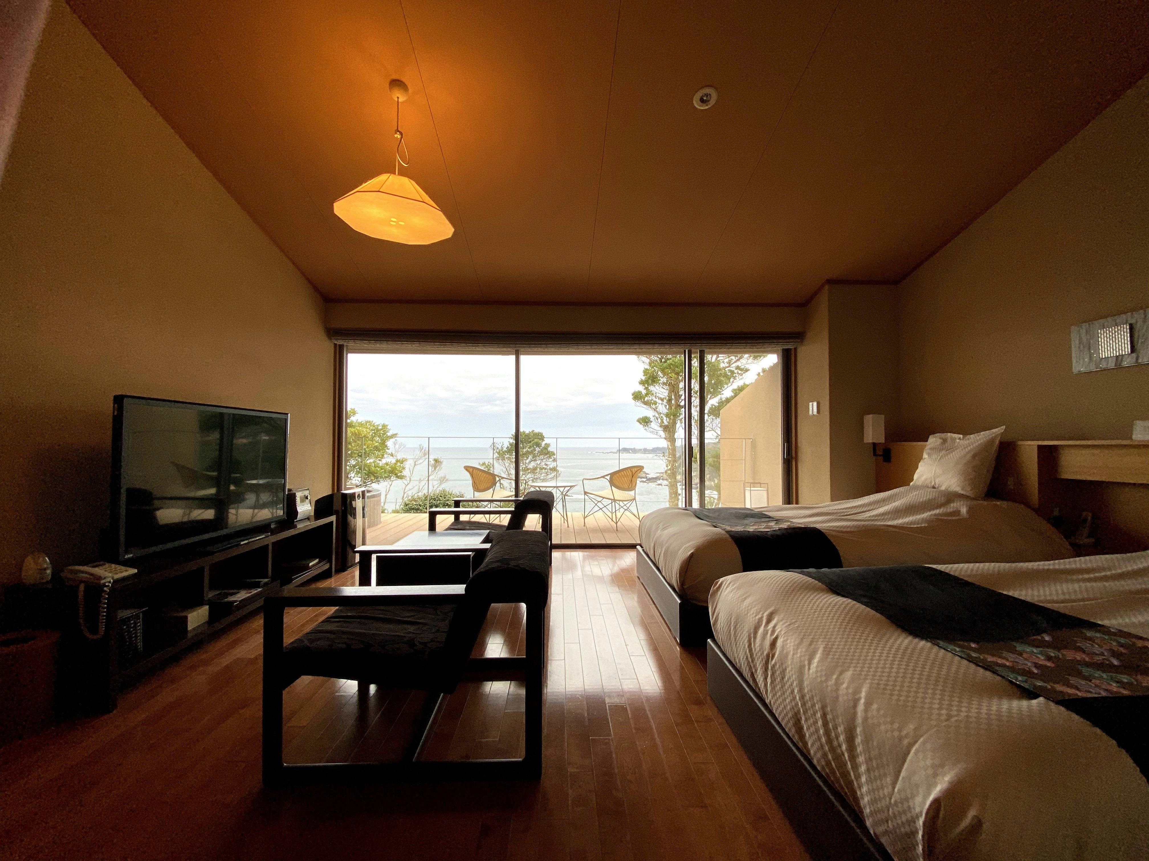 御宿The Earthのゲストルームの中では最もシンプルなデザインのお部屋ながらも、海に最も近い客室低床のベットから眺める一枚絵の景観は時間の流れを忘れるほど静かな入江と岩にぶつかる波しぶきが“地球の力”を感じさせます特別な“二人旅”を演出する2名様定員のお部屋となります
