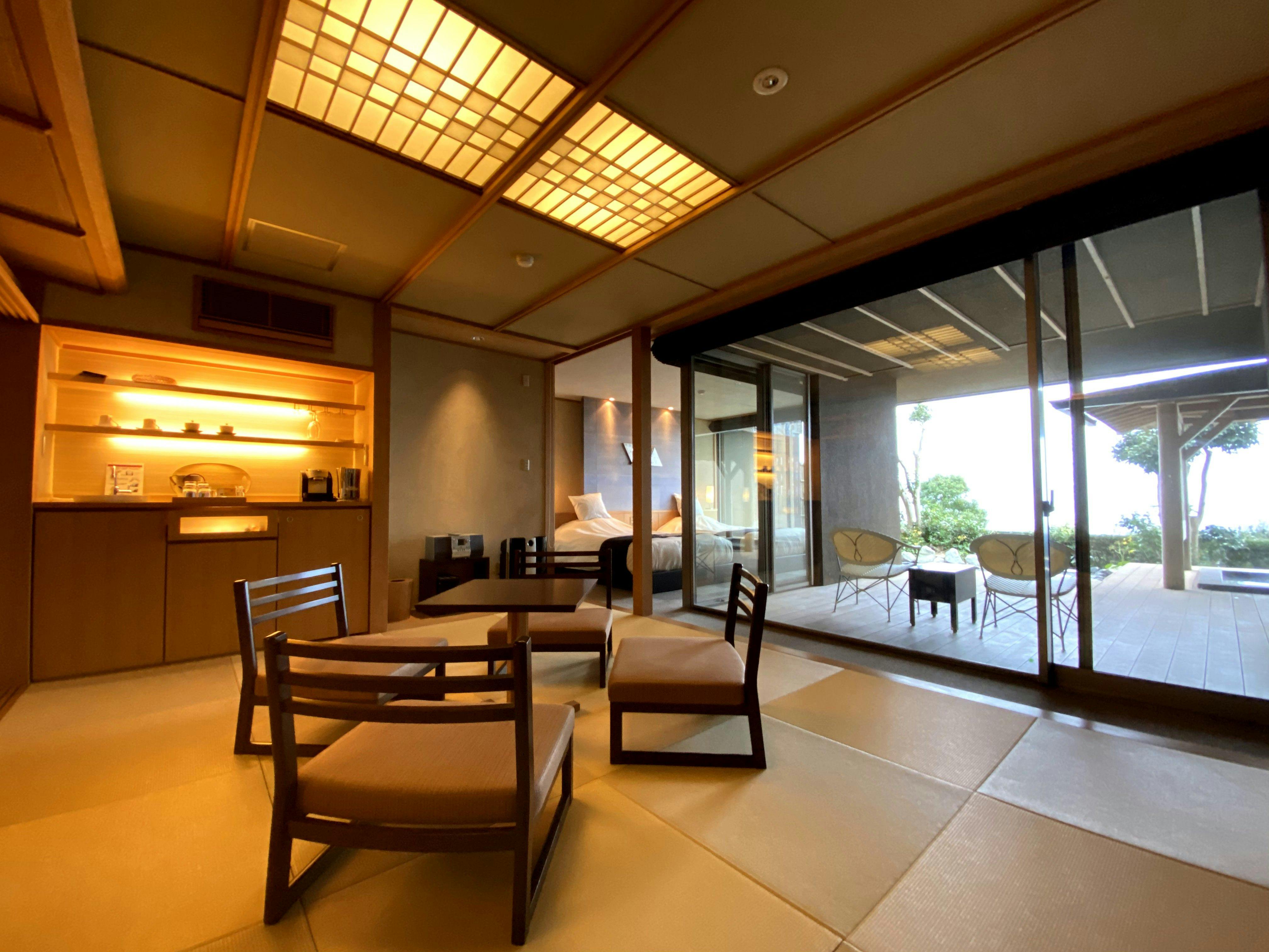 リビング、ベットルーム、露天風呂のほかに客室外にリラクゼーションルームを備えた客室です。ゆっくりと時間を忘れ、読書や絵画の制作など自分の時間を楽しむためのお部屋です水平線から昇る朝陽、そして夜には漆黒の海に映る月を地球のリズムが生み出す絶景をお楽しみ頂けます。