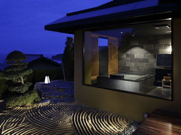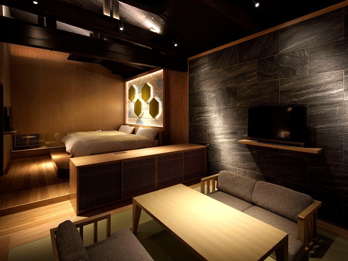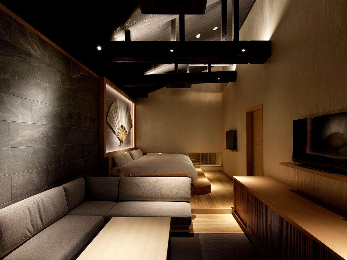 ベッドと居間、部屋からは「丹後の砂浜をイメージした」枯山水の庭をお楽しみ頂けます。