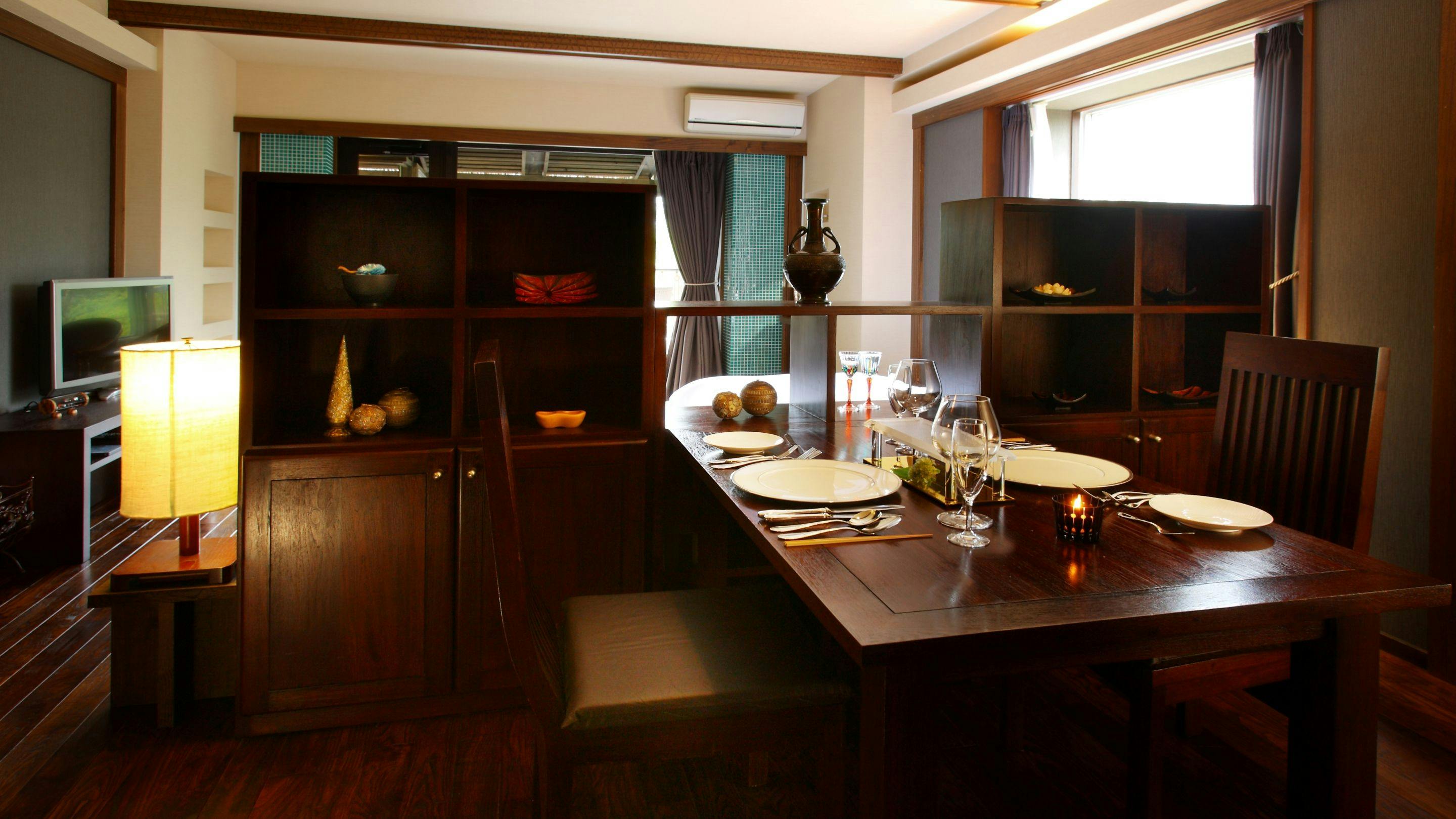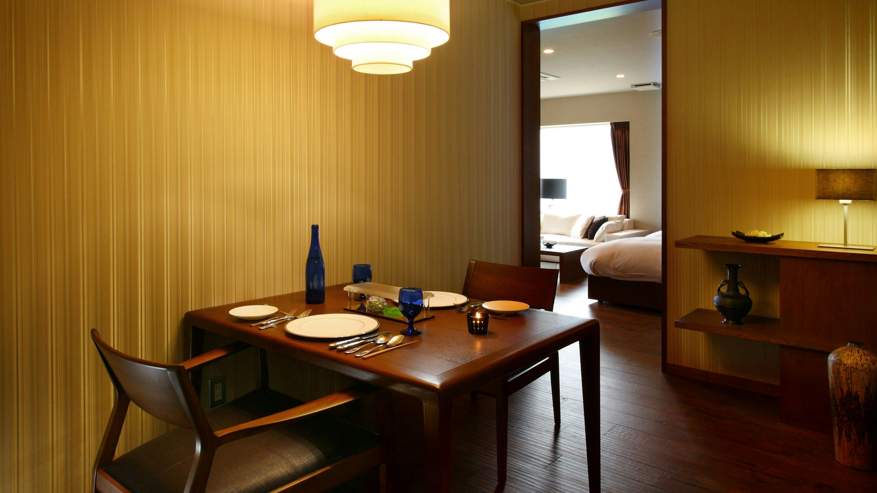 大理石のフロアにツインベットとダイニングを備えた解放感のあるワンルーム仕様です。