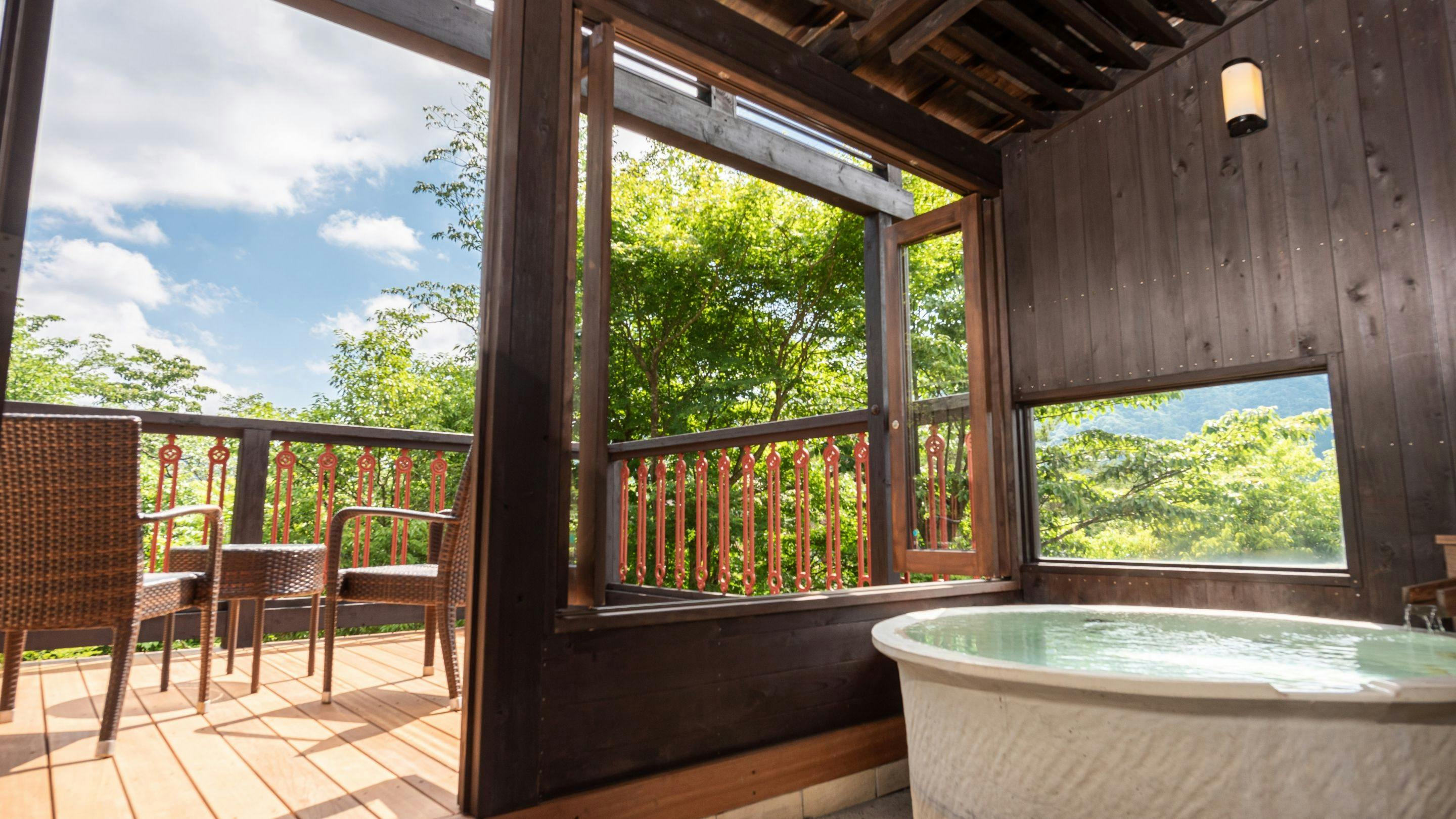 展望半露天風呂は、和の趣を大切にした自然を身近に感じるデッキテラスを備えています。