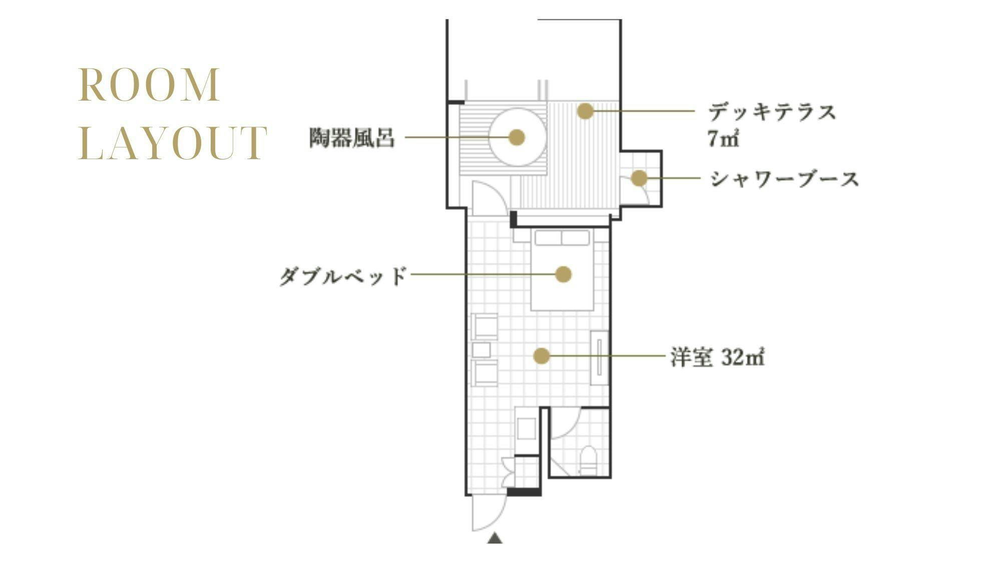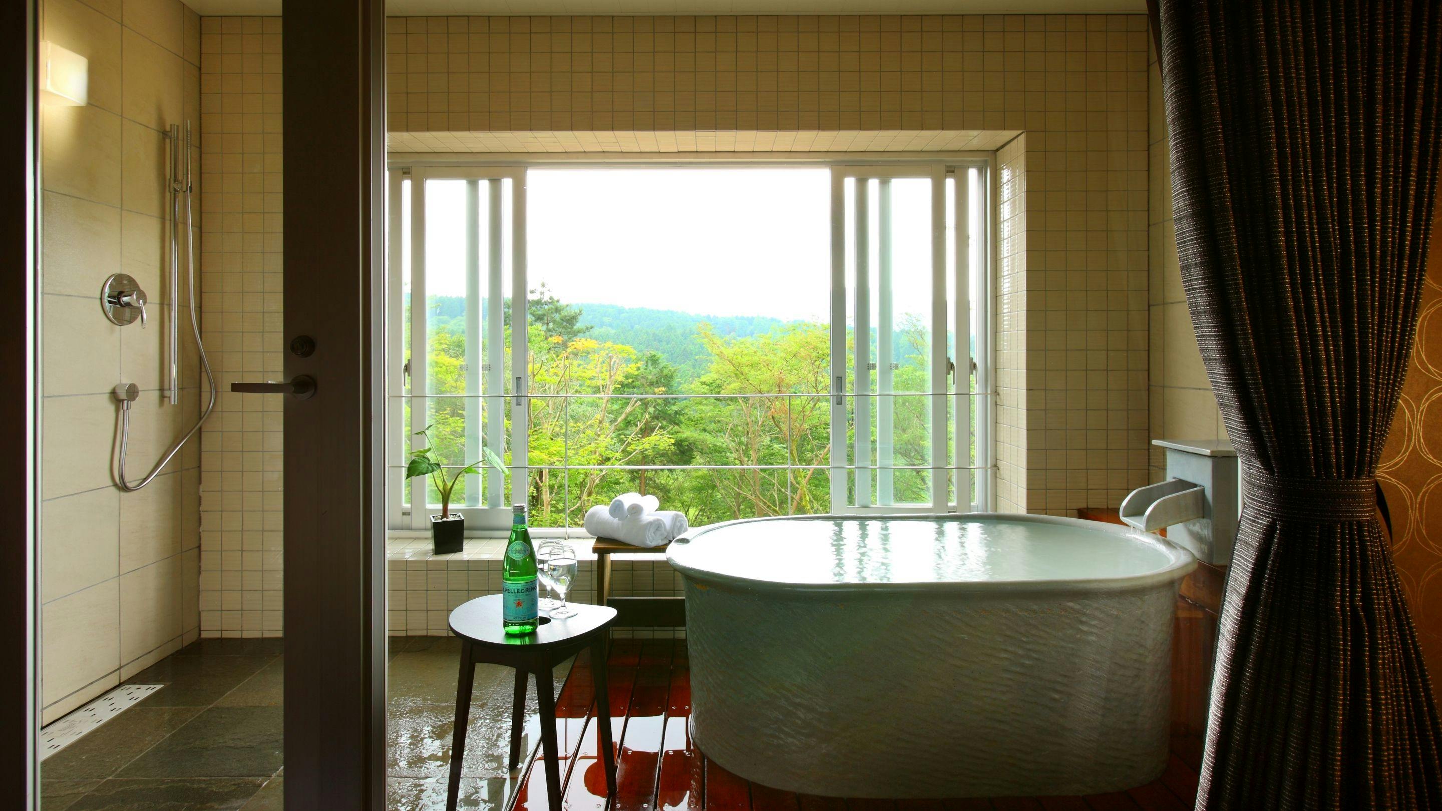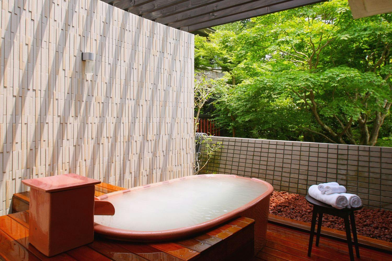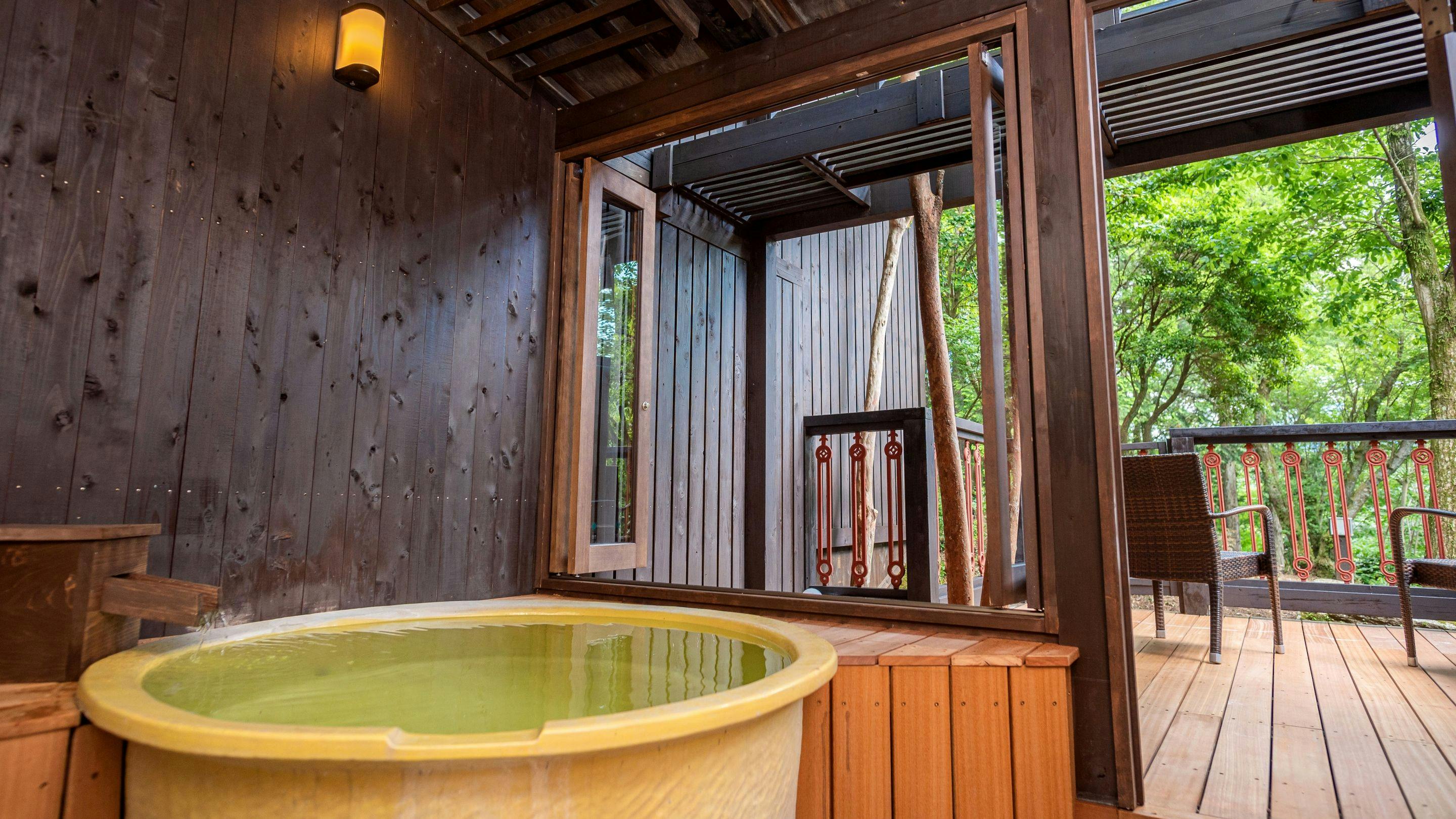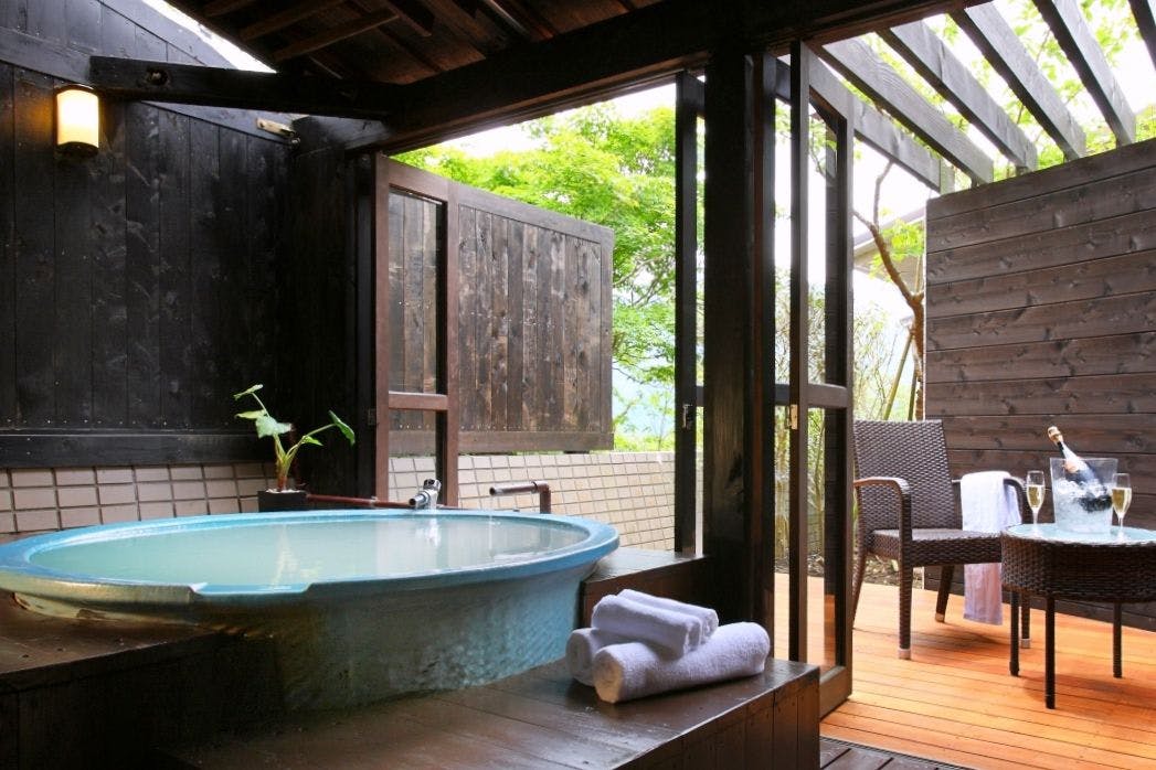 角部屋の広いテラスには、足をのばしてもまだ余裕のある陶製露天風呂を備えています。