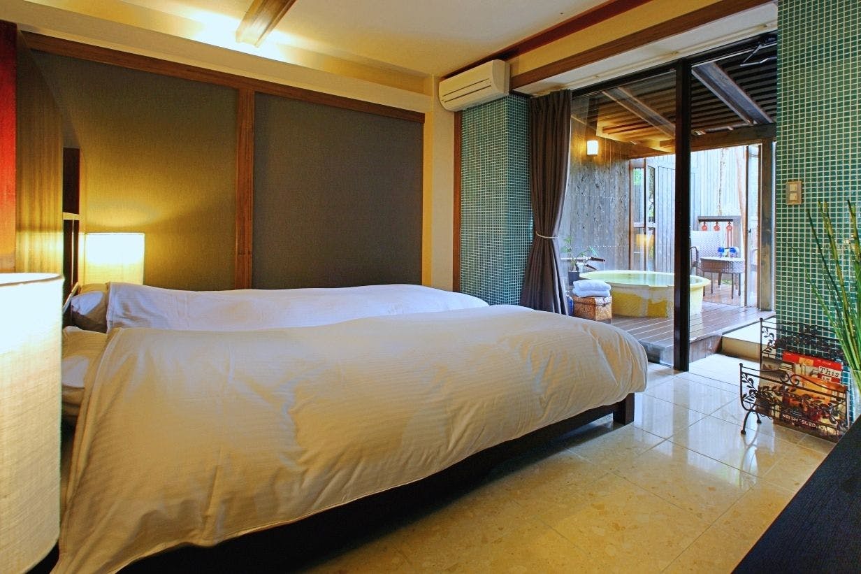 素足に心地よい琉球畳にはダブルベッドを備えています。