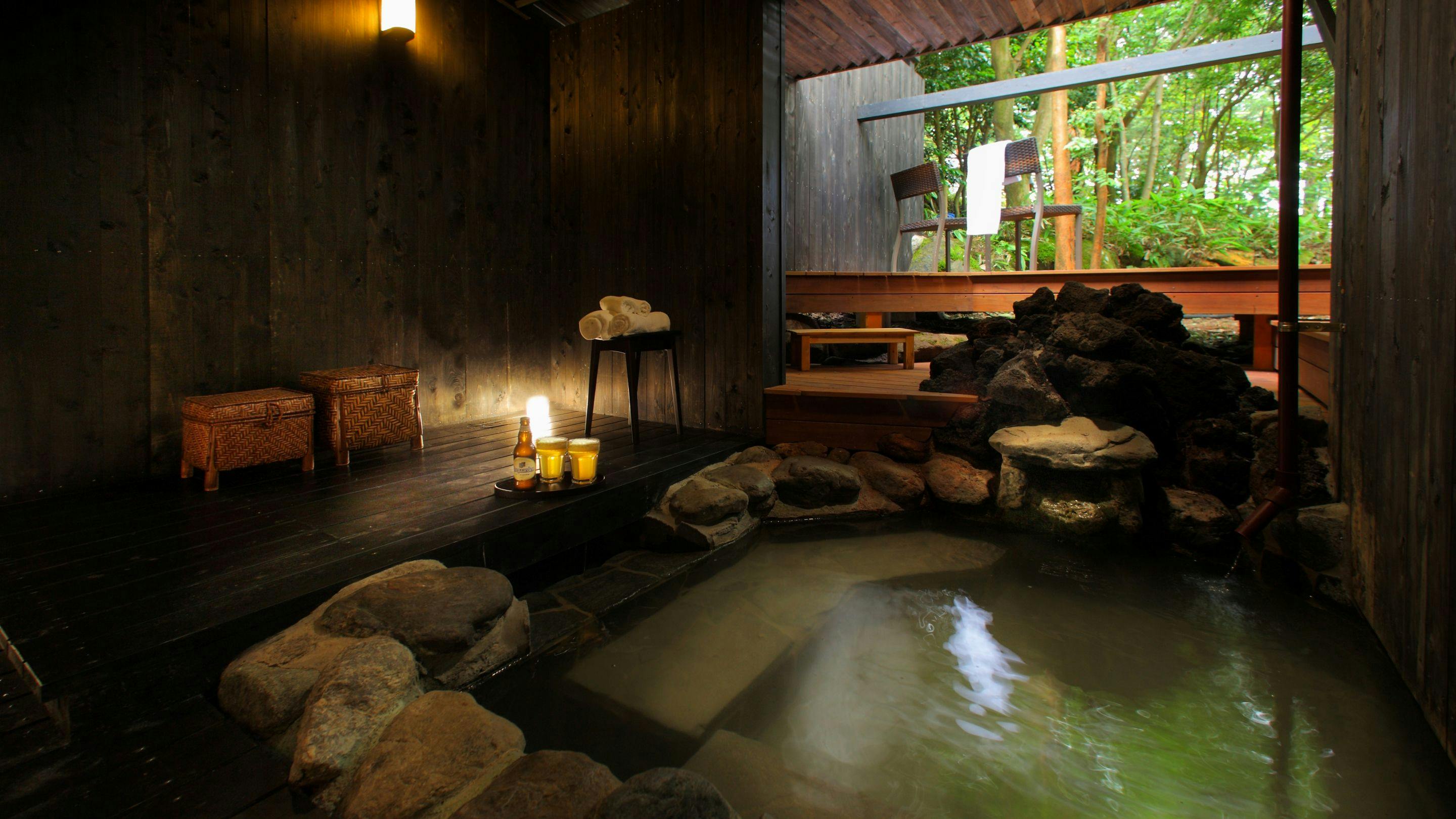玄武岩を使用した岩風呂の露天風呂で温まり、瞑想的な時間をお過ごしください。