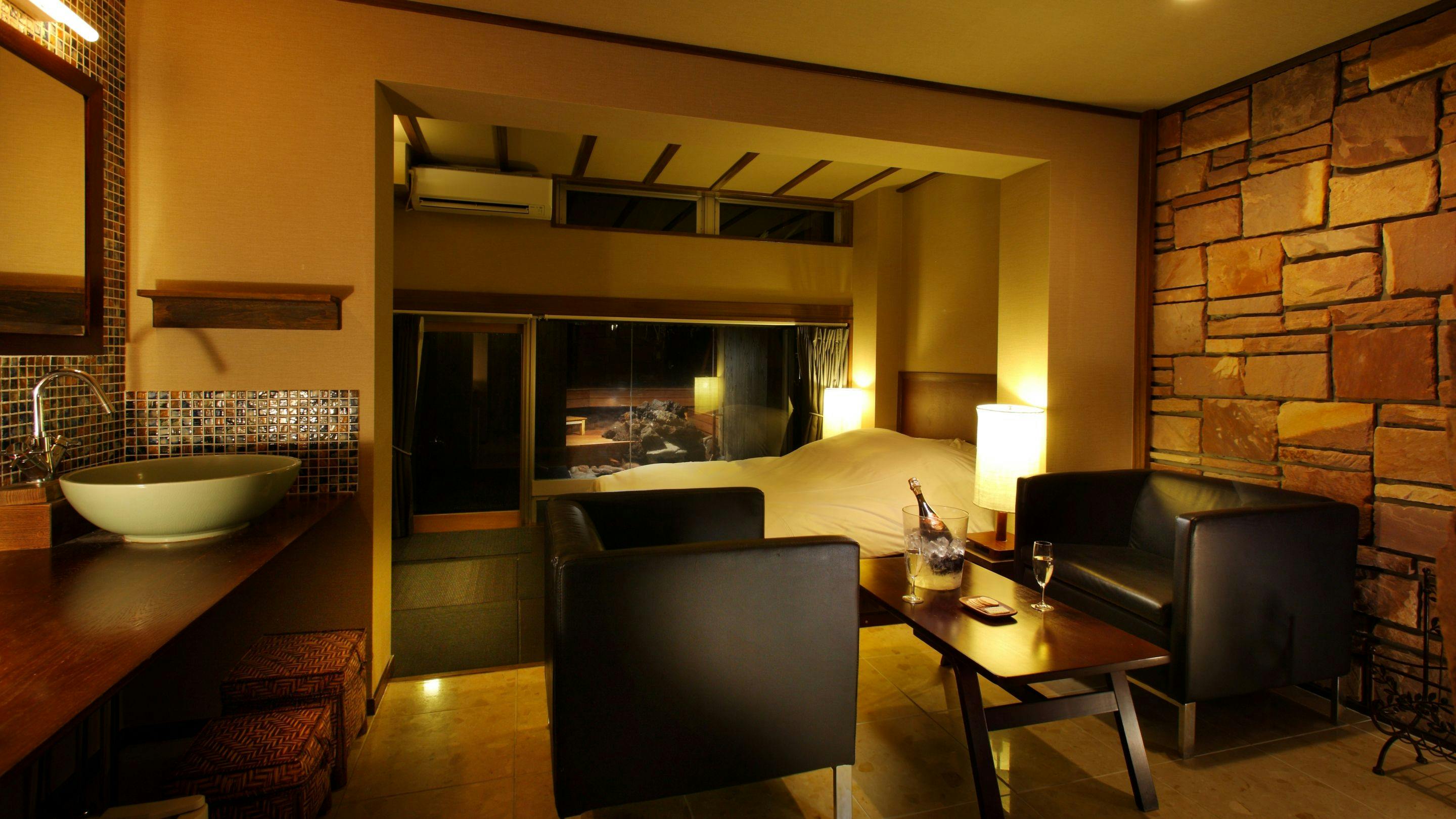 専用風呂の壁には砂岩をあしらっています。それぞれの素材が生み出すオリエンタルなコントラストをお楽しみください。