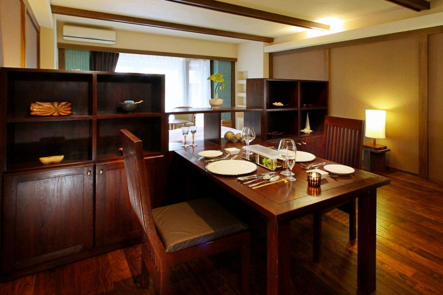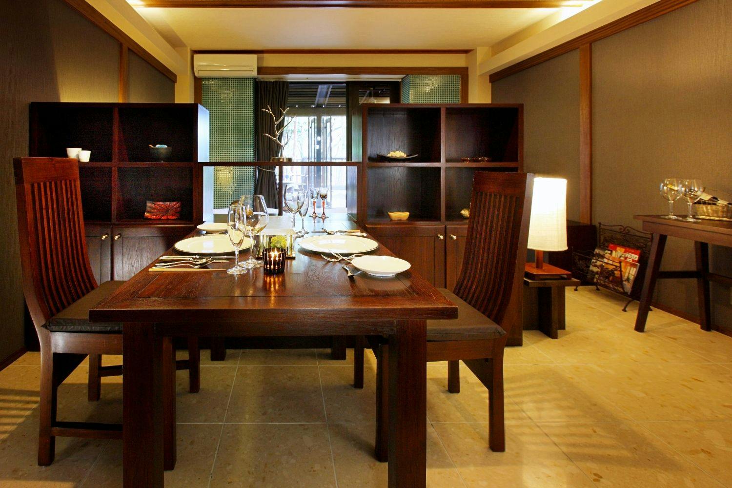 チーク家具や美しいタイルを合わせたオリエンタルな趣です。