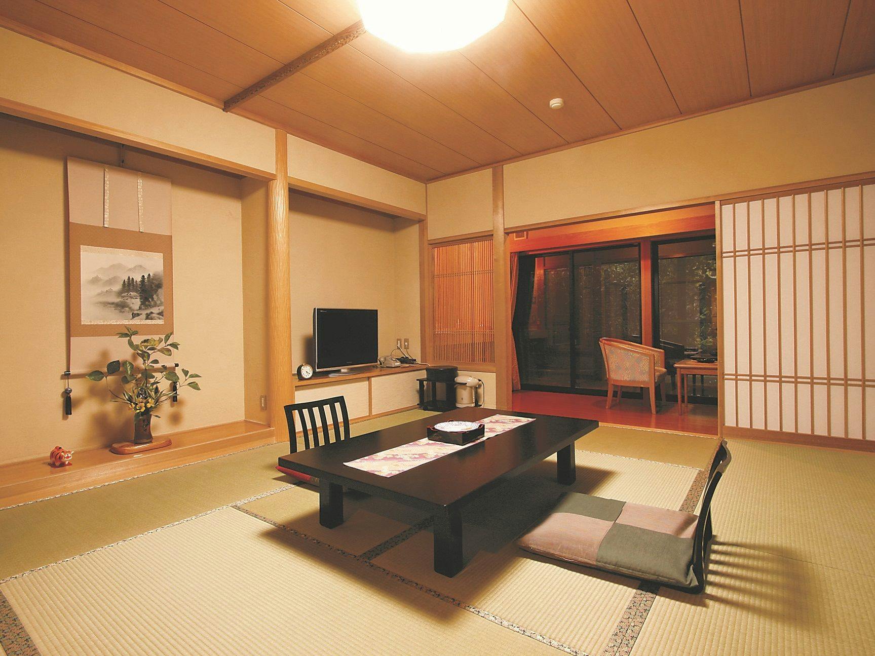 静かな空間で落ち着きのある和室10畳です。窓から見える四季折々の景色もぜひお楽しみくださいませ。