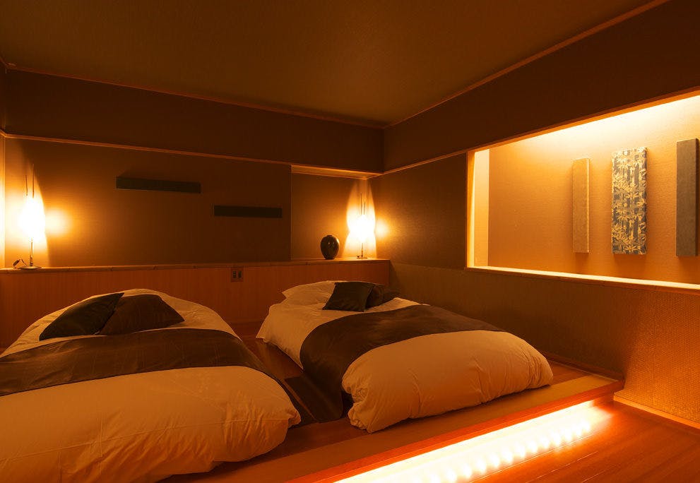 お部屋は広々お使いいただける60平米の広さ。お部屋には体に優しくフィットするシモンズ製和モダンベッドで質の高い睡眠をどうぞ。当館裏手から沸く源泉100%の温泉で贅沢な露天風呂客室でゆっくり快適にお過ごしになれます。
