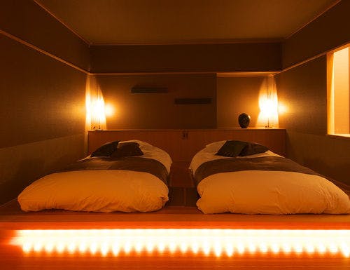 モダンなインテリアでコーディネイトした特別室は100平米と広々快適にお使いいただけるお部屋でございます。ベッドは体に優しくフィットするシモンズ製ベッド。ゆっくりした時間の中、質の高い睡眠をどうぞ。