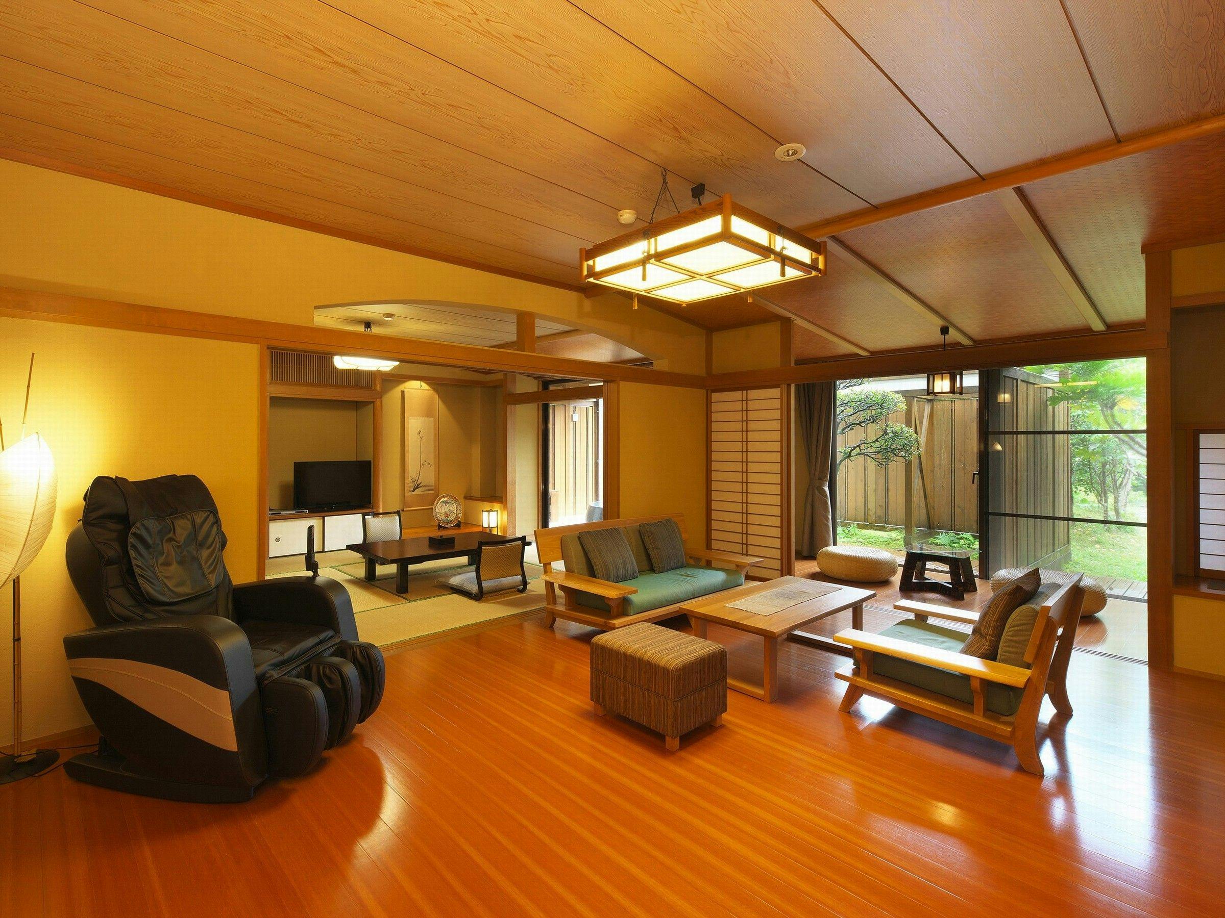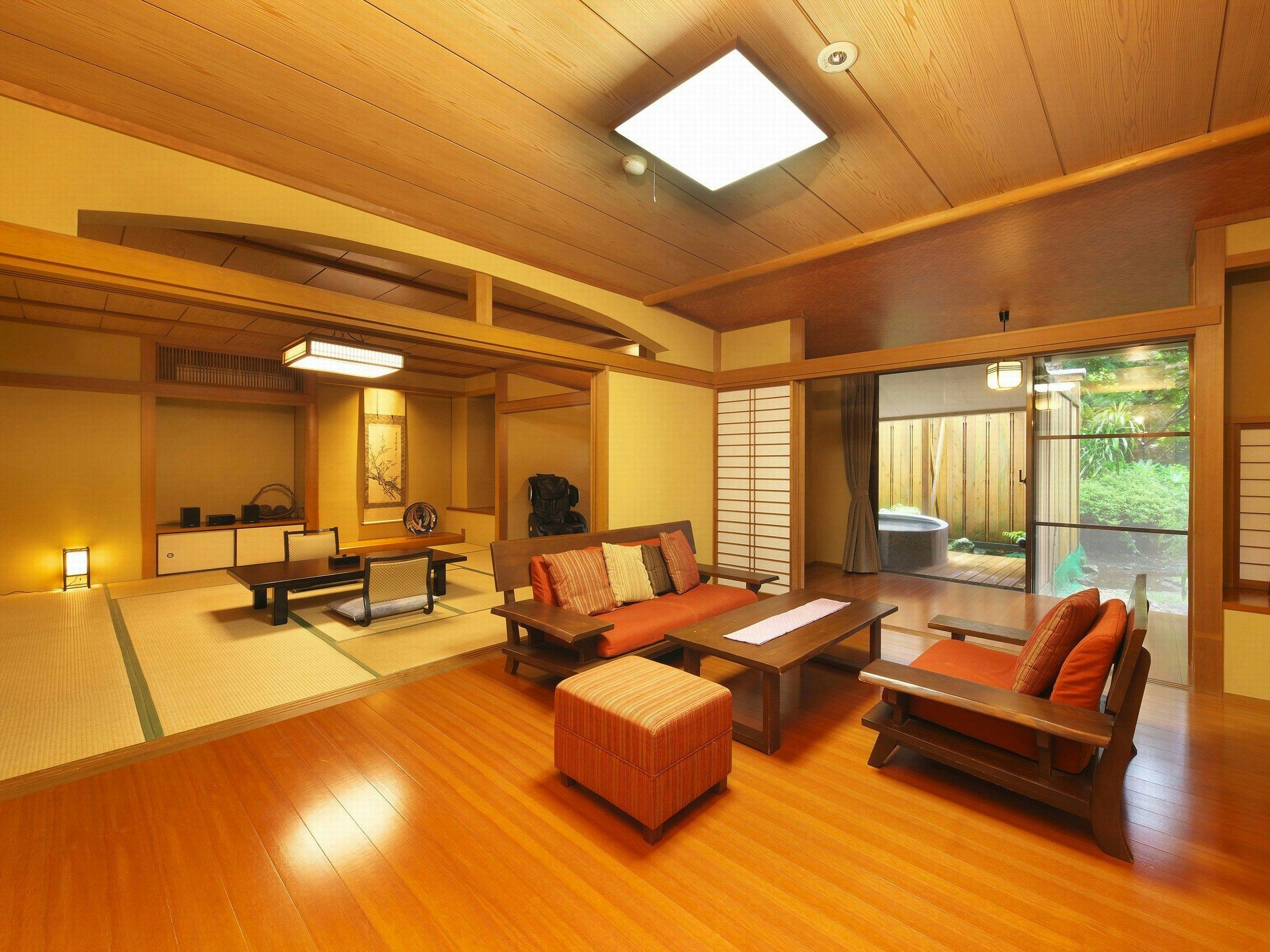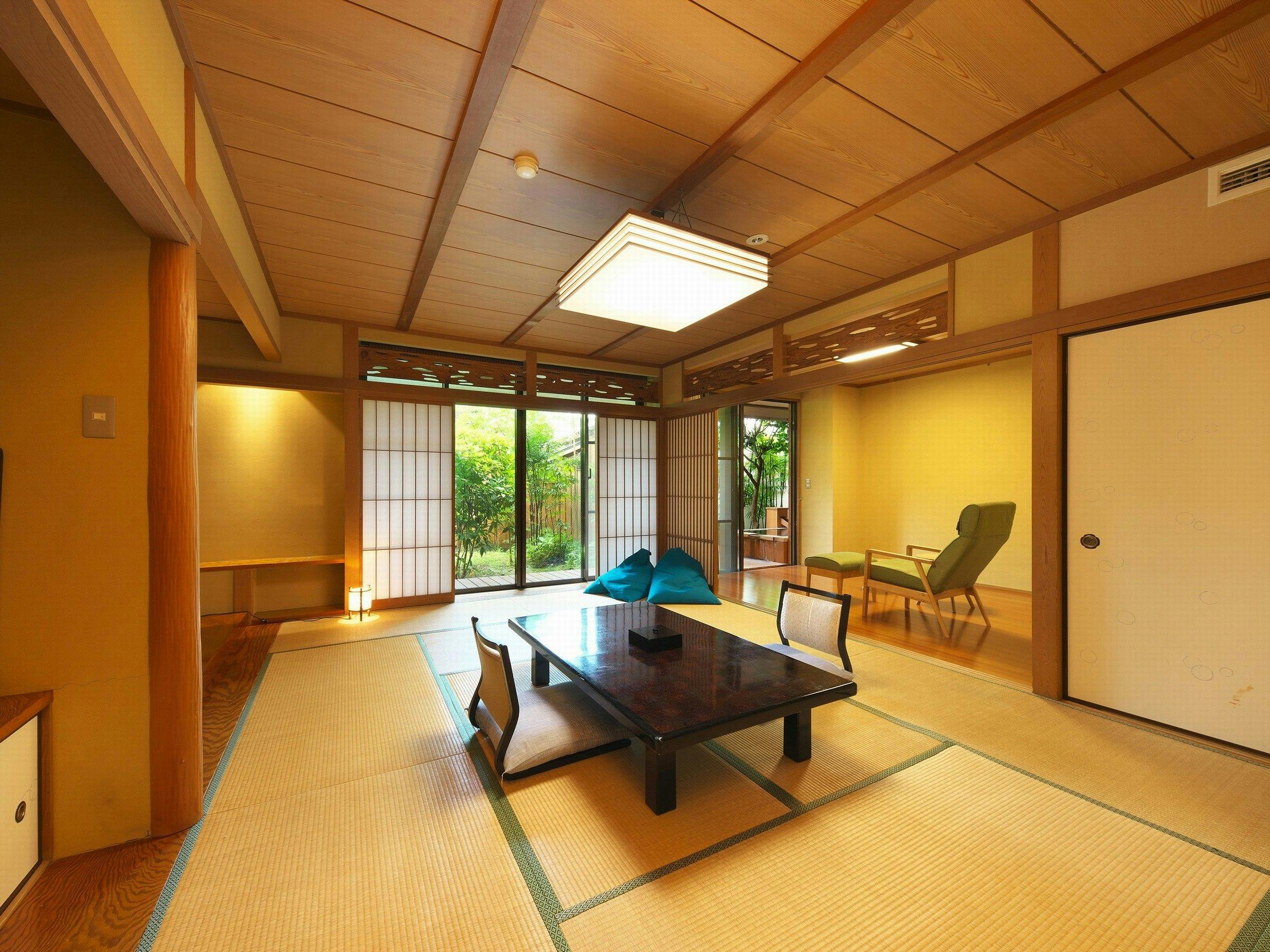 和室10帖+6帖の広さに露天風呂がついたお部屋です。夜はライトアップされた庭がとてもきれいに眺めることができるお部屋でございます。蓮台寺の情緒と当館自慢のお庭をゆっくりとお楽しみくださいませ。
