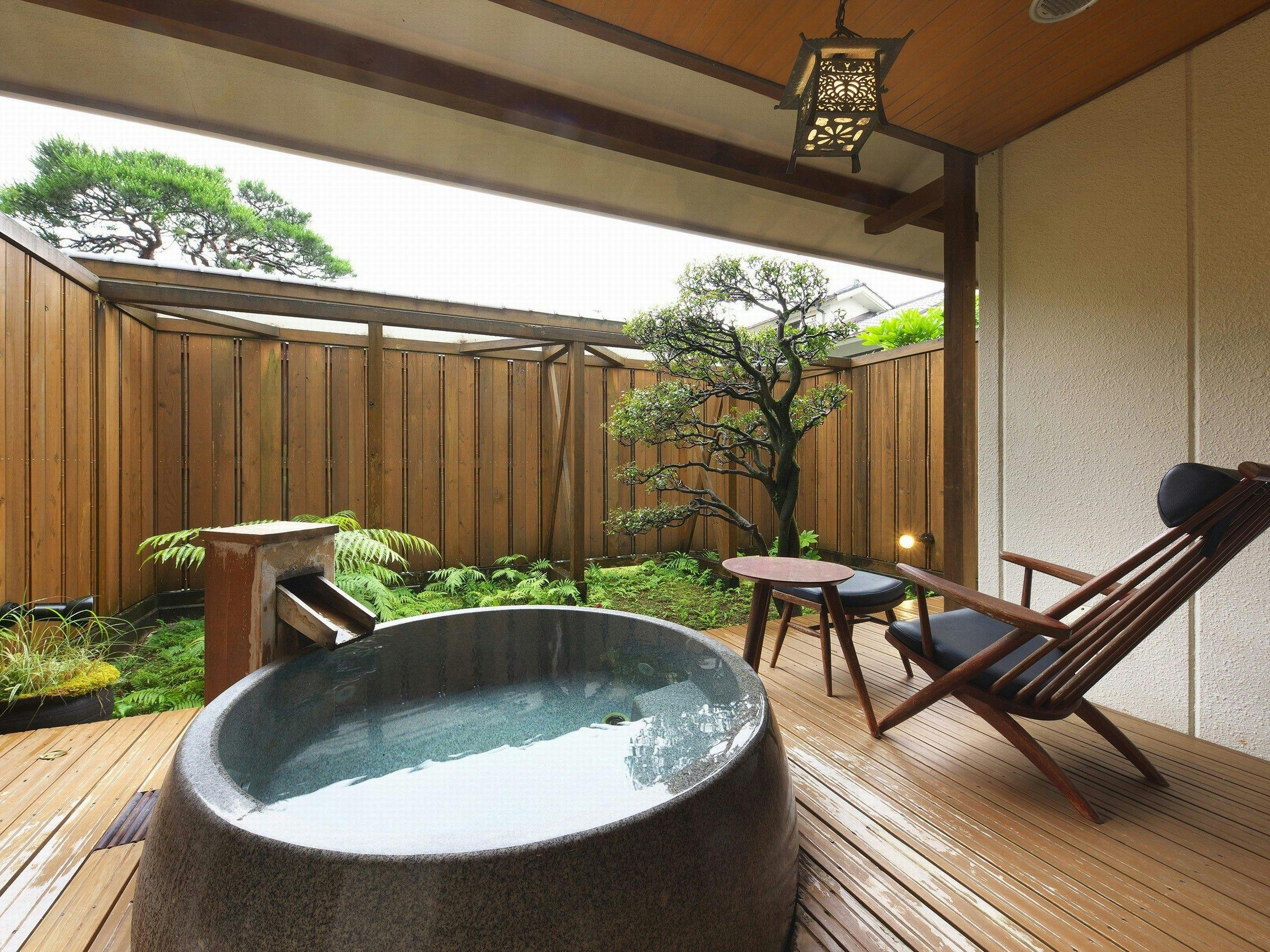 お部屋は広々お使いいただける90平米の広さ。お部屋には体に優しくフィットするシモンズ製和モダンベッドで質の高い睡眠をどうぞ。当館裏手から沸く源泉100%の温泉で贅沢な露天風呂客室でゆっくり快適にお過ごしになれます。