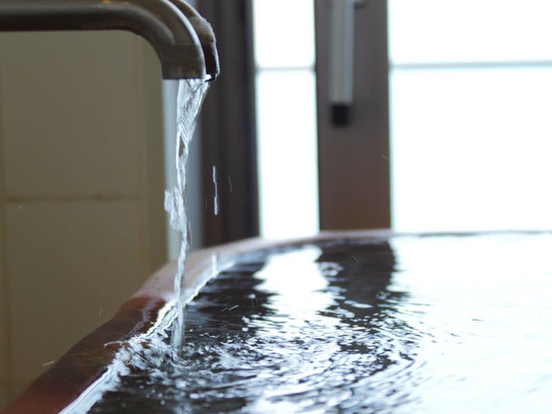 客室内のお風呂は、天井から床までの広い窓を開閉式にした、源泉掛け流しの半露天風呂。