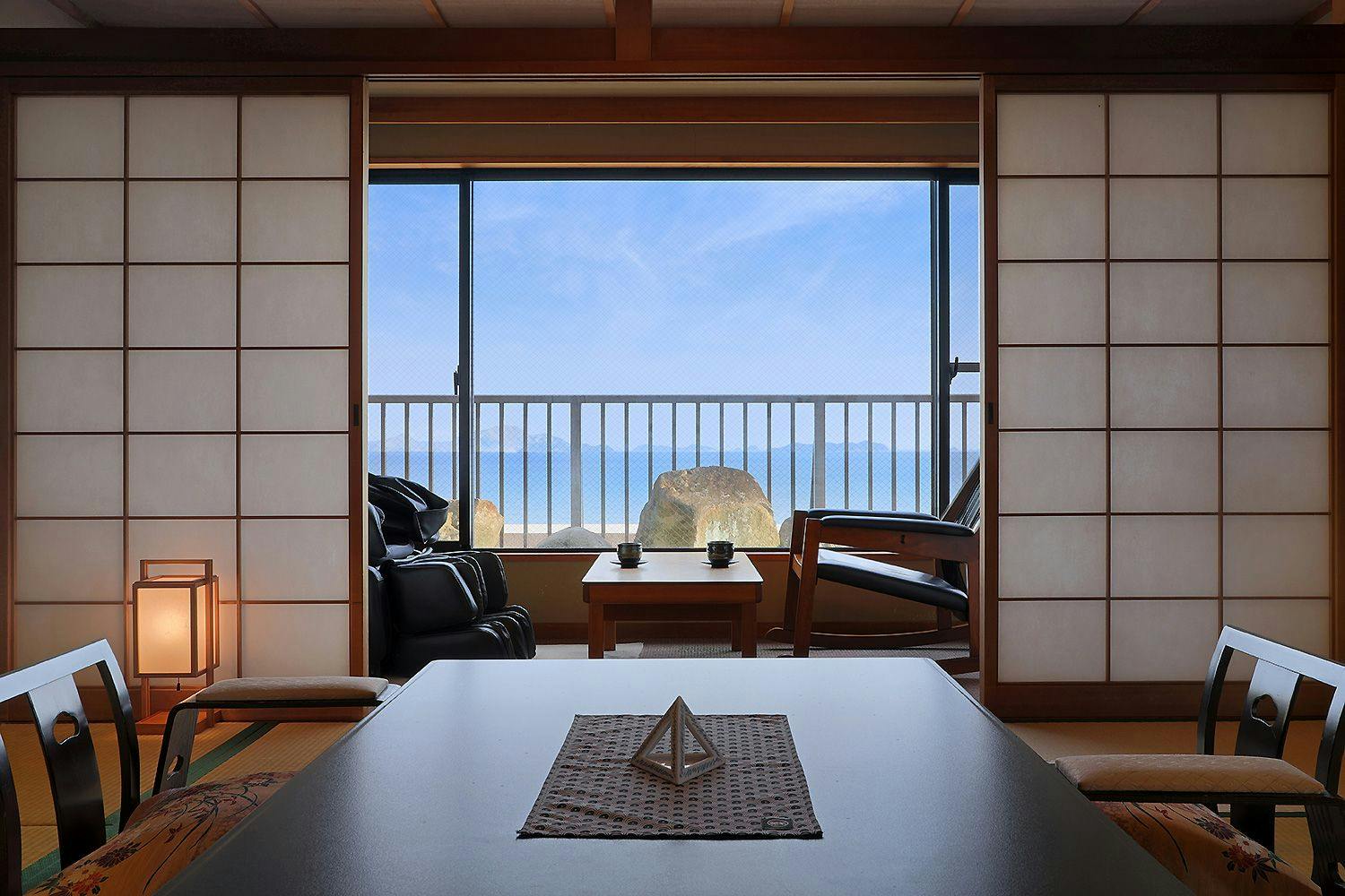 西面に向いたお部屋からは、瀬戸内の大パノラマが広がります。このお部屋は祥吉でも眺めが良いお部屋です!マッサージチェアも完備し、極上のリラクゼーションをお楽しみ下さい。そして、夕刻の夕陽のご鑑賞もお忘れなくお楽しみくださいませ。