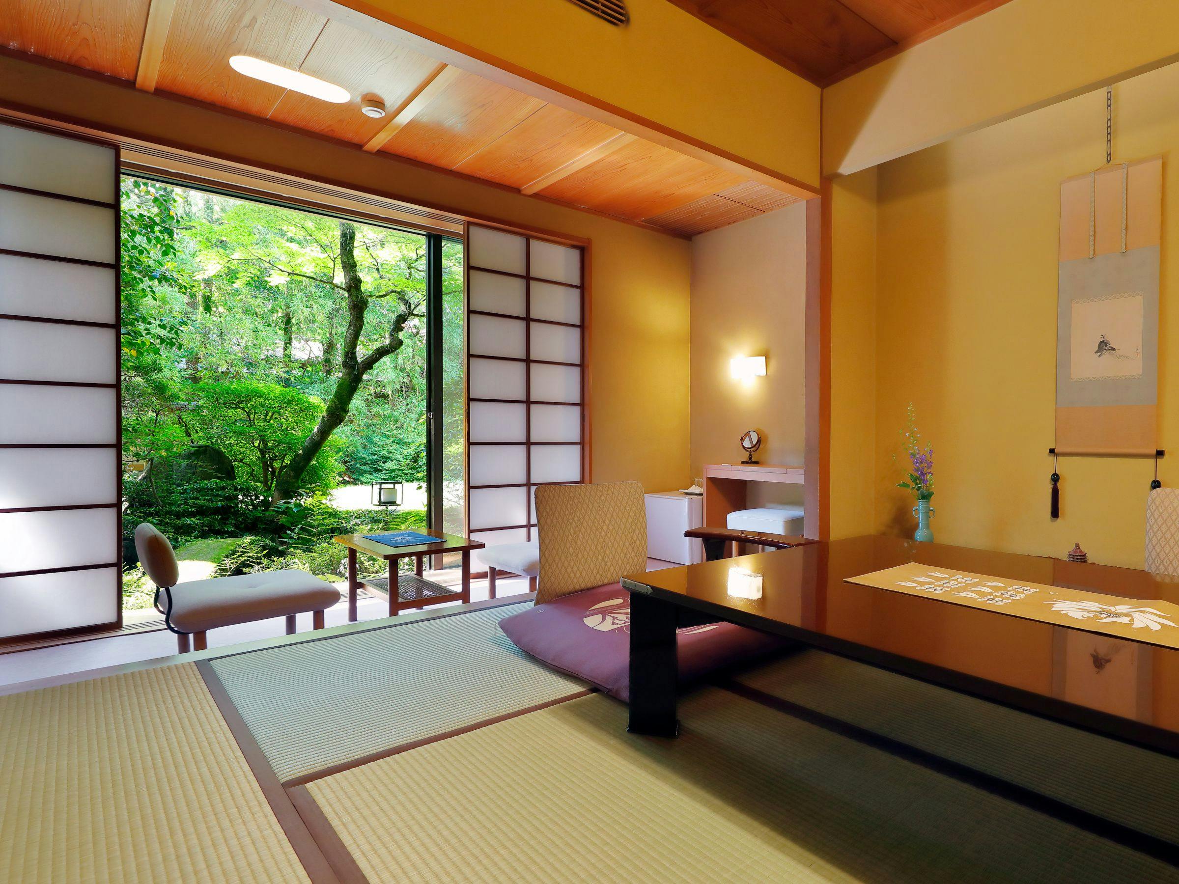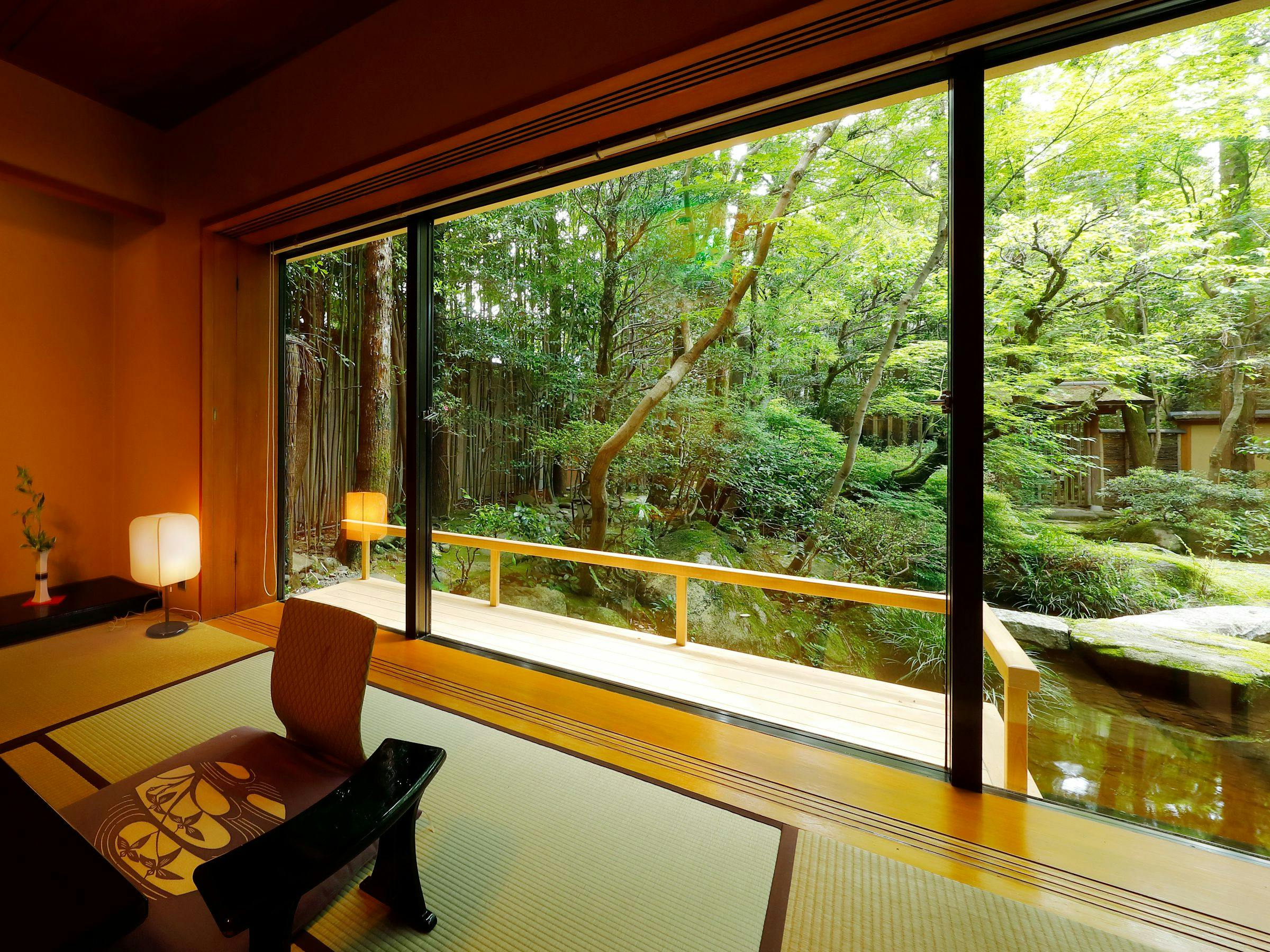 庭園を臨む一階の特室、和室の他に寝室も備えたお部屋。眼前に臨む庭園の池や木立との絶妙な距離感。和の趣き溢れる空間で寛ぎ時間を堪能できます。