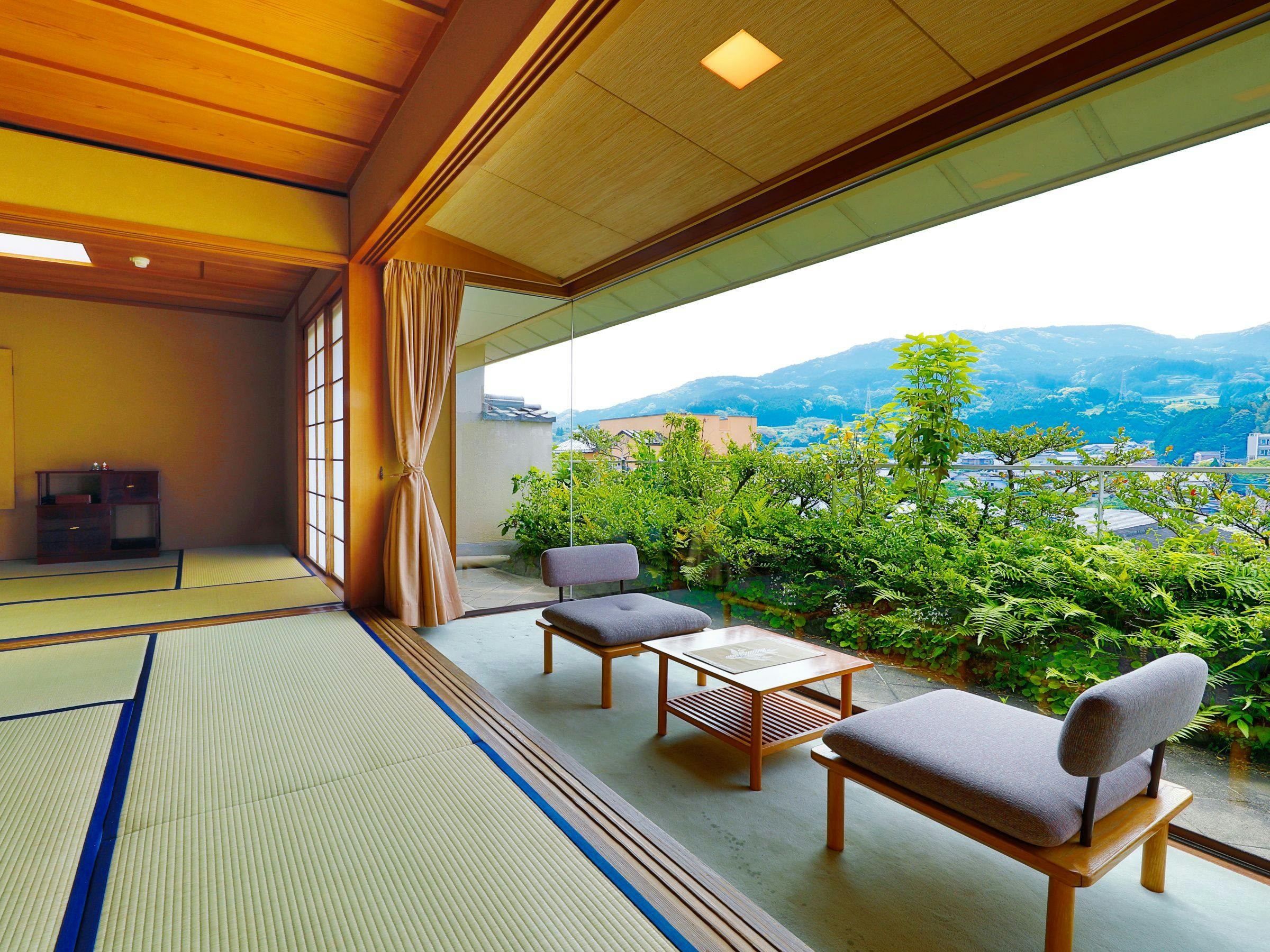 目の前に広がる景観に心癒される。杉木立の日本庭園を囲むように配置された旅館らしい風情の和室(1~2階)。夕暮れ時の庭園は旅館の風情を十分に満喫できるものと思います。※一部は8畳和室でございます。※客室風呂タイプの指定はできません。※階の指定はできません。
