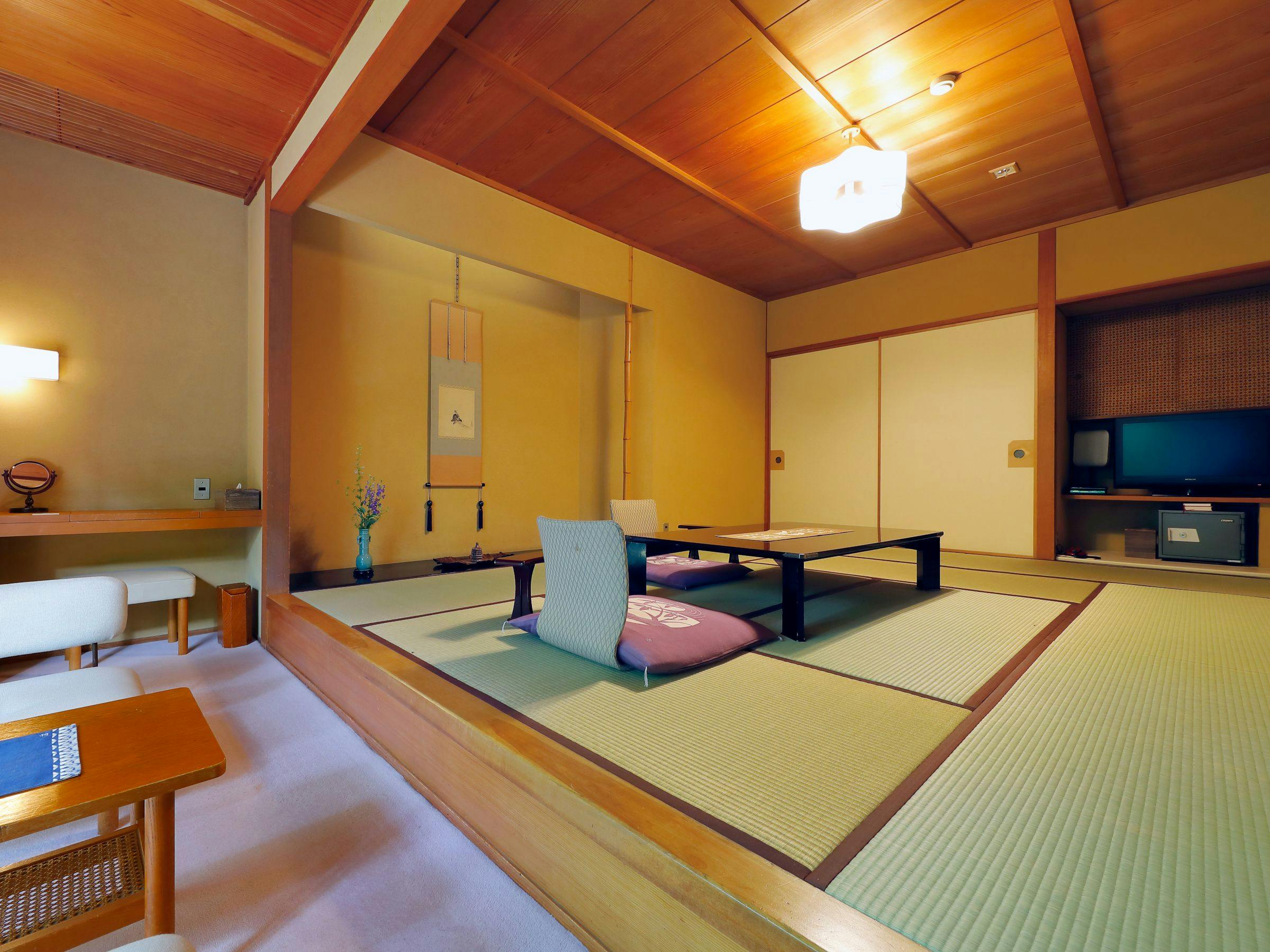 本館の和室10畳。玄関よりスロープでロビーへ、ロビーからエレベーターにて客室へお入りいただく事ができます。 高齢の方、車椅子ご利用のお客様も楽にチェックイン出来るお部屋です。 お部屋の内風呂にも源泉を引いておりますので、嬉野温泉美肌の湯をご堪能いただけます。