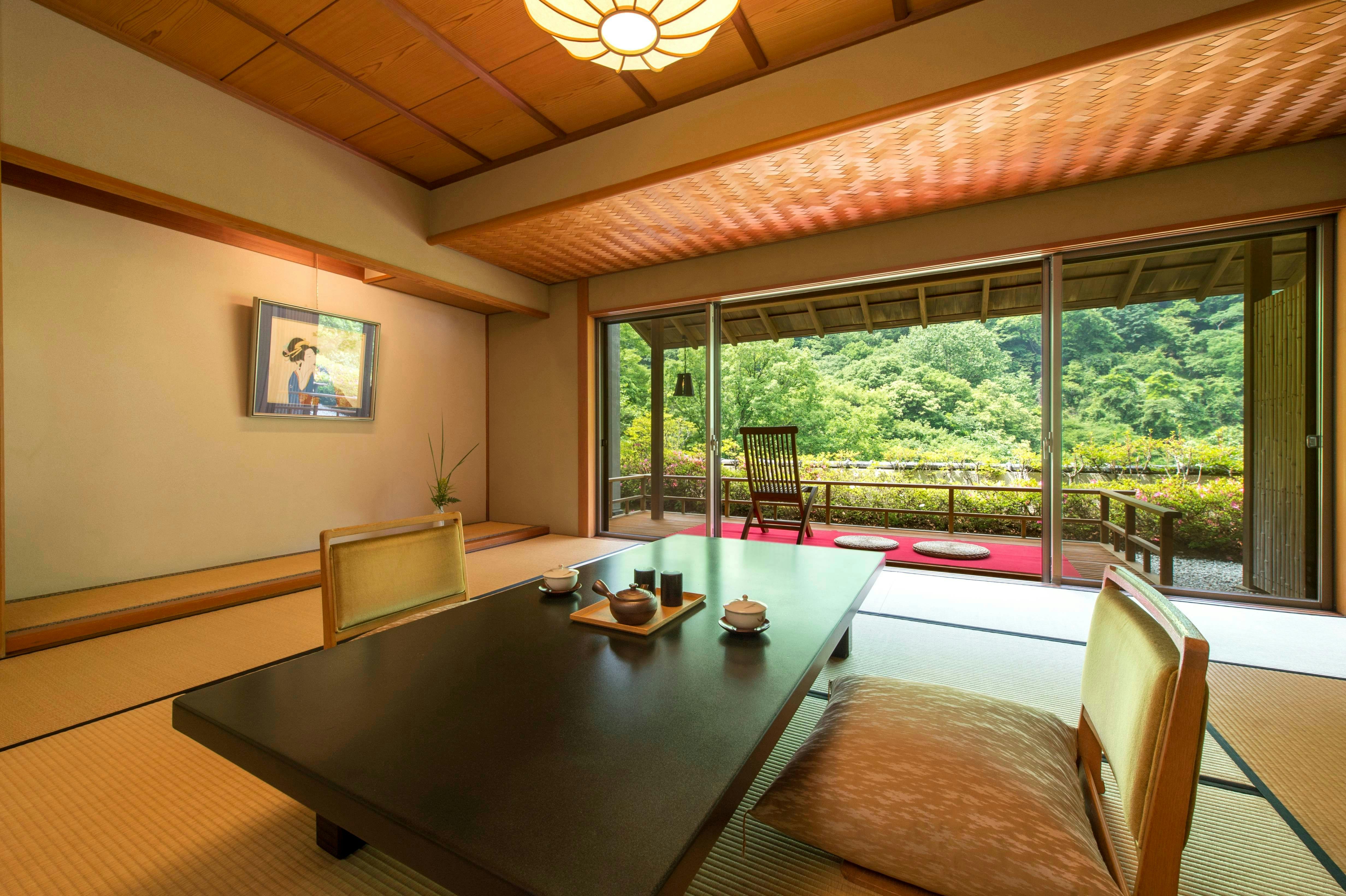 全室が渓谷に面し、低層の数寄屋造りの客室からは