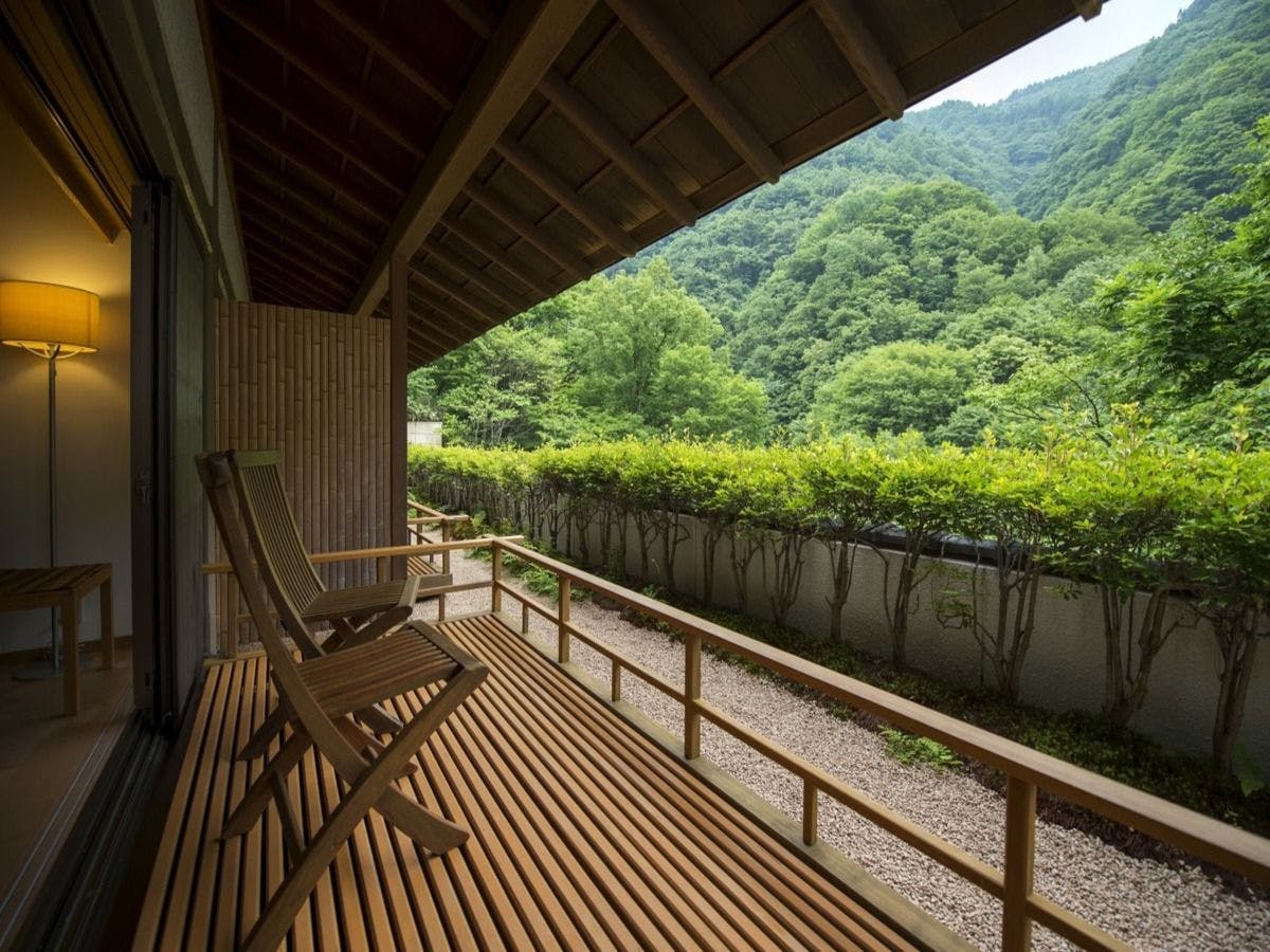 全室が渓谷に面し、低層の数寄屋造りの客室からは 戸外の自然との一体感をお楽しみいただけます。 また、渓谷に張り出した月見縁台からは、 緑萌える初夏から幻想的な月光や星降る夜、 そして雪化粧の木々などが手に届くほどに美しく、 信州の絶景を存分にご体感いただけます。