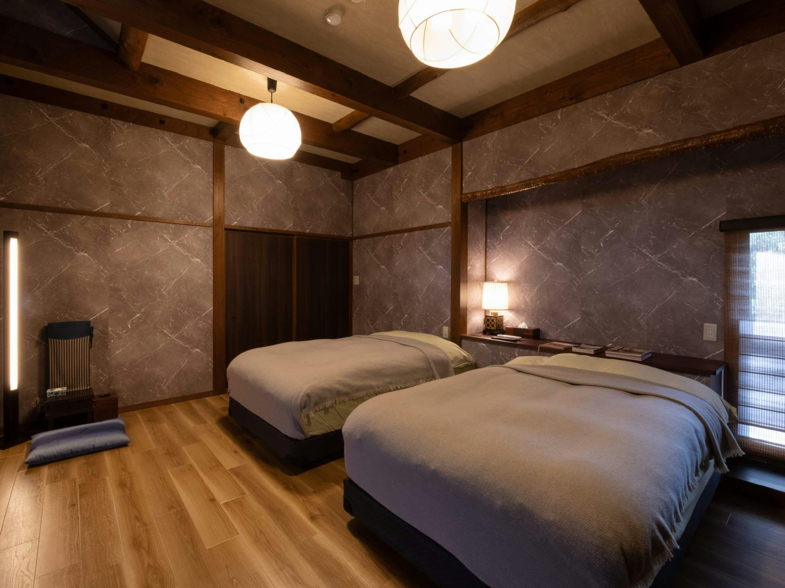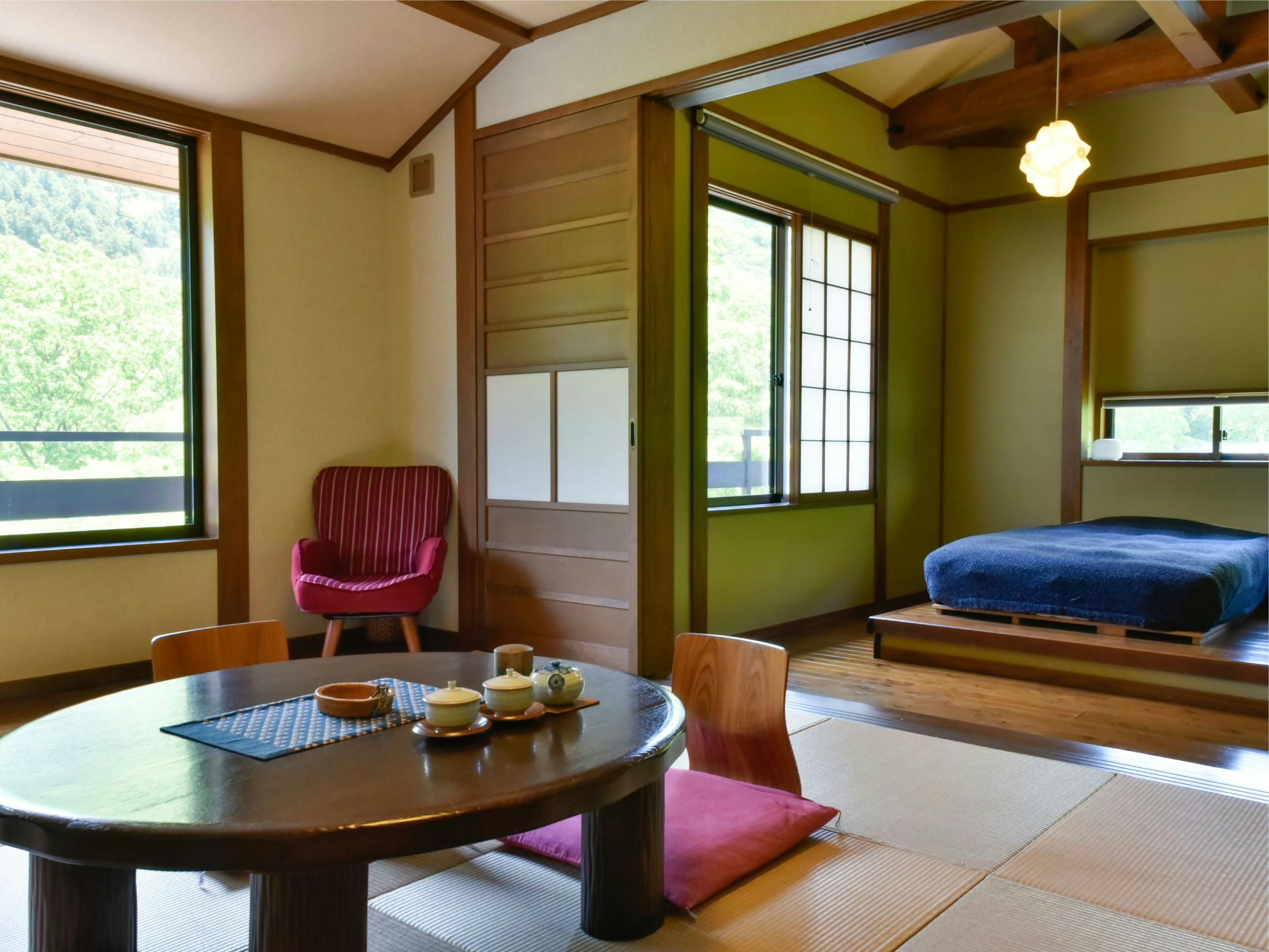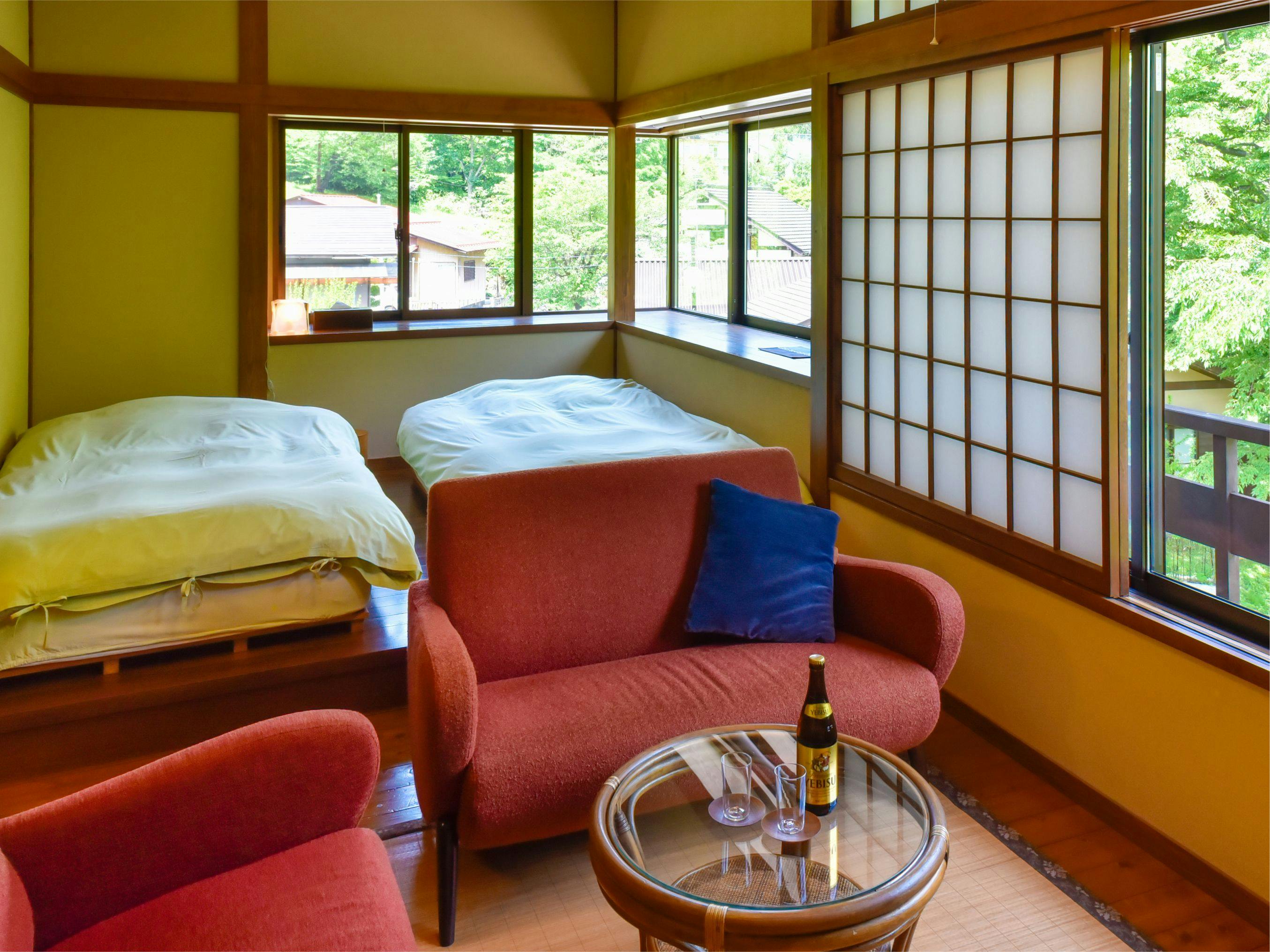 洋室10畳、和室8畳、露天風呂、トイレ、洗面、ミニキッチン洋室にセミダブル2台ございます。3名様ご利用の場合、シングルベッドを1台置かせていただき、4名様目は和室にお布団を敷かせていただきます。緑に囲まれた離れはプライベートを重視し、お客様だけの静かな時をご提供致します。※当館は全室禁煙室となっております。本館一階にございます喫煙室、または外での喫煙をお願いいたします。離れにございます露天風呂での喫煙もご遠慮くださいませ。