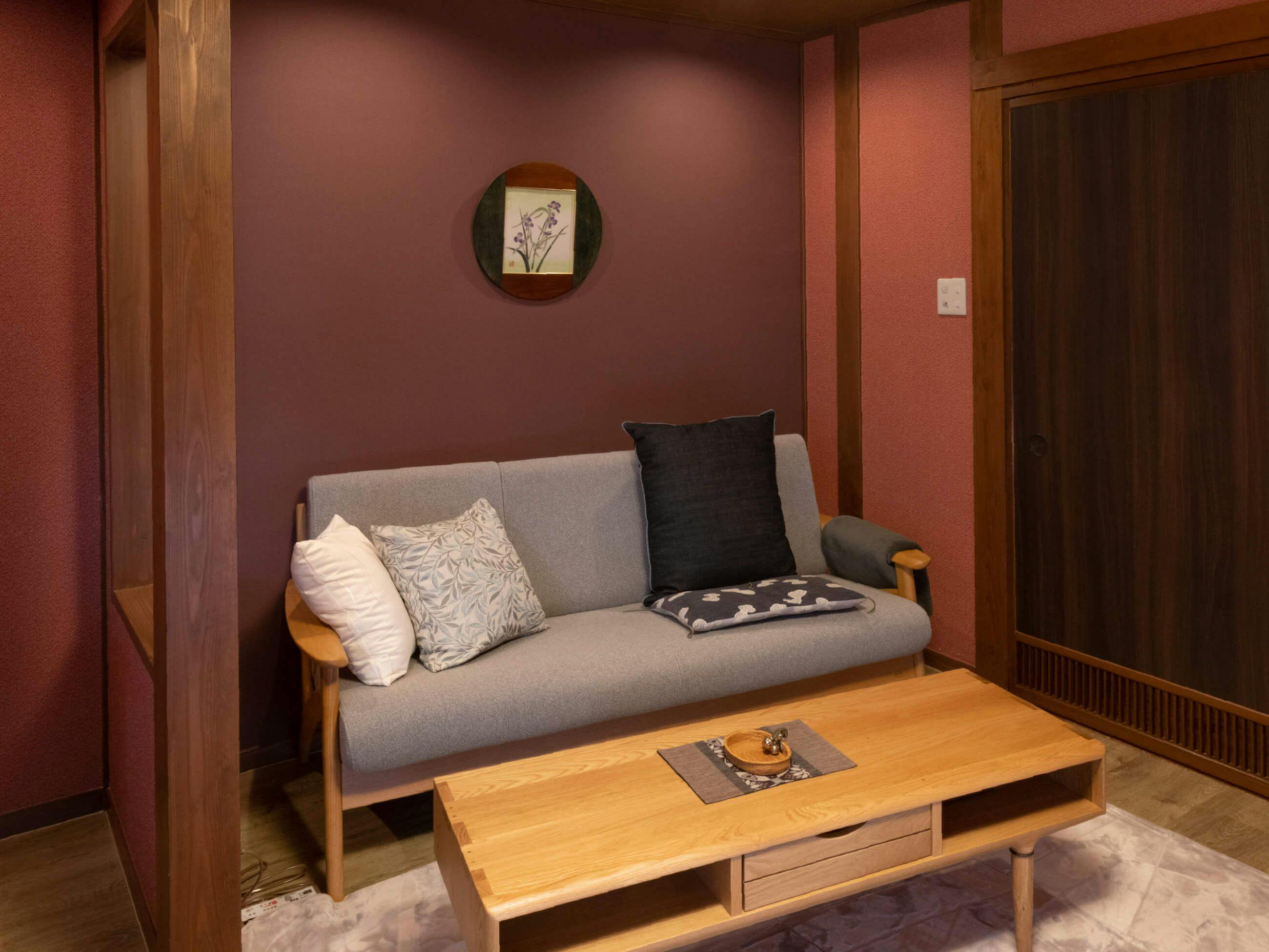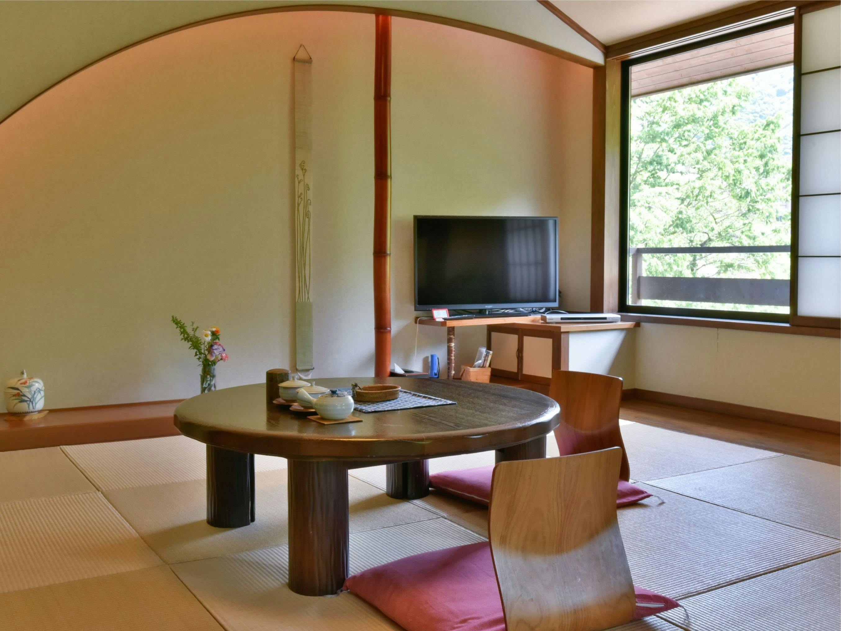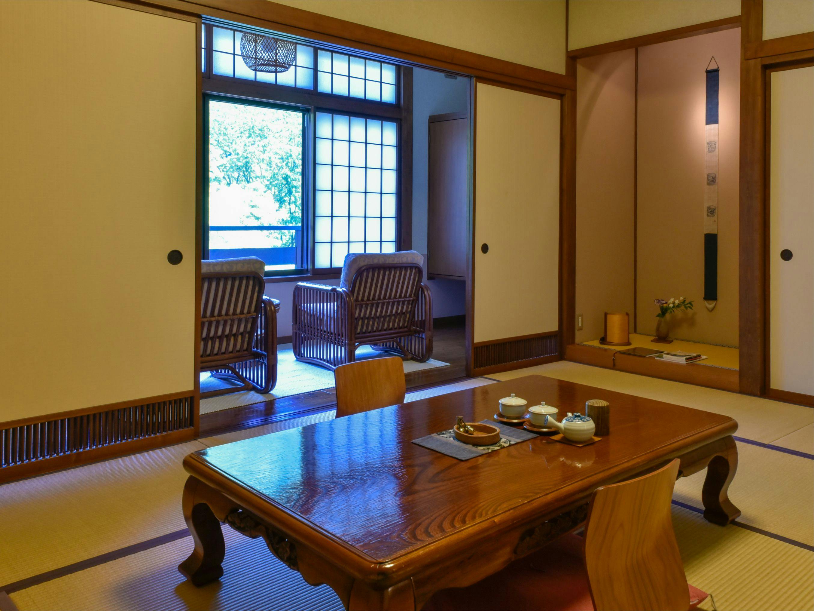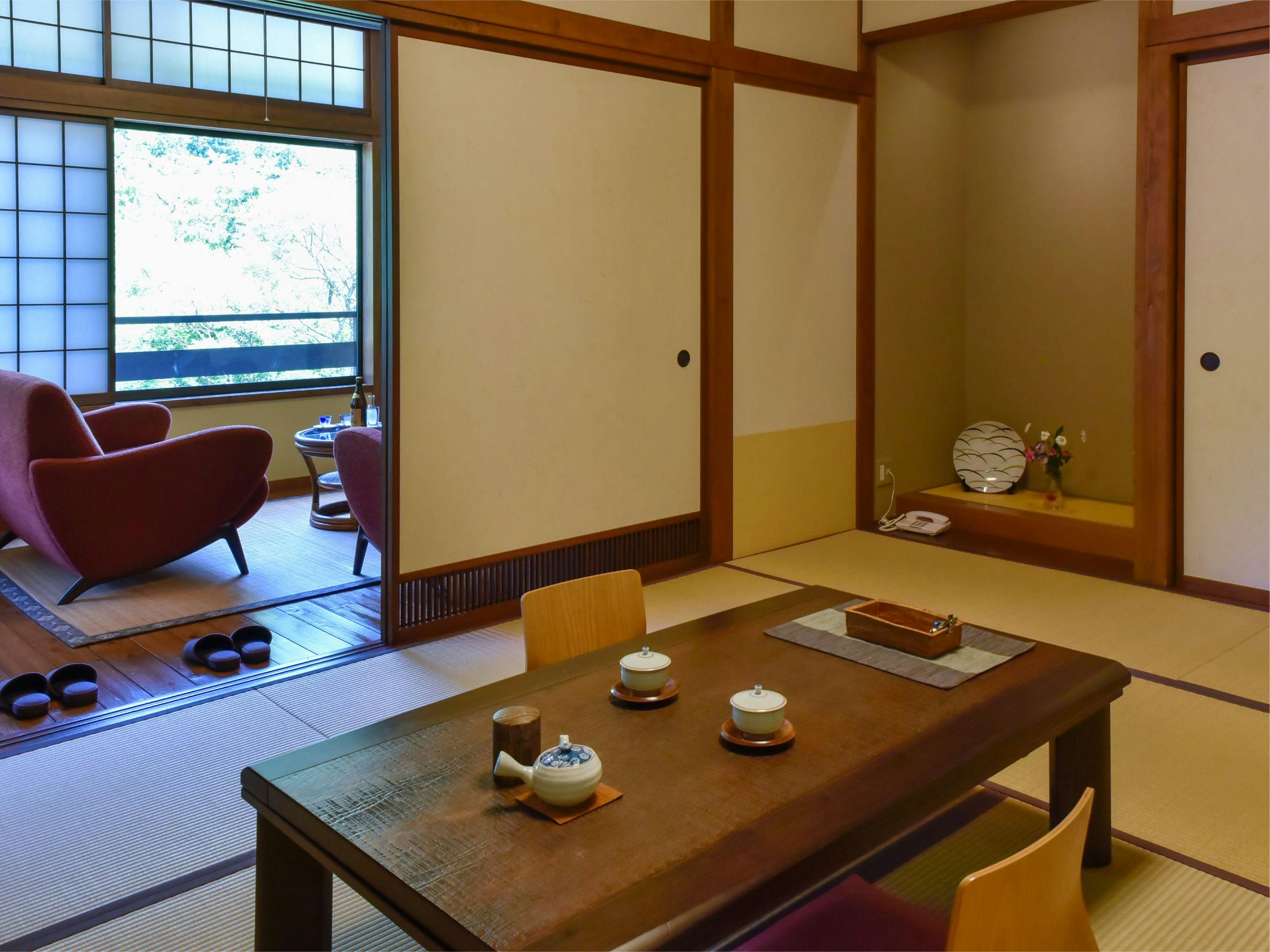和室10畳、広縁4畳、パウダースペース、トイレ、洗面、ミニキッチン広縁のソファで窓の外に広がる四季折々の景色をお楽しみ頂ける眺めの良い和室です。※当館は全室禁煙室となっております。本館一階にございます喫煙室、または外での喫煙をお願いいたします。
