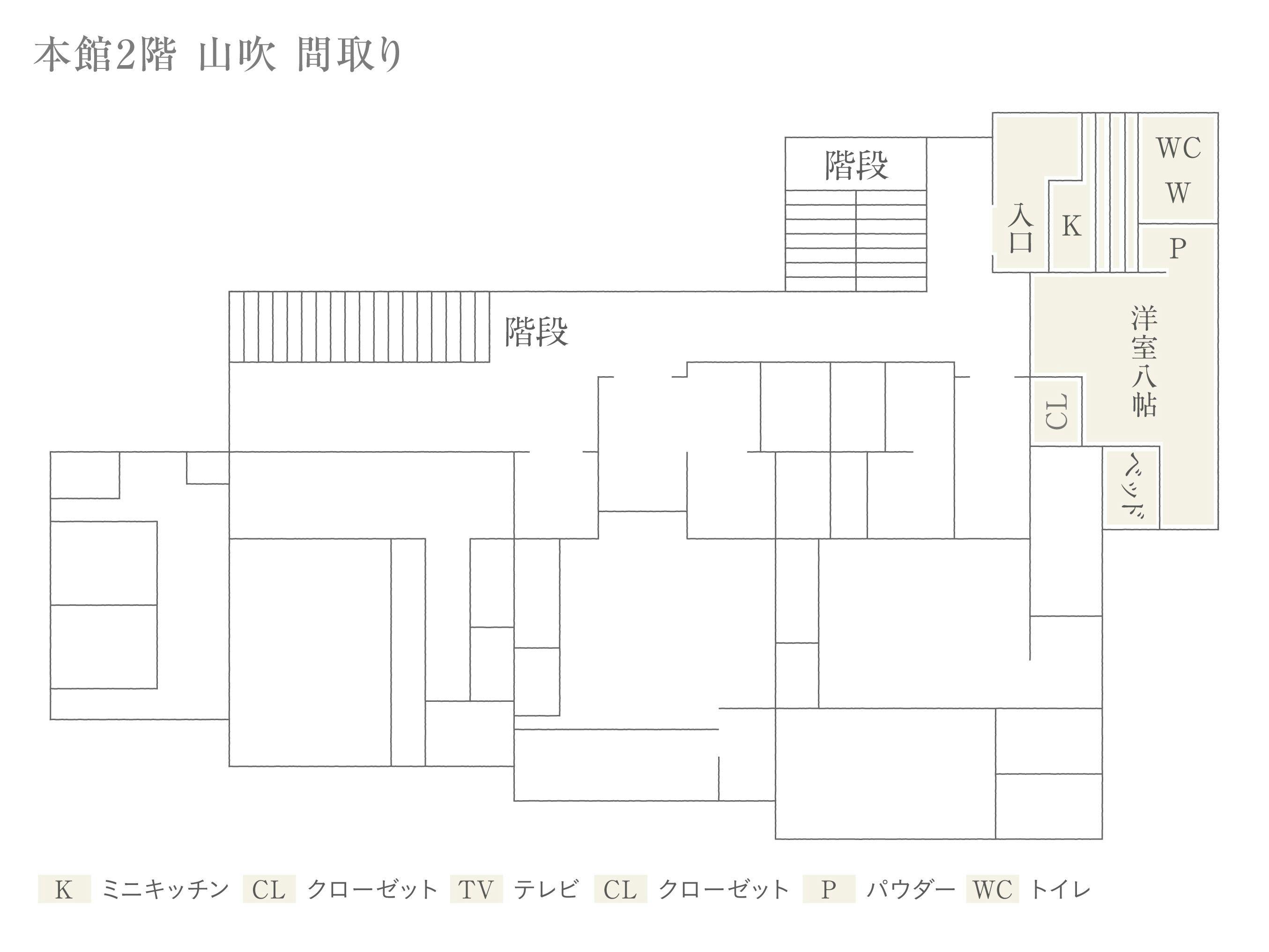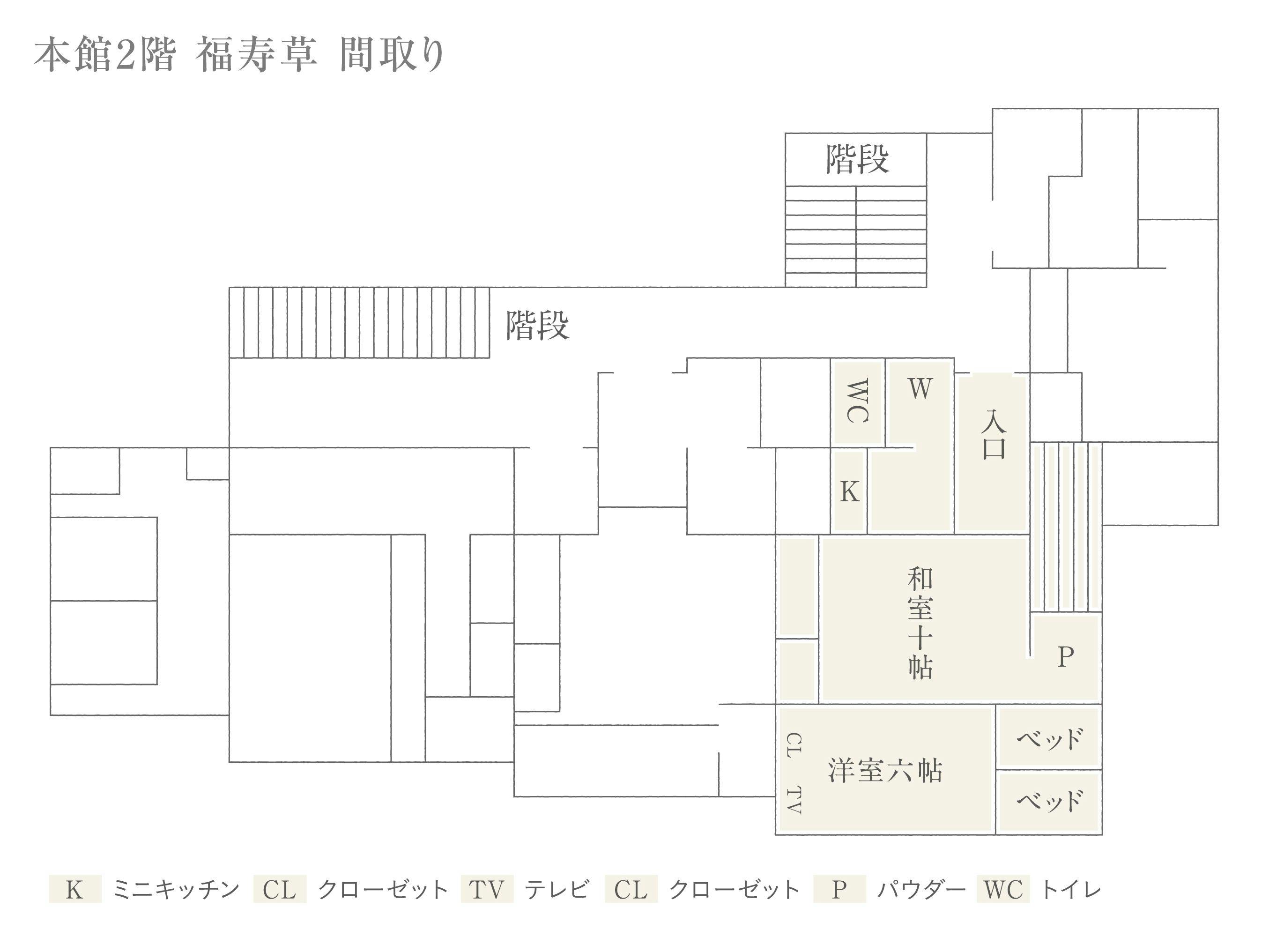 和室10畳、洋室6畳、ベッドスペース3畳、パウダースペース、トイレ、洗面、ミニキッチン2階角部屋で窓も大きく開放感のある和洋室でゆったりとおくつろぎ頂けます。※当館は全室禁煙室となっております。本館一階にございます喫煙室、または外での喫煙をお願いいたします。