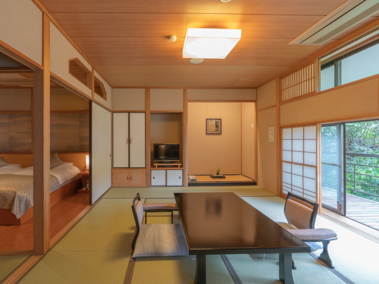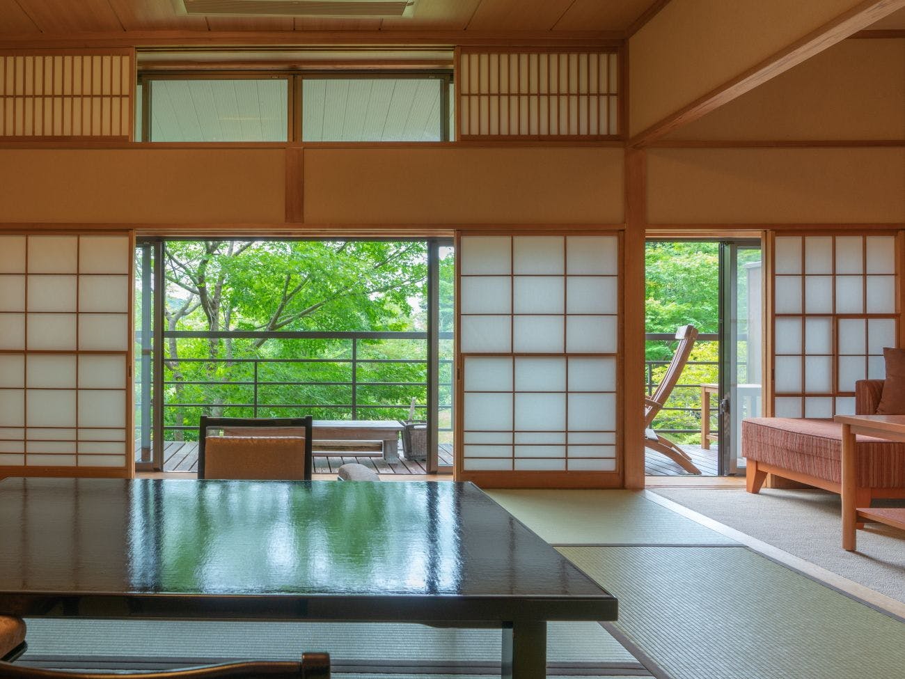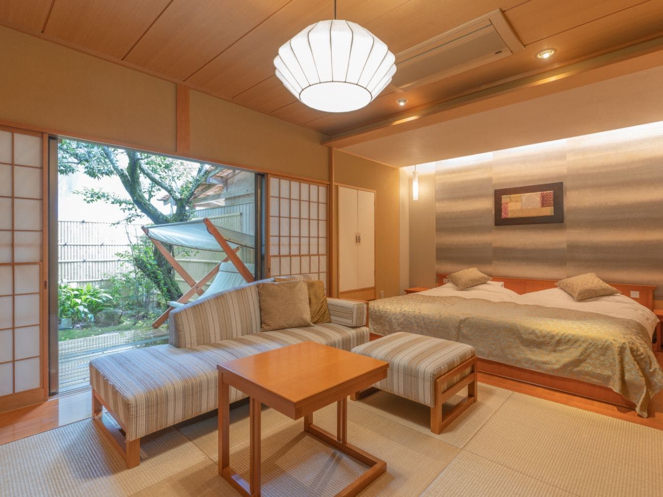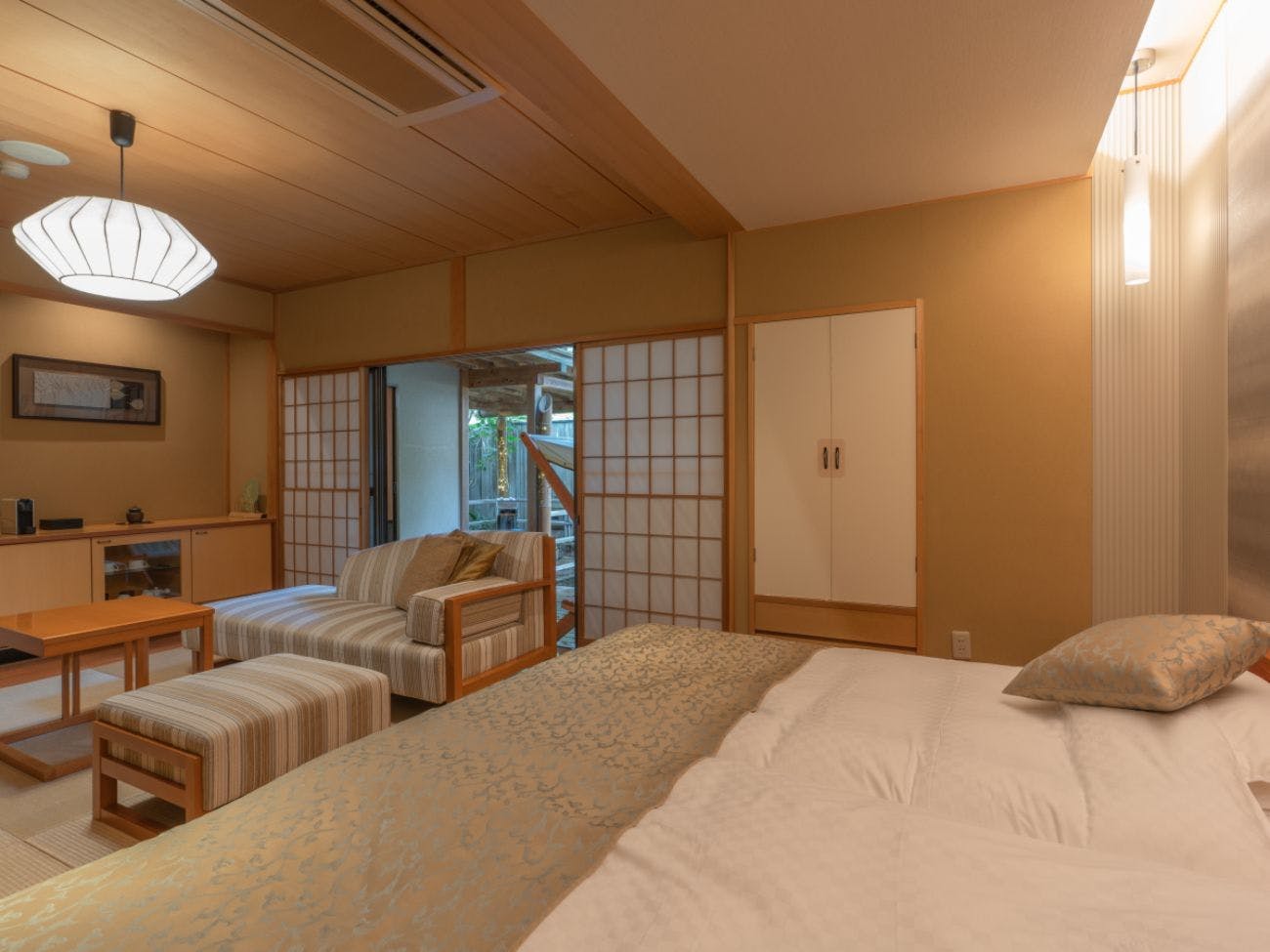 床の間や座卓座椅子が備えついている八帖和室。露天風呂と縁側を完備しており、約二十平米の緑が溢れる個別庭園。