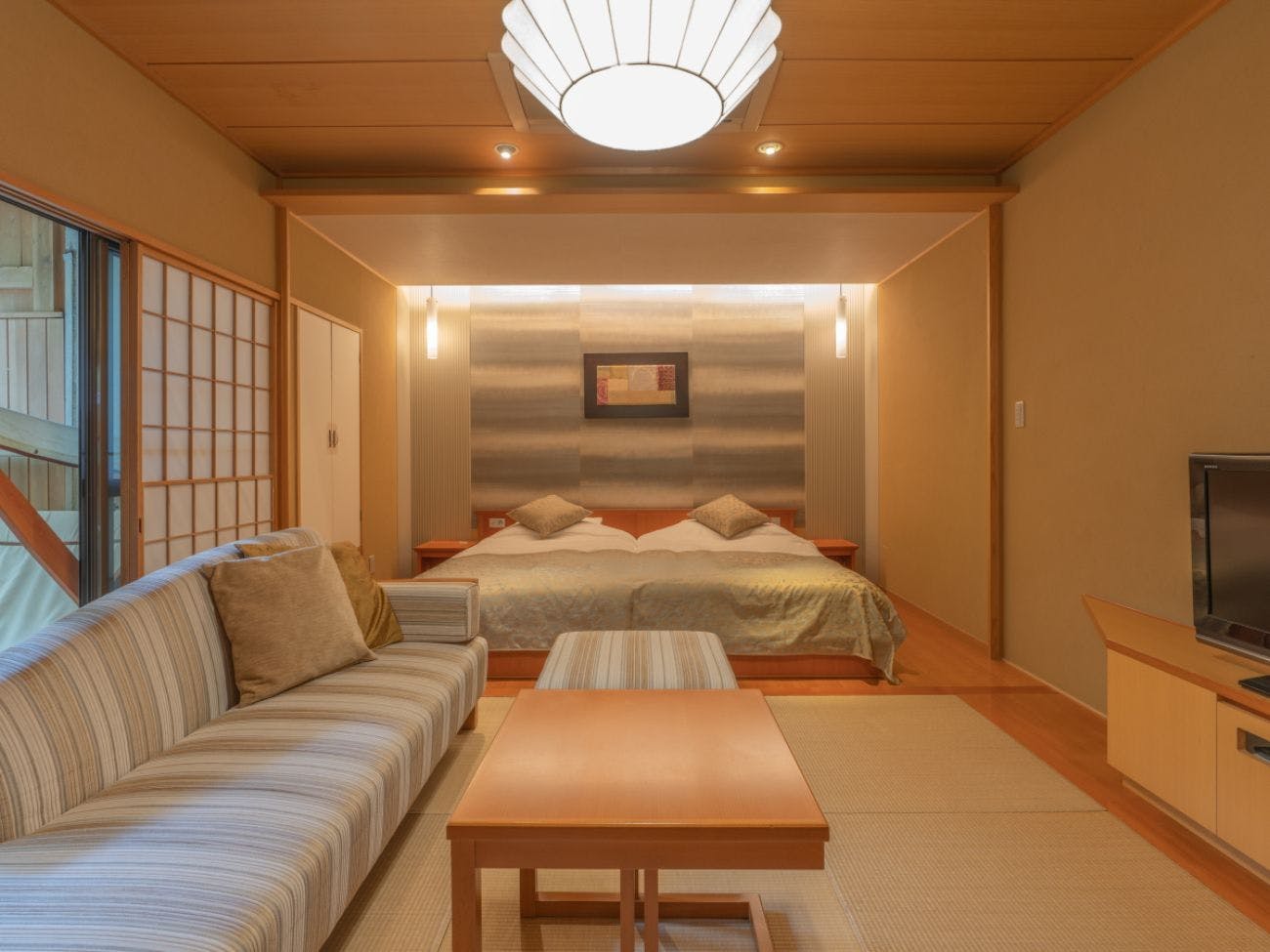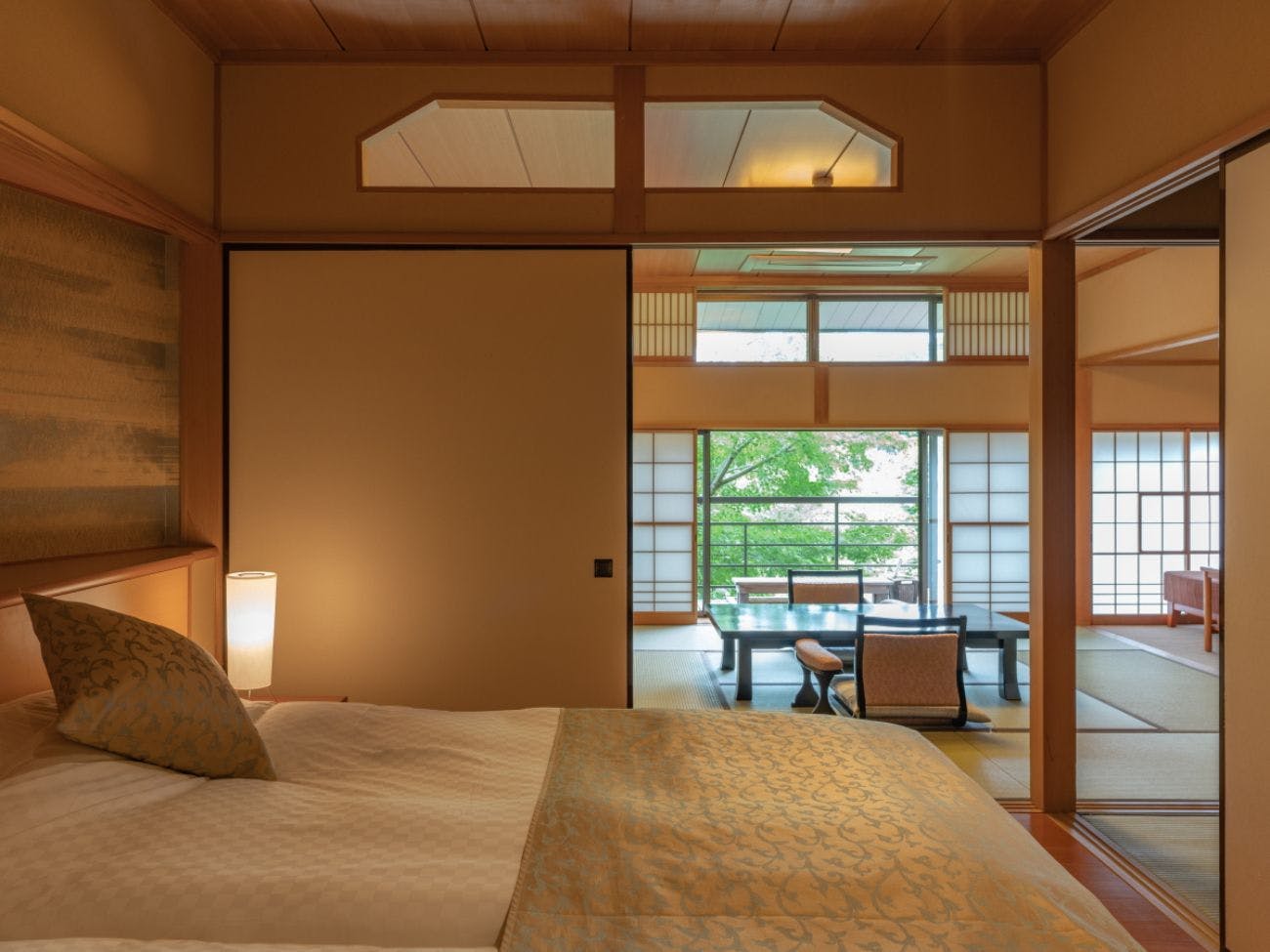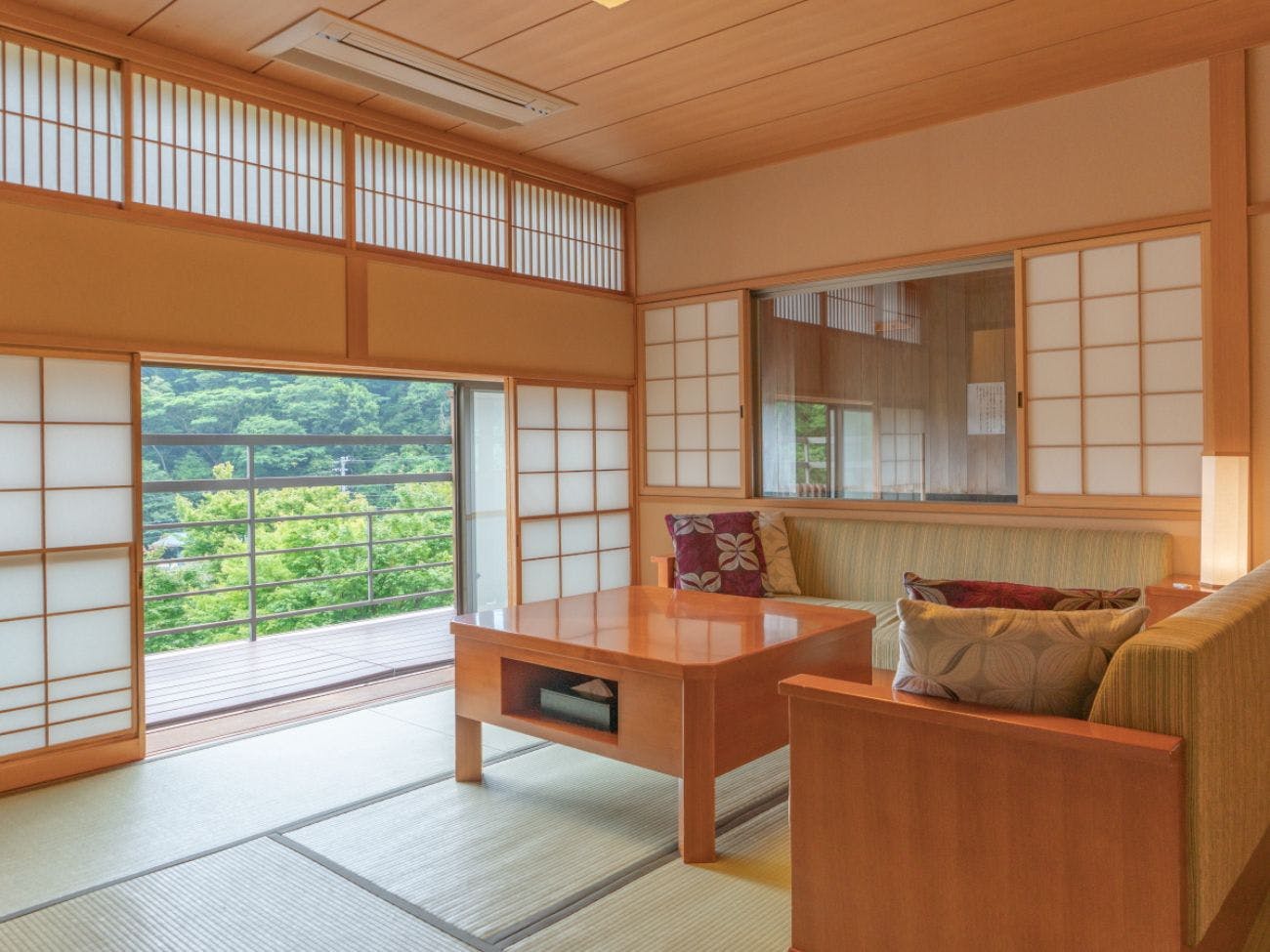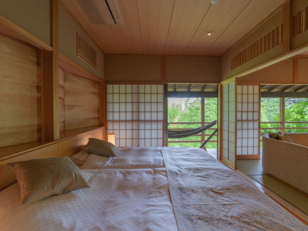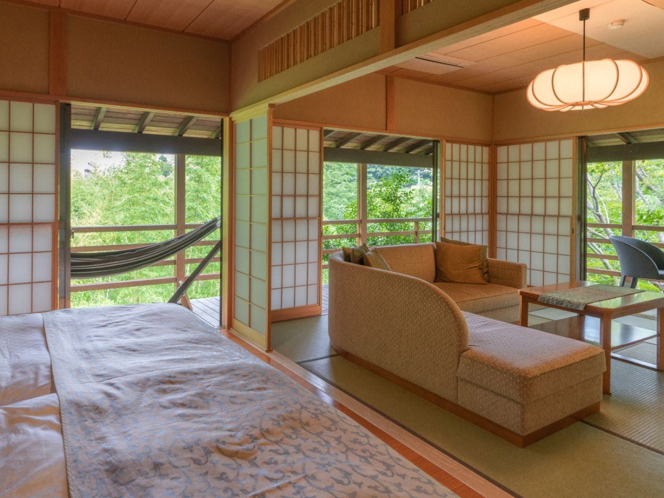 床の間や座卓座椅子が備えついている八帖和室。露天風呂と縁側を完備しており、約二十平米の緑が溢れる個別庭園。