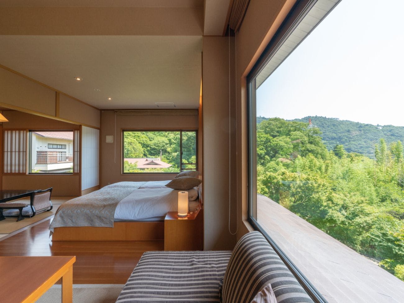 自然を眺めるだけではなく身をその中へ。四季折々に衣を変える和風庭園、竹林庭園内の径の散策、自家源泉からの掛け流し。郷愁と優美を感じられる人里離れた13部屋の湯宿。目と舌で愉しめる伊豆料理を心ゆくまで。