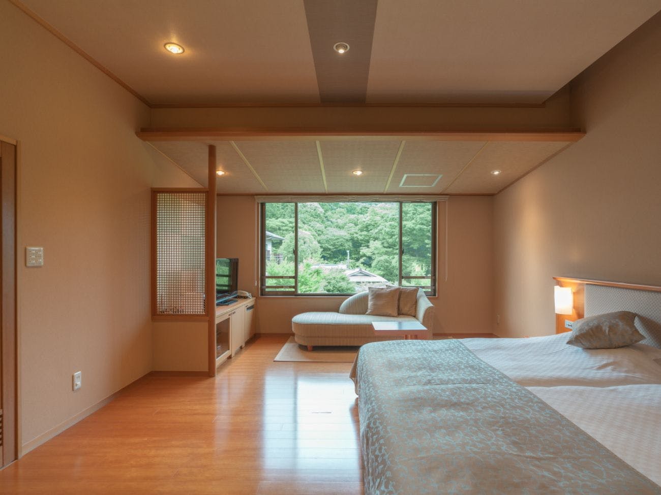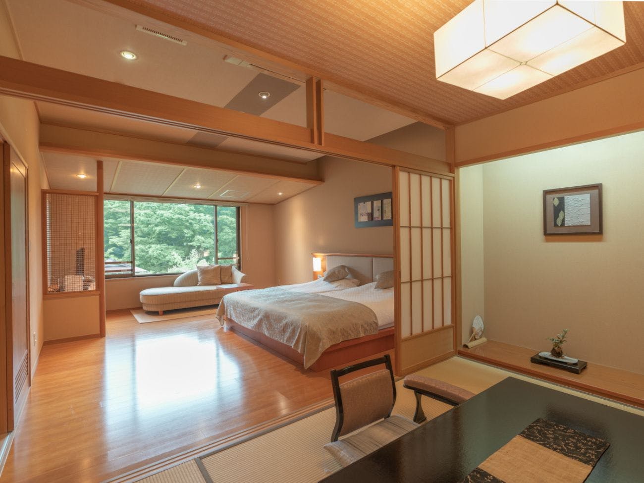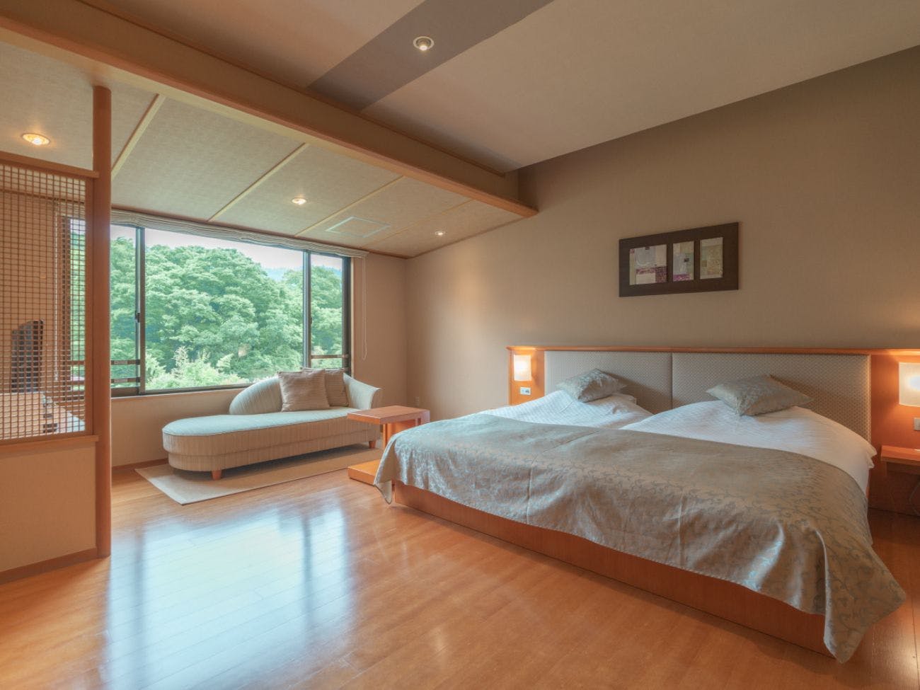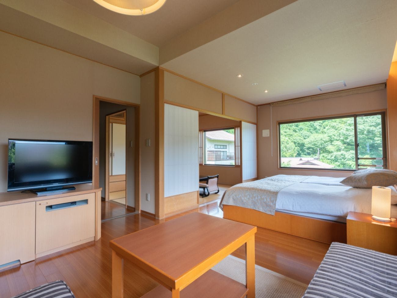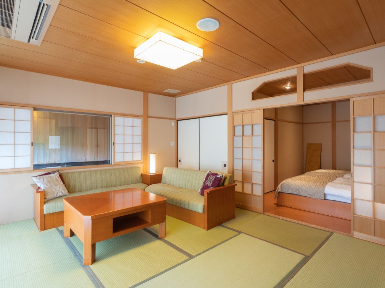 当館で唯一源泉掛流しの足湯が愉しめる、広々とした1階和洋室でございます。