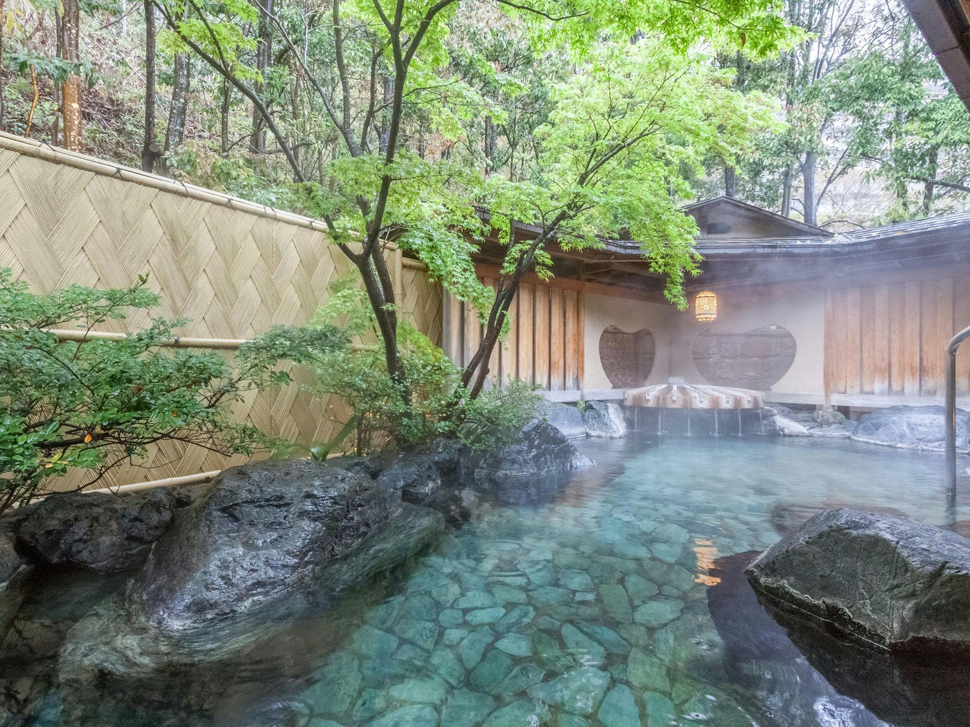 全15室からなる露天風呂付客室は格天井の寝室、聚楽塗り壁など日本の建築美を極めたおもてなしの空間。お部屋からは広々とした森林を眺められ優雅なお時間をお過ごしいただけます。客室露天風呂に注ぐ湯には、他に類を見ない海洋深層水の濃縮水を贅沢に完全かけ流しで使用。