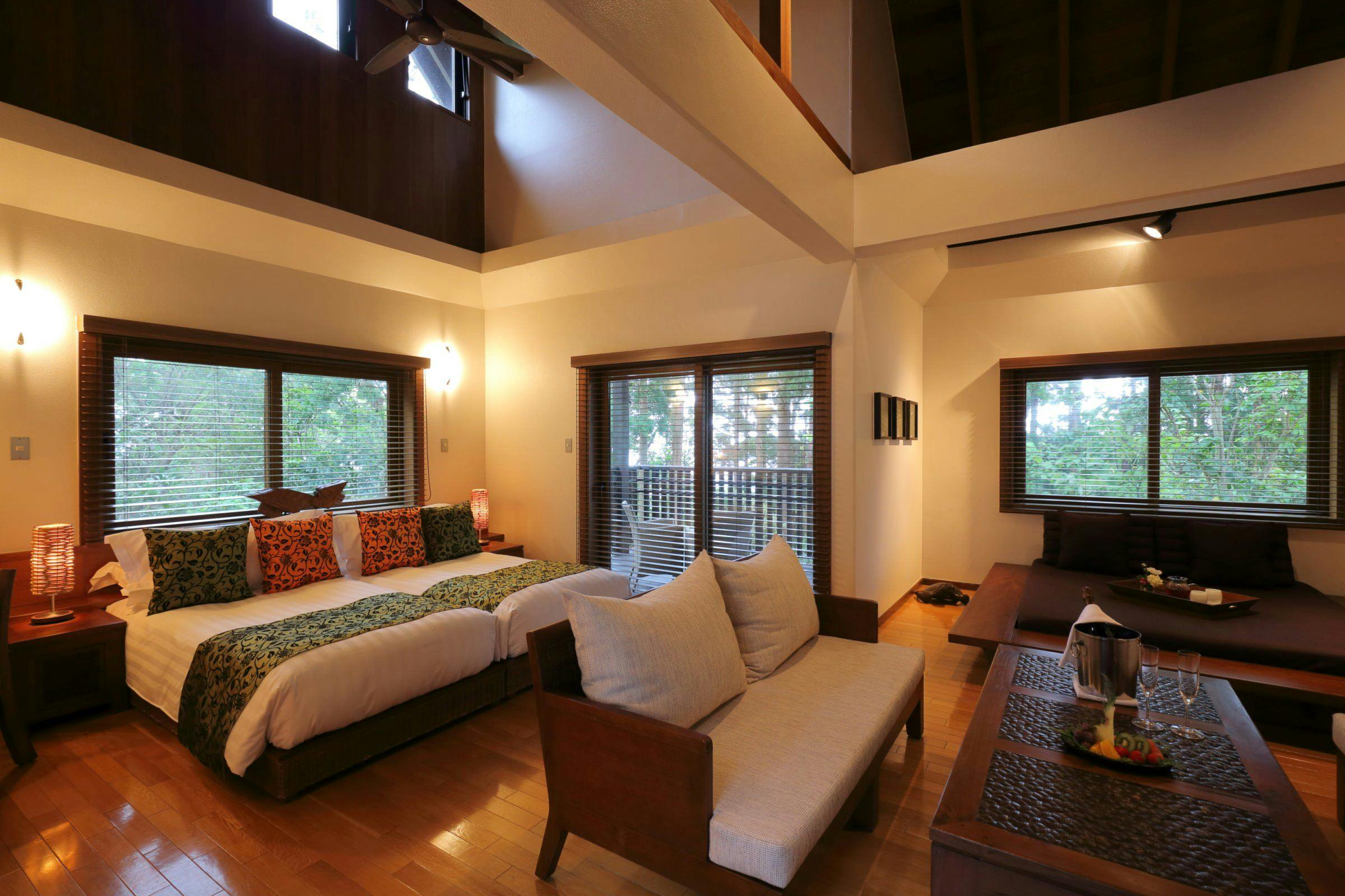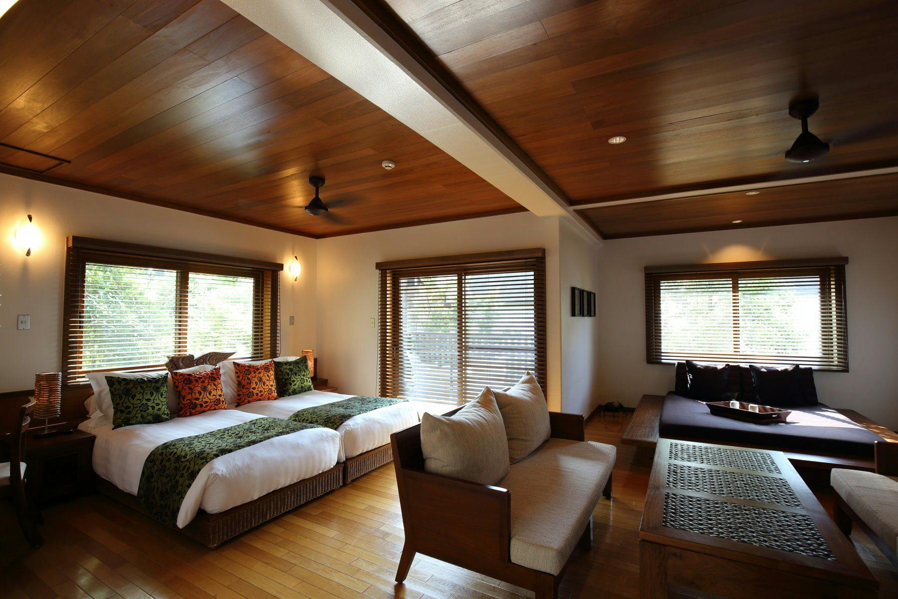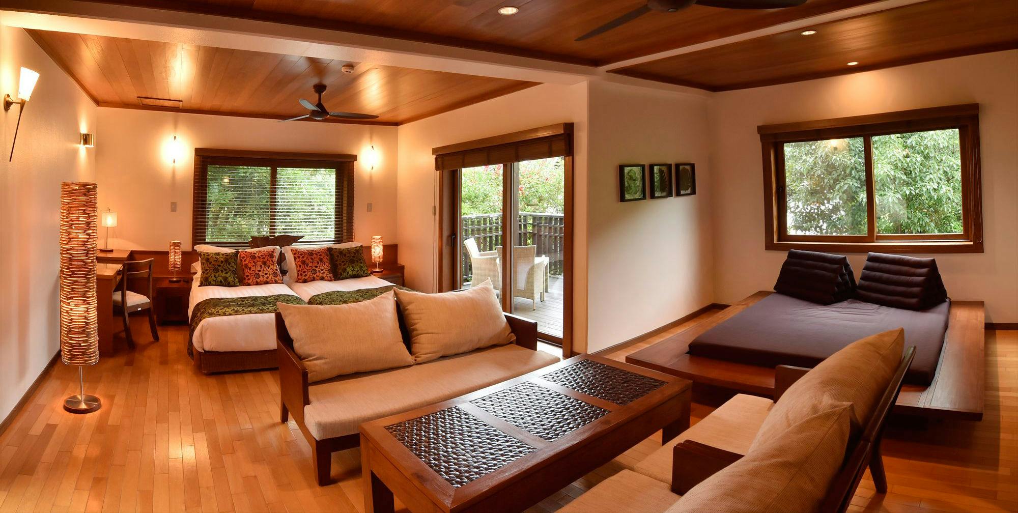 ハリウッドツインのベッド、多目的スペースを備え、テラスからは大自然をご満喫いただけます。