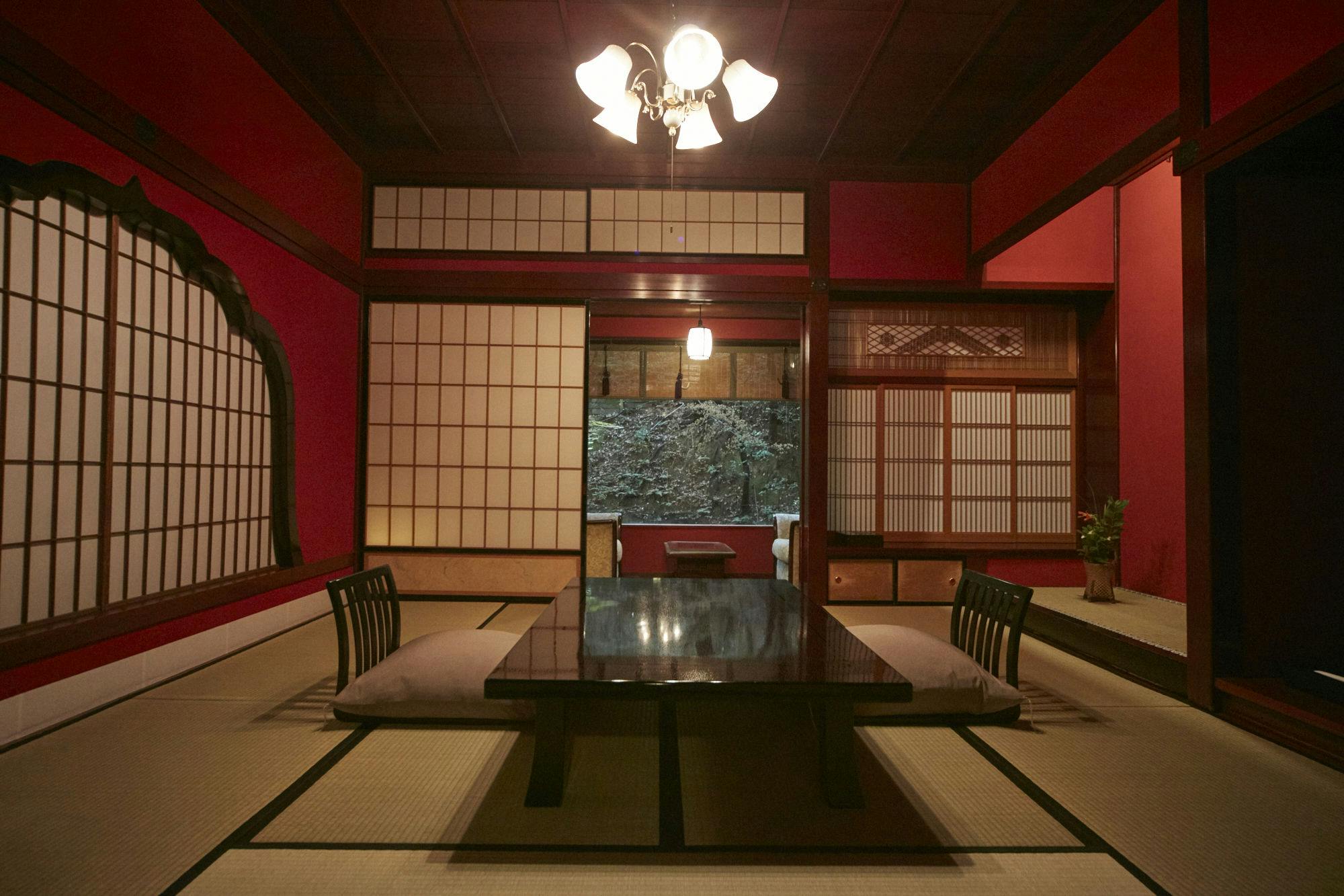 漆を施した柱と加賀ならではの朱壁が織り成す独特の雰囲気で北大路魯山人も好んで逗留しました。