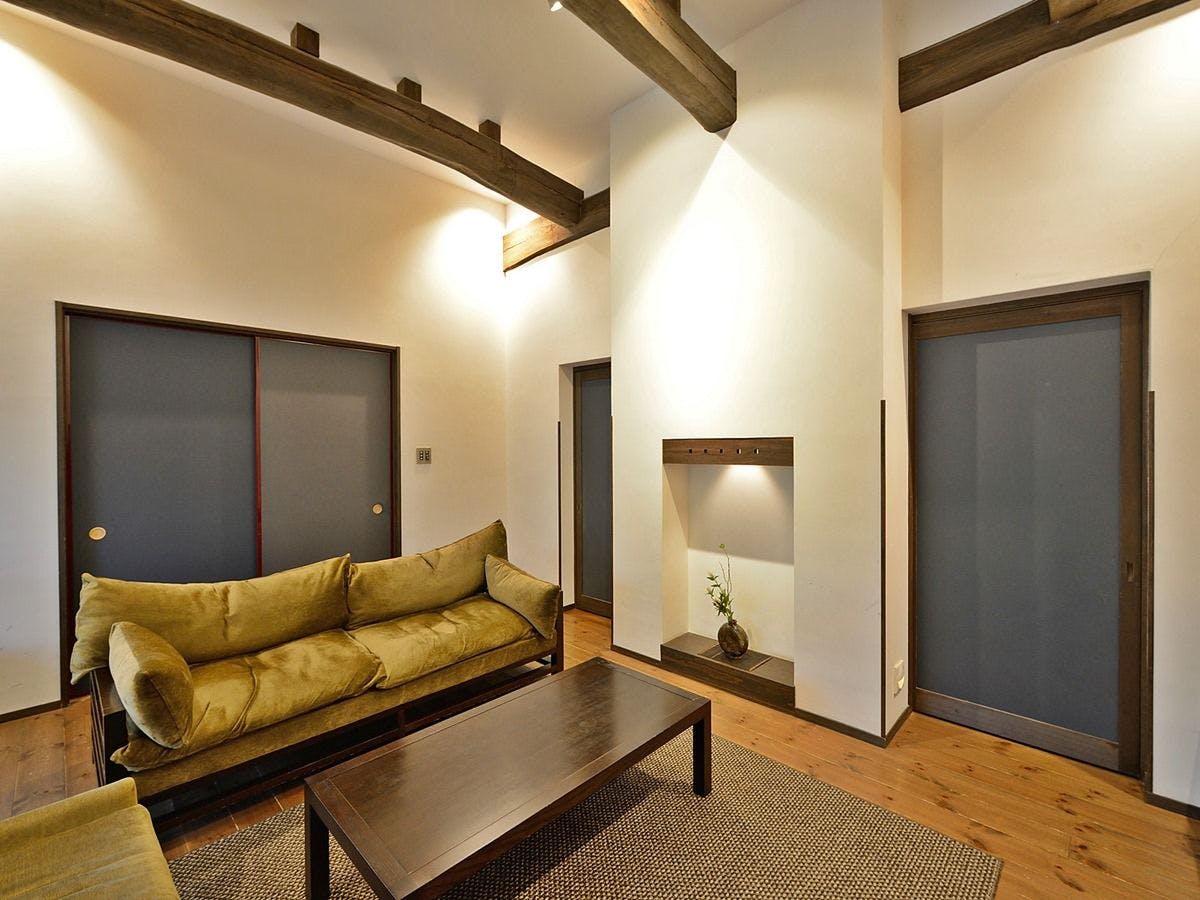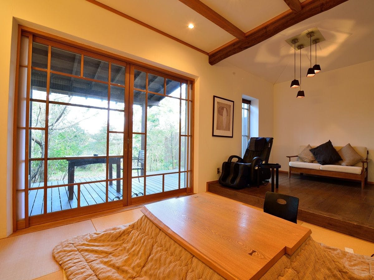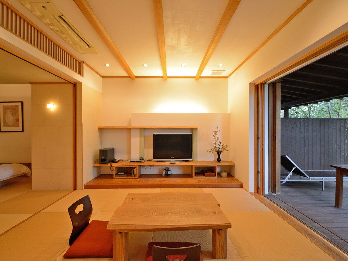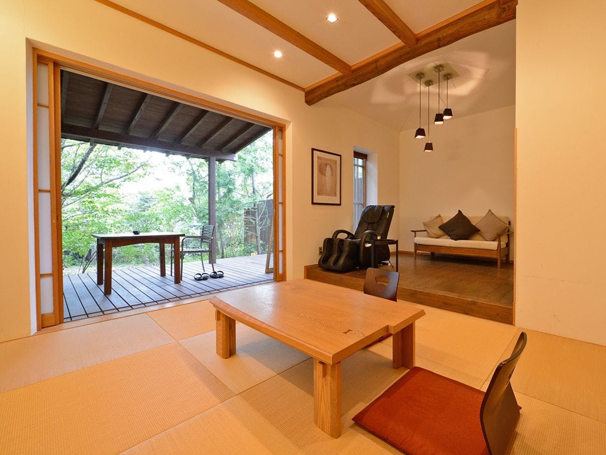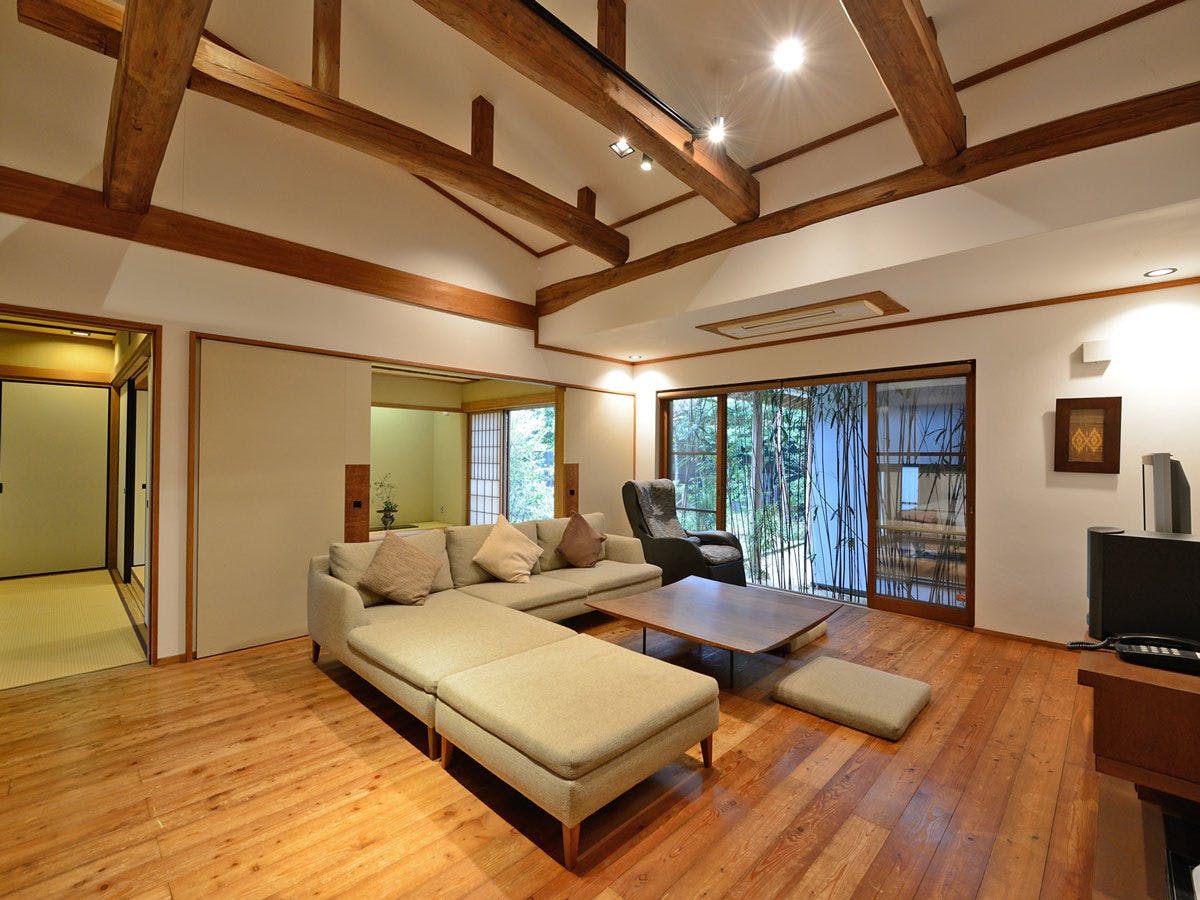 築190年の旧家をリノベートした母屋と全室露天風呂付の離れの客室。四千坪の緑豊かな庭に囲まれ、自家農園の野菜を楽しむ癒しのロハス宿。