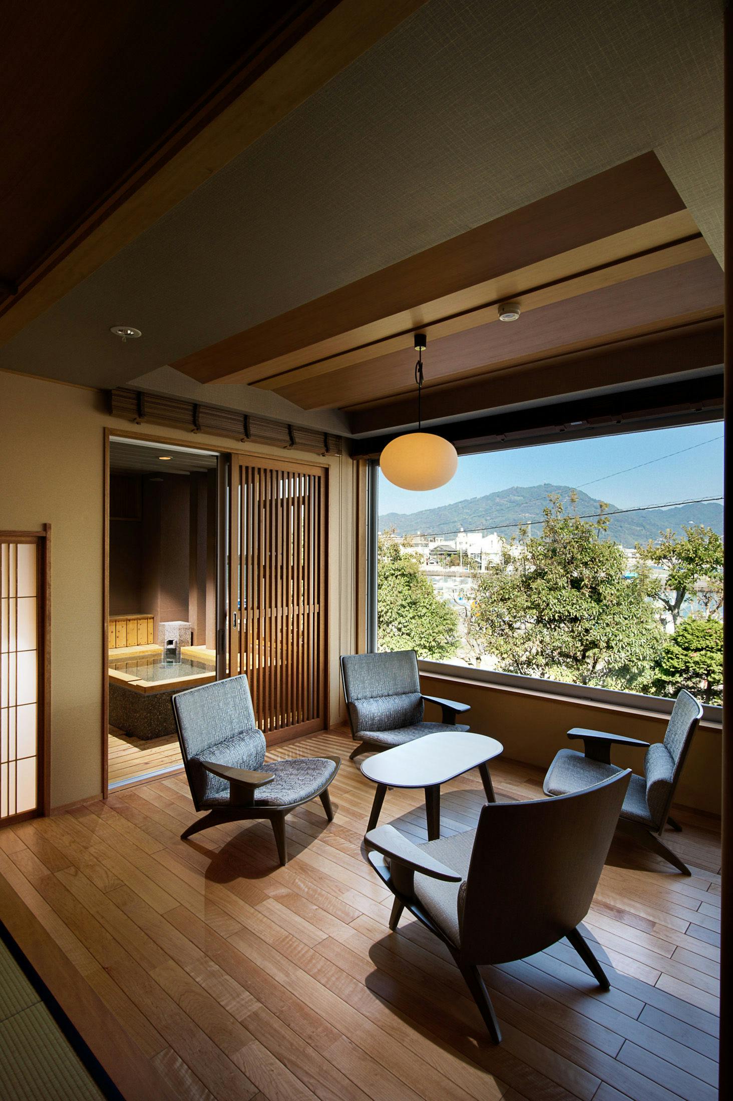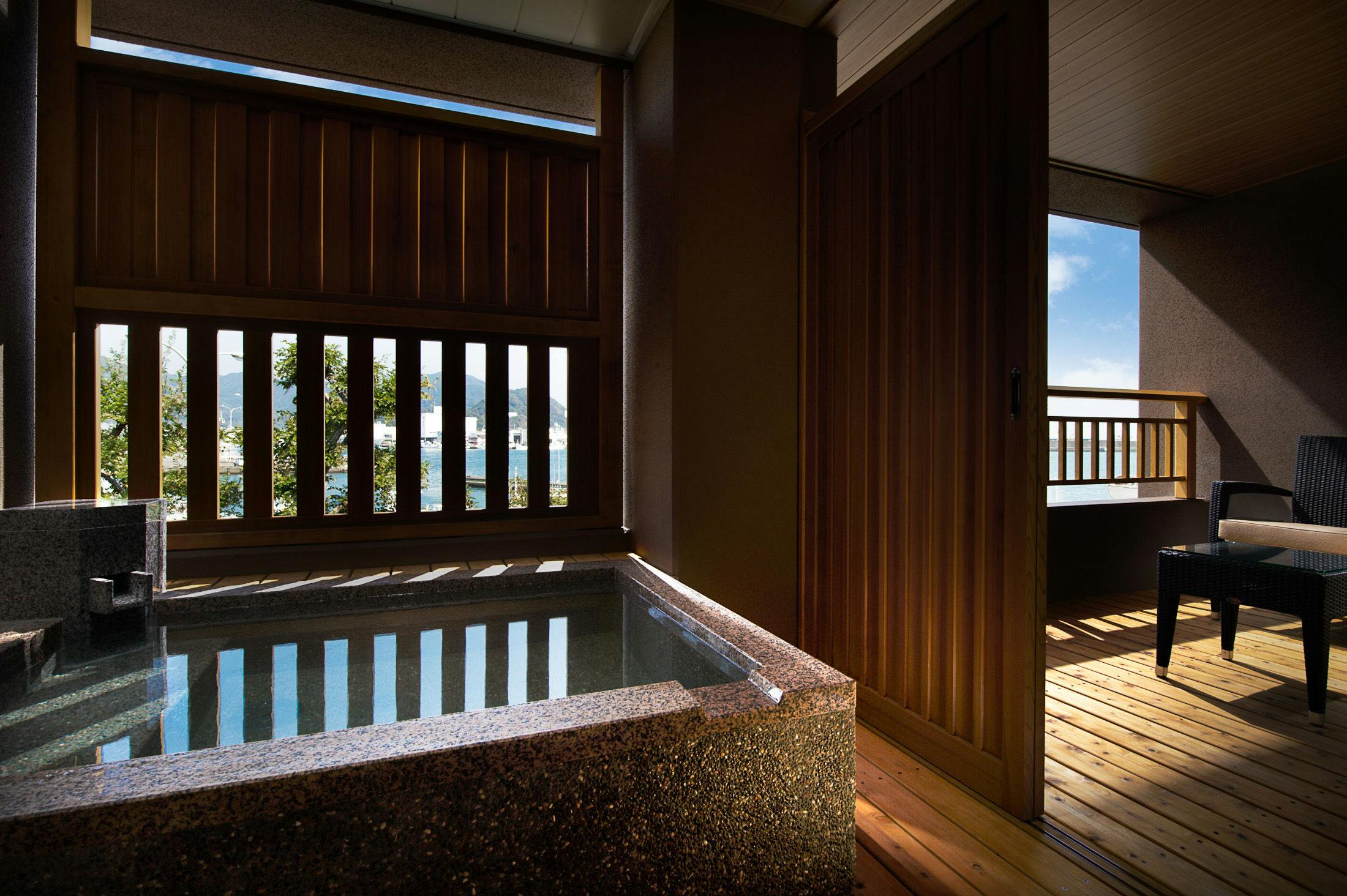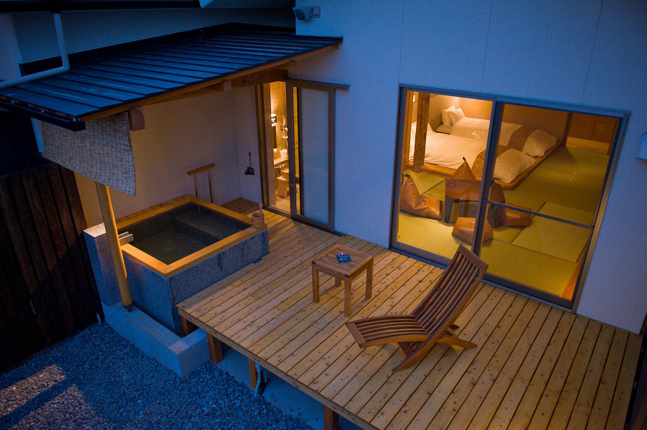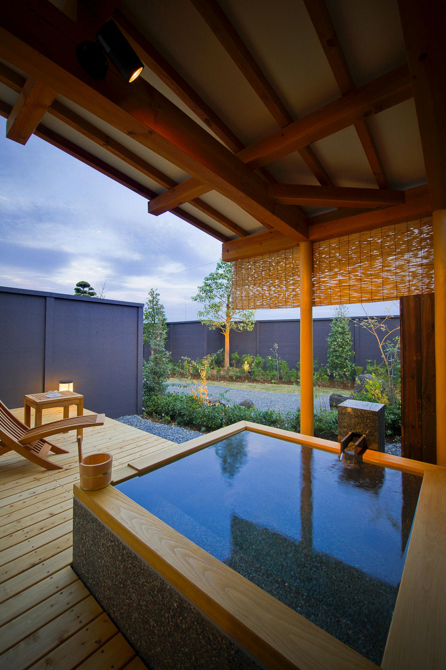 風雅な草庵のように一つひとつが離れ形式になっている客室「みなと庵」。各室の露天風呂は、庭園や夜空を眺めながら浸かっていると自分が自然の中に溶け込んでいくかのように静かで開放的。露天風呂をプライベートに堪能できます。