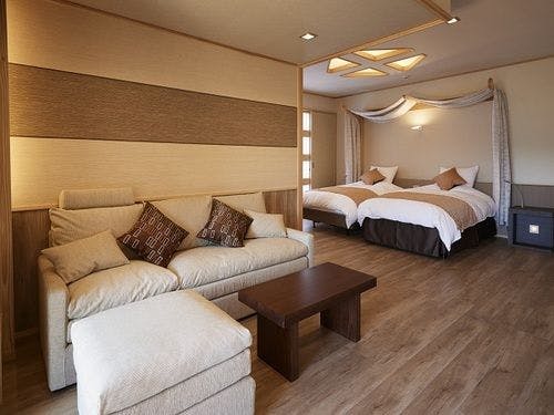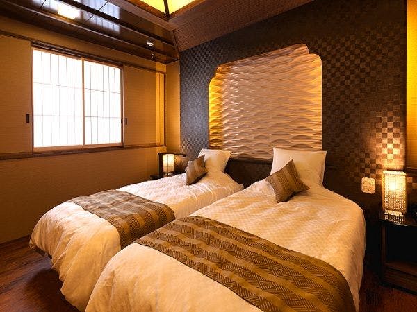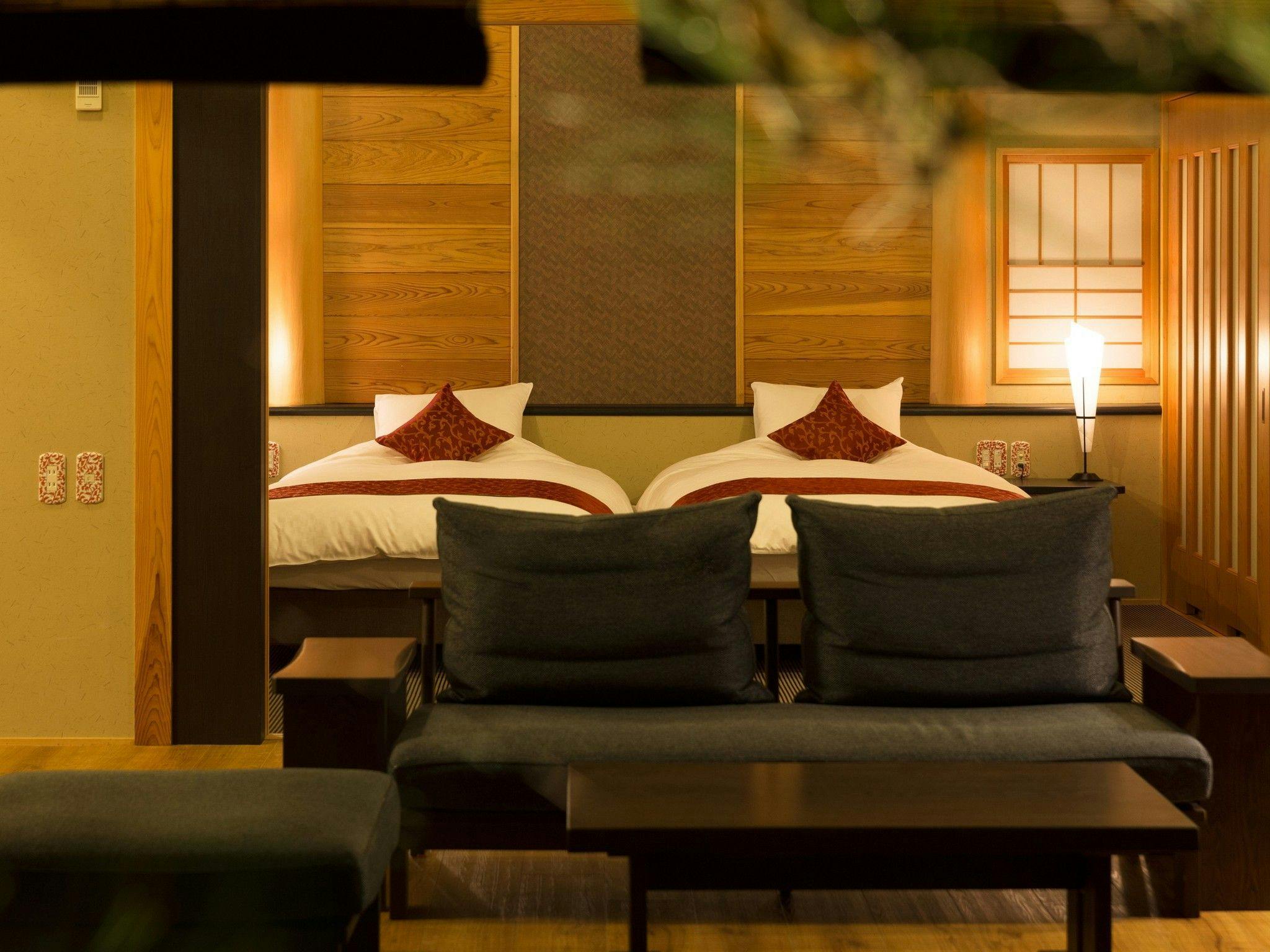 奥に向かうとツインベッドルームやリビング、露天風呂がございます。