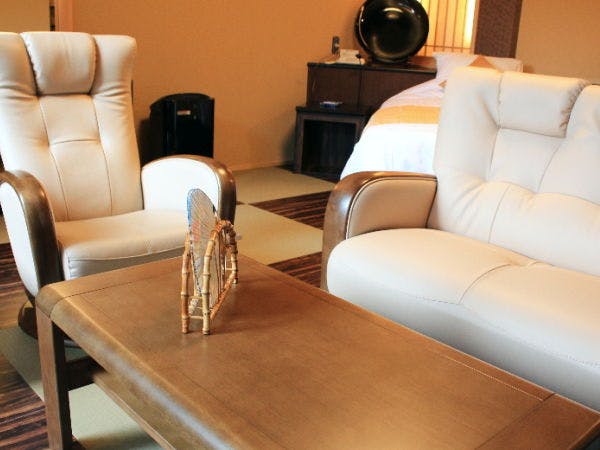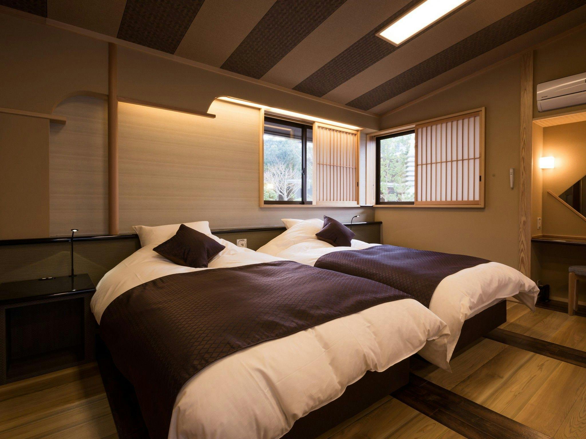 茶を基調として、森林の中にいるようなスピリチュアルコンセプトの客室です。60平米に及ぶ空間と露天風呂、庭付の贅沢な造り。