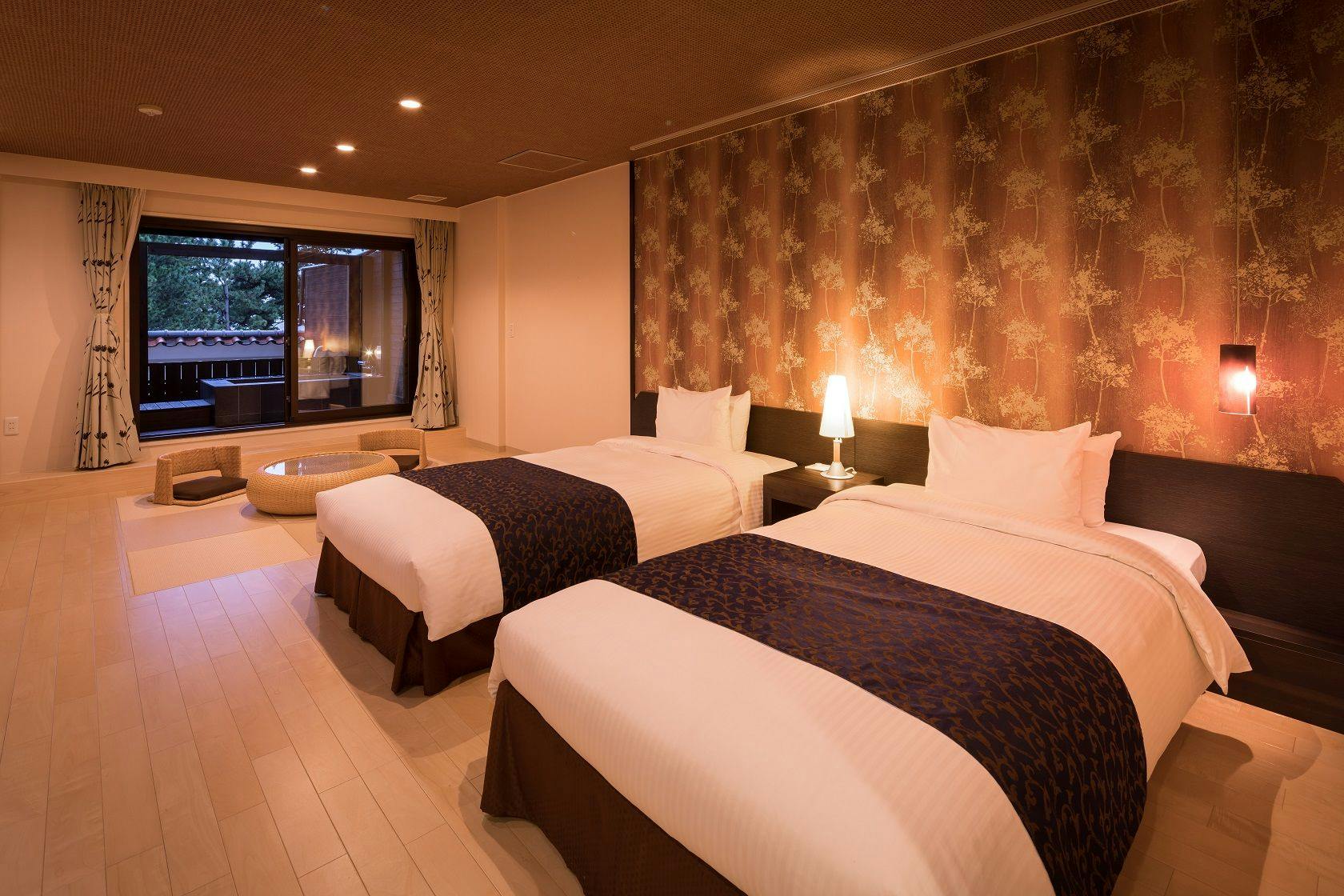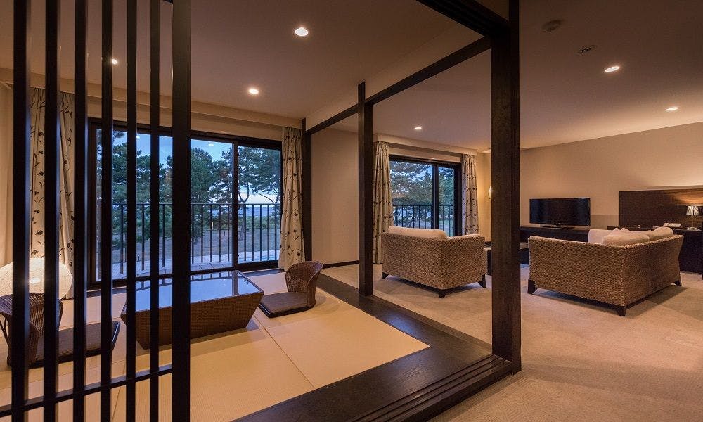 琉球畳の畳スペースとローベッドが設置されたモダンな雰囲気の和室。うずしお温泉の露天風呂に浸かりながら贅沢な時間を満喫いただけます。