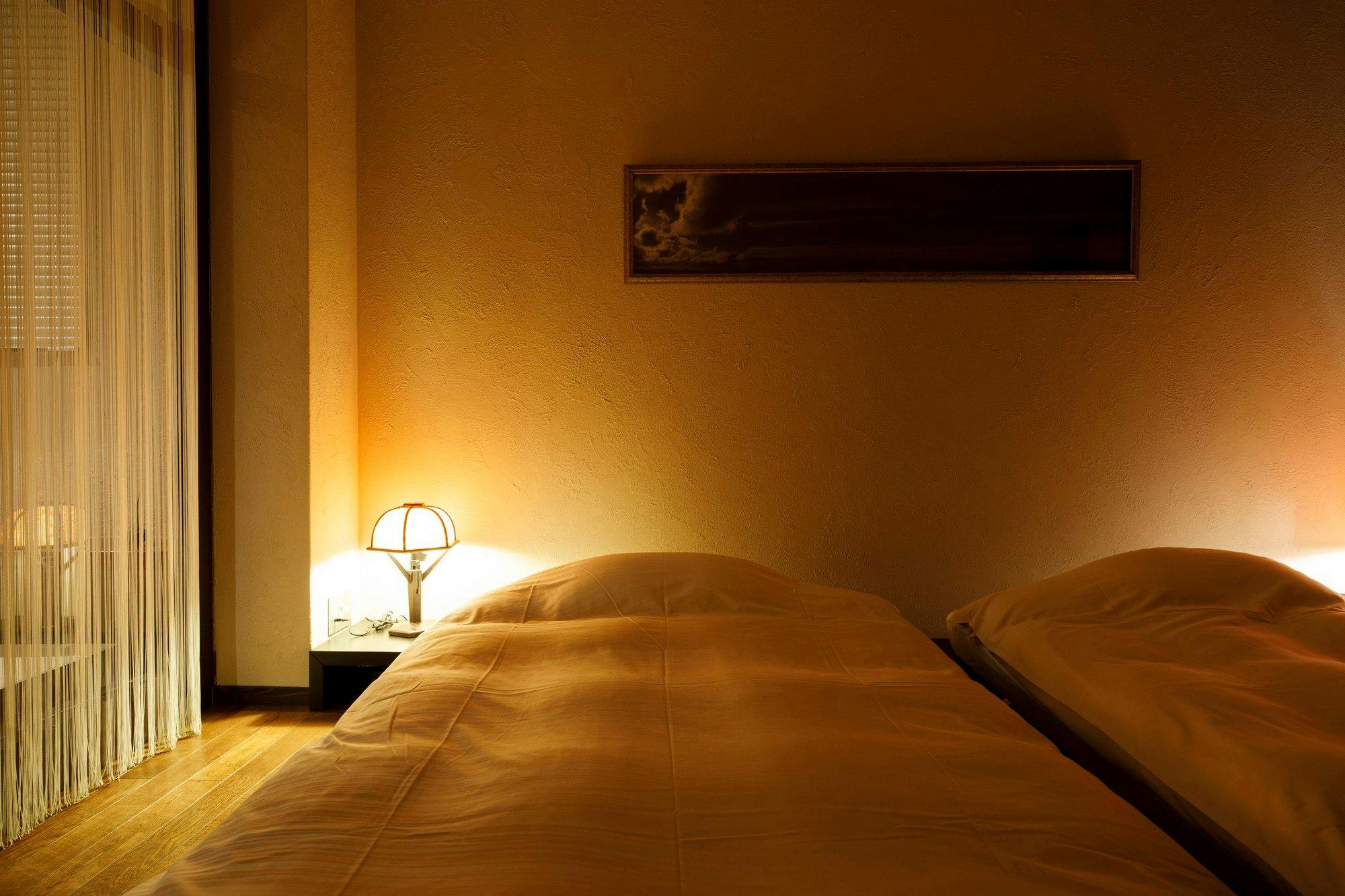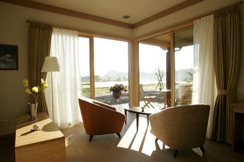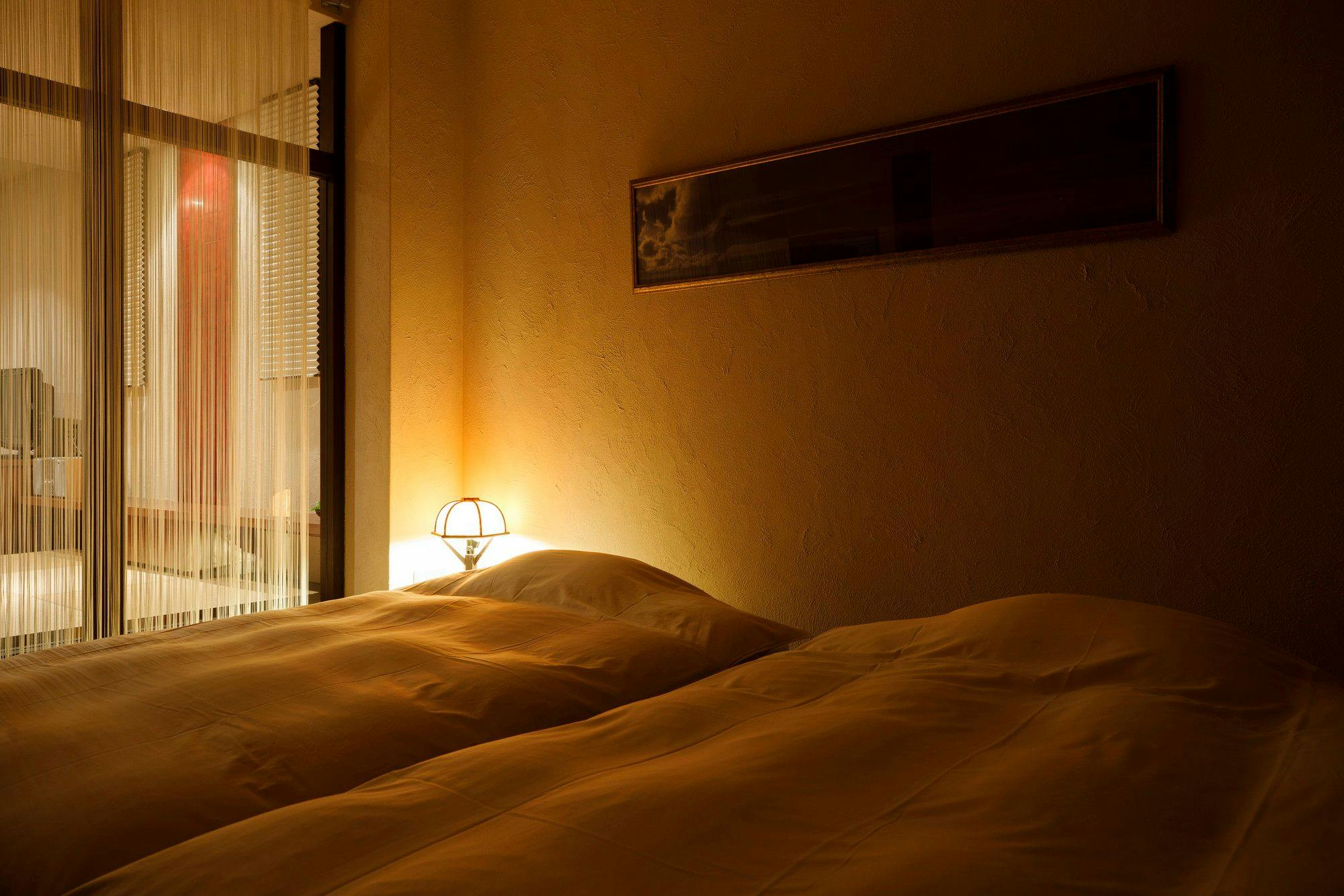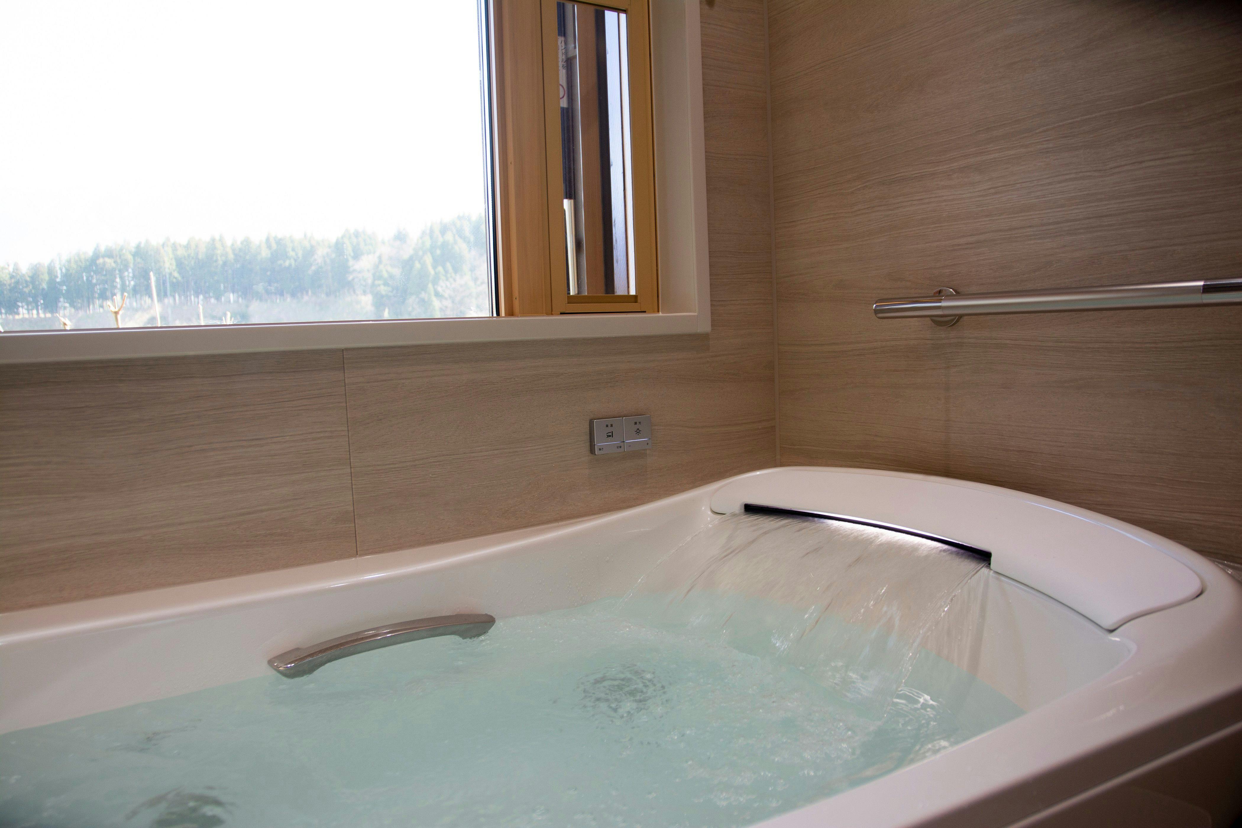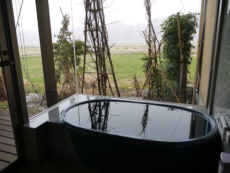 たっぷりと自然を堪能できる二面開放ウィンドウを施しました。里山の風景が眺められる浴室には陶器製のお風呂をご用意しております。ベッドは電動、マットレスはマニフレックス社製を設置。※大変柔らかいマットレスでございます。柔らかいマットレスがお苦手な方はほかのお部屋をおすすめいたします。