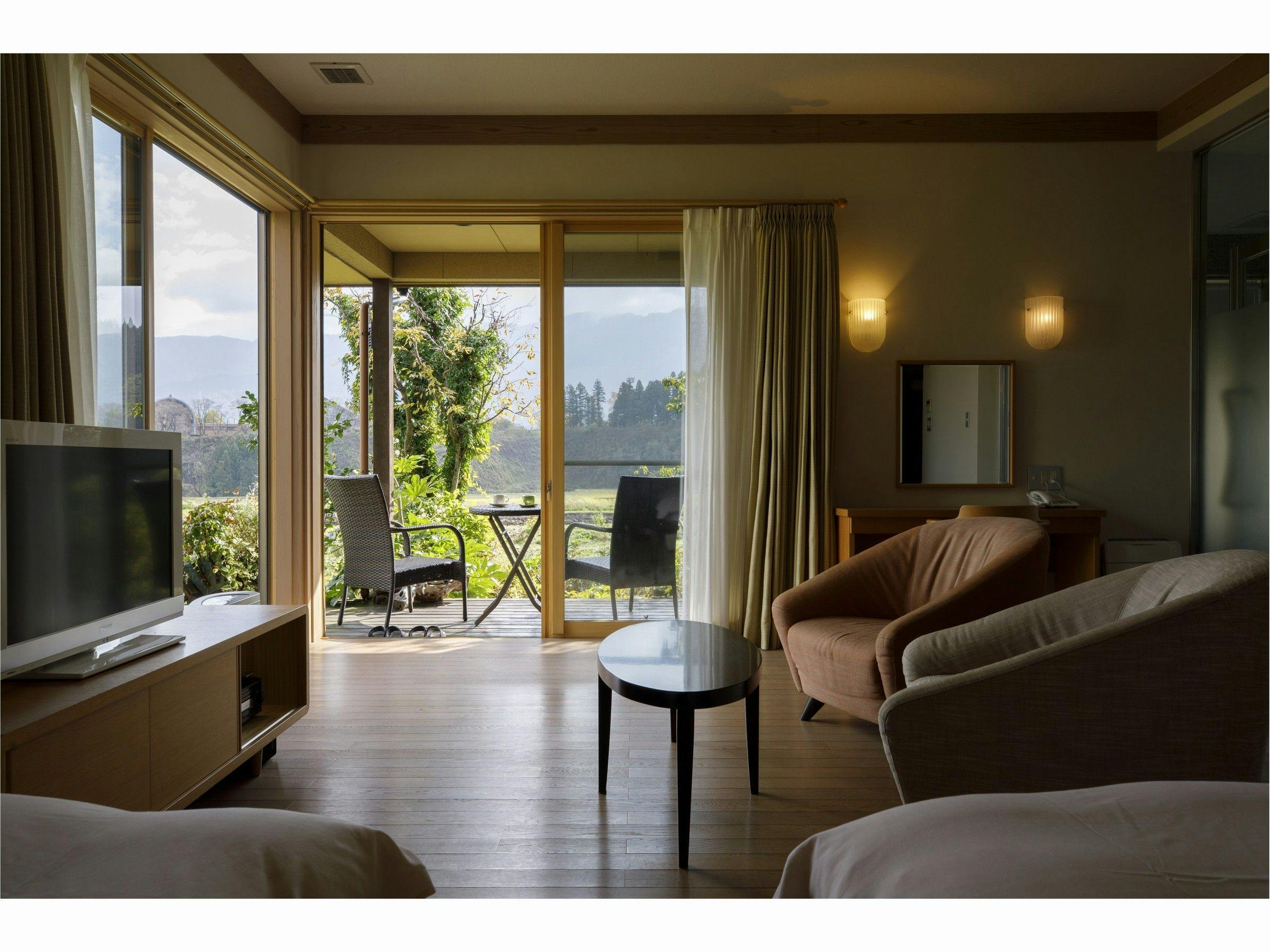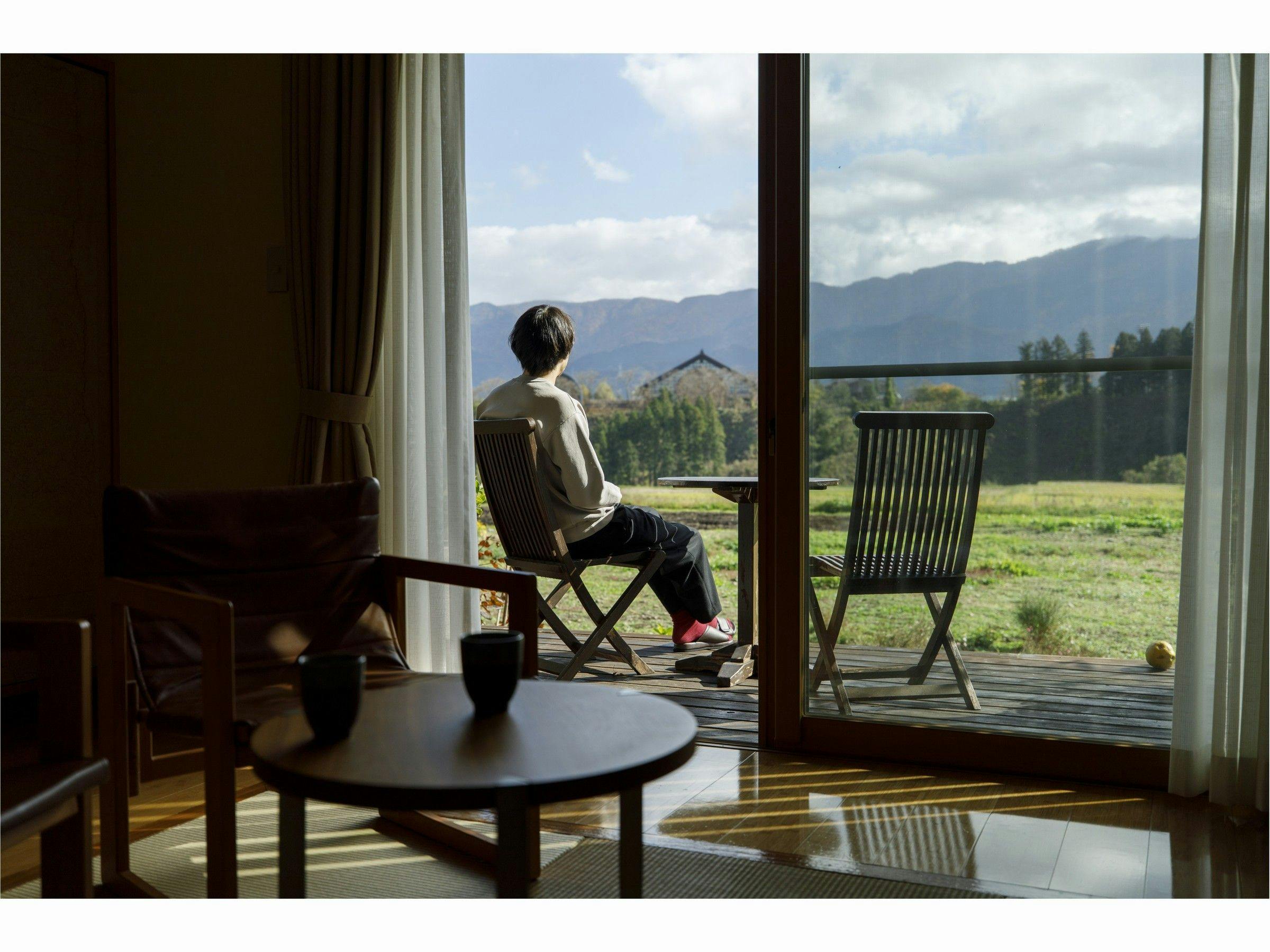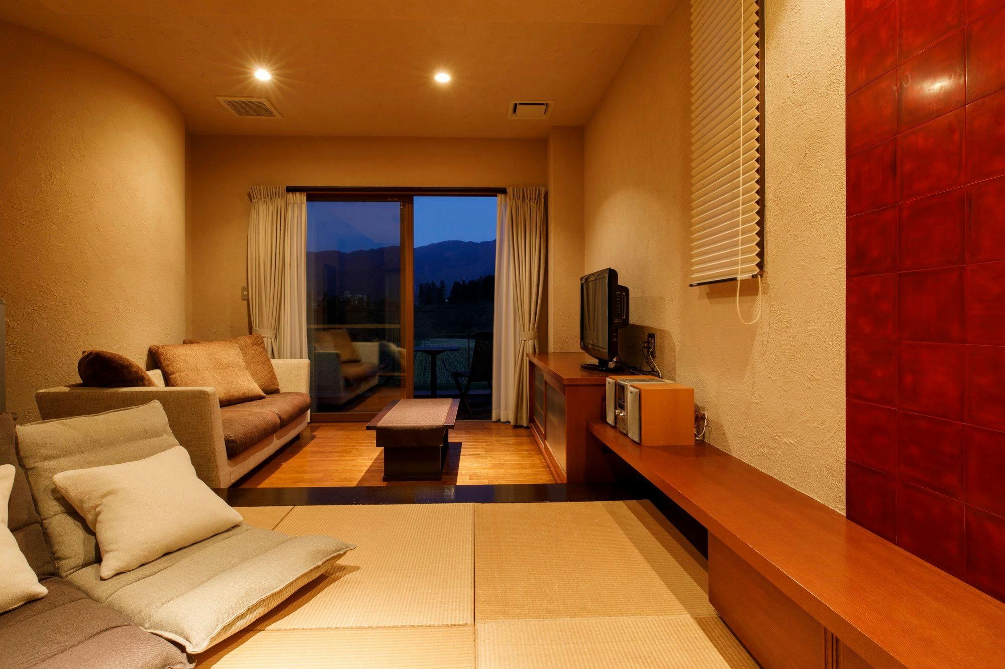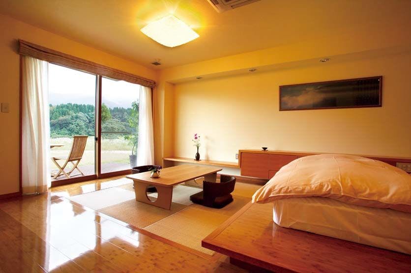 ~モダンな和風スタイルのお部屋、2~3名様まで利用可能です~モダンな琉球畳の取り入れた和風スタイルの一室です。テラスと浴室からは四季折々な里山の風景をお愉しみいただけます。浴槽はTOTO社製のファーストクラスモデルを採用、オーバーヘッドシャワー機能や肩楽湯や腰楽湯機能付きでやすらぎを堪能していただけます。客室内は禁煙ですが、テラスでの喫煙は可能です。※インターネットは無料で接続できます。 無線LAN