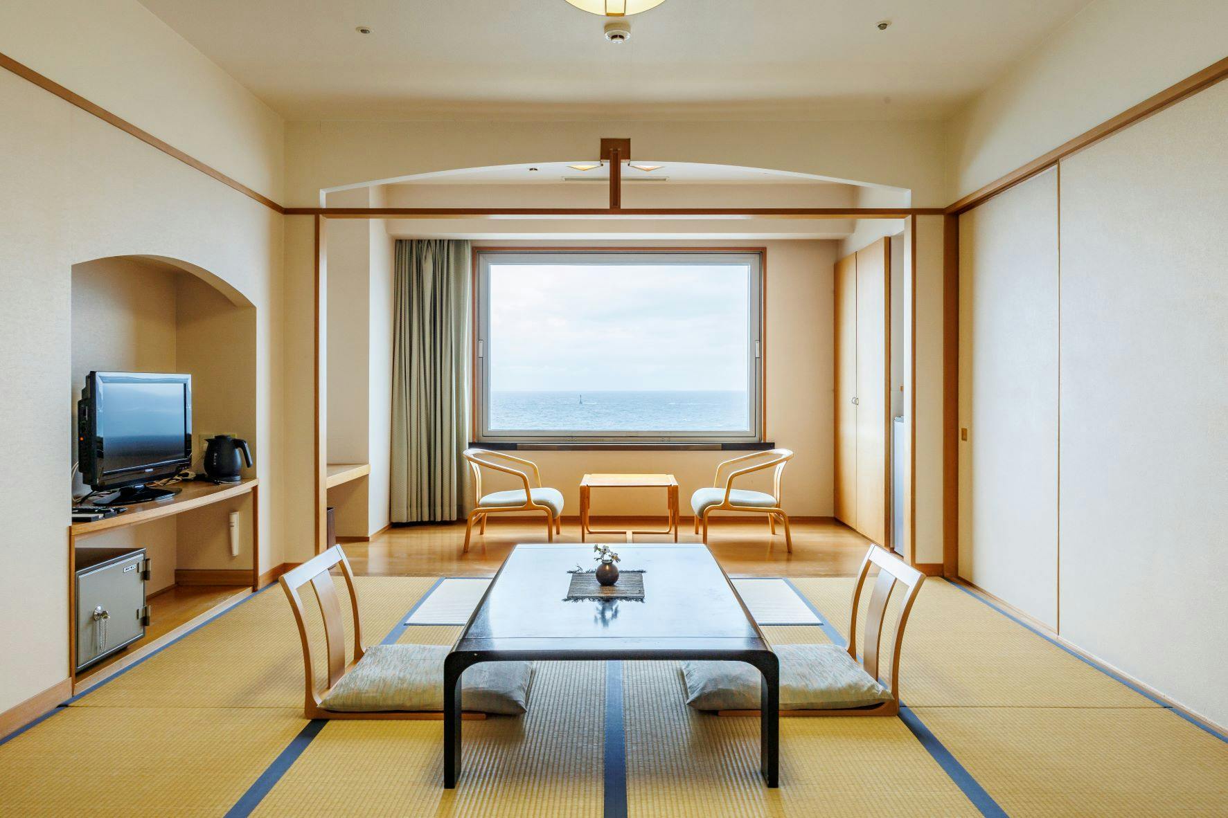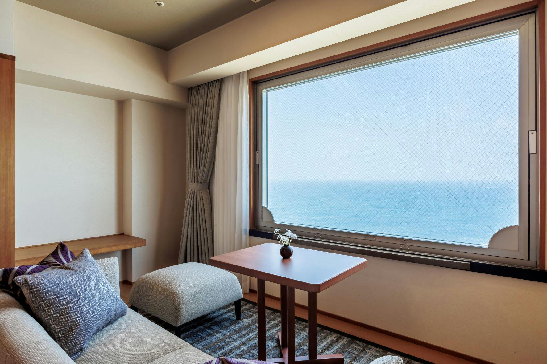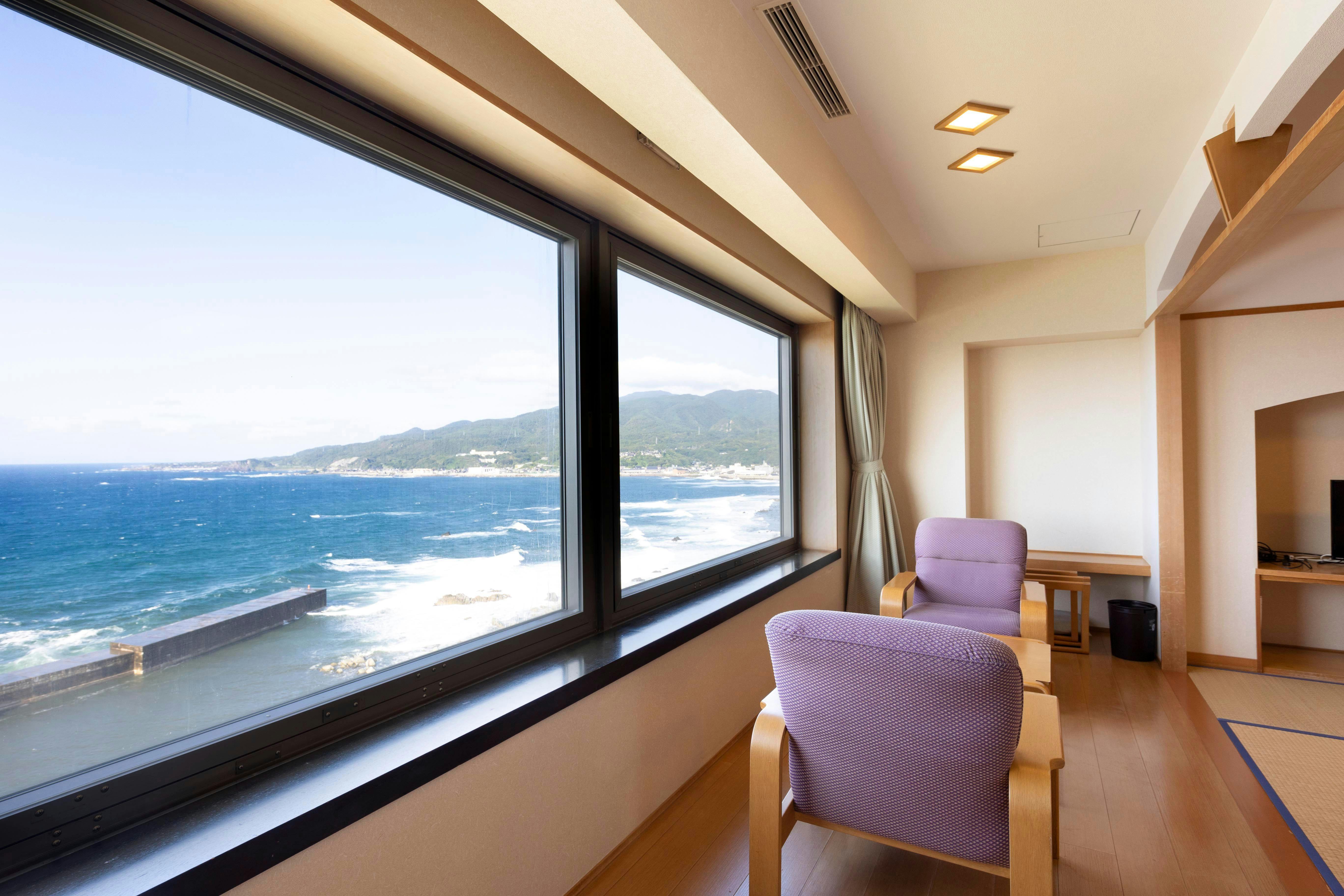 2023年・春に、和室ベッドルームとしてリニューアルしたお部屋です。ソファに座り紺碧の日本海を眺めてゆったりとお過ごしいただけます。ベッドのマットレスは上質な眠りへと誘うシモンズを採用。