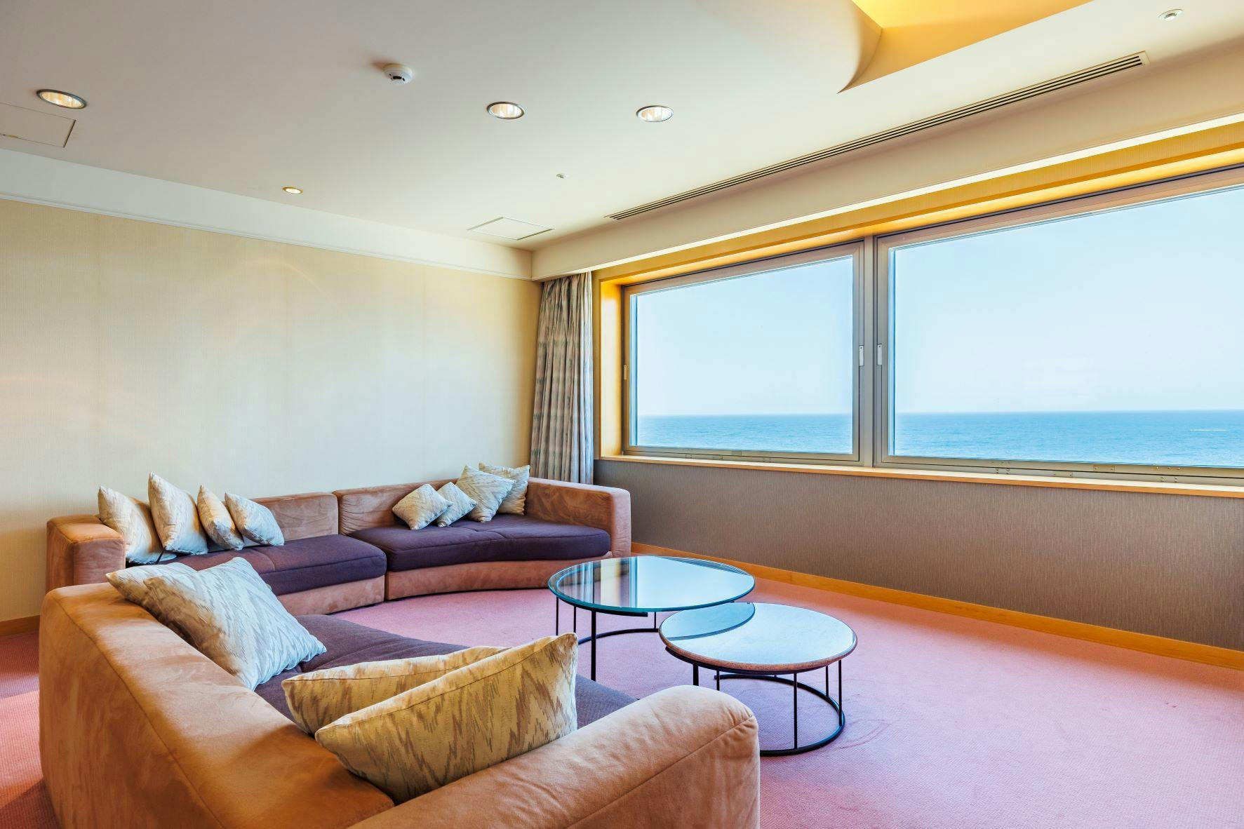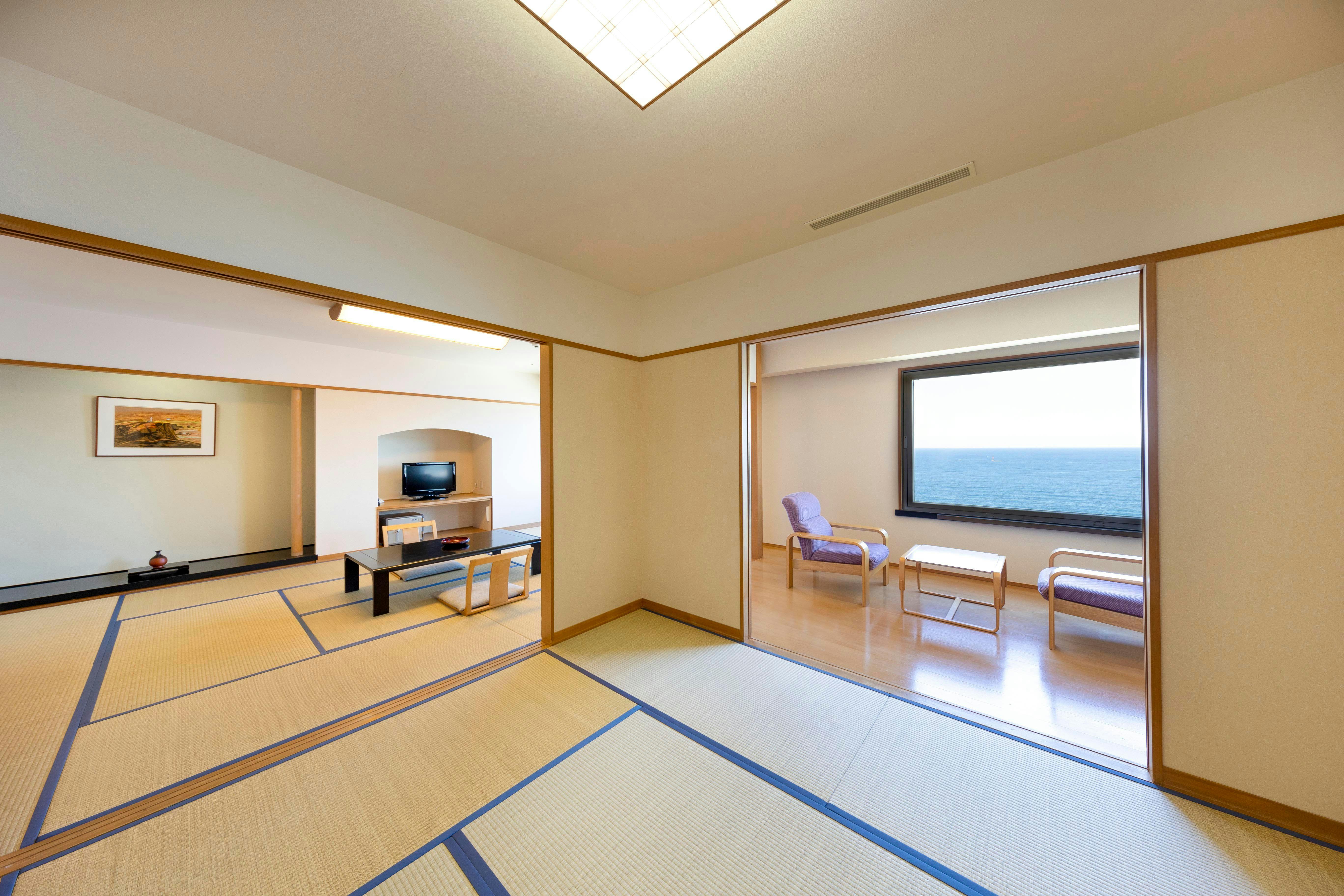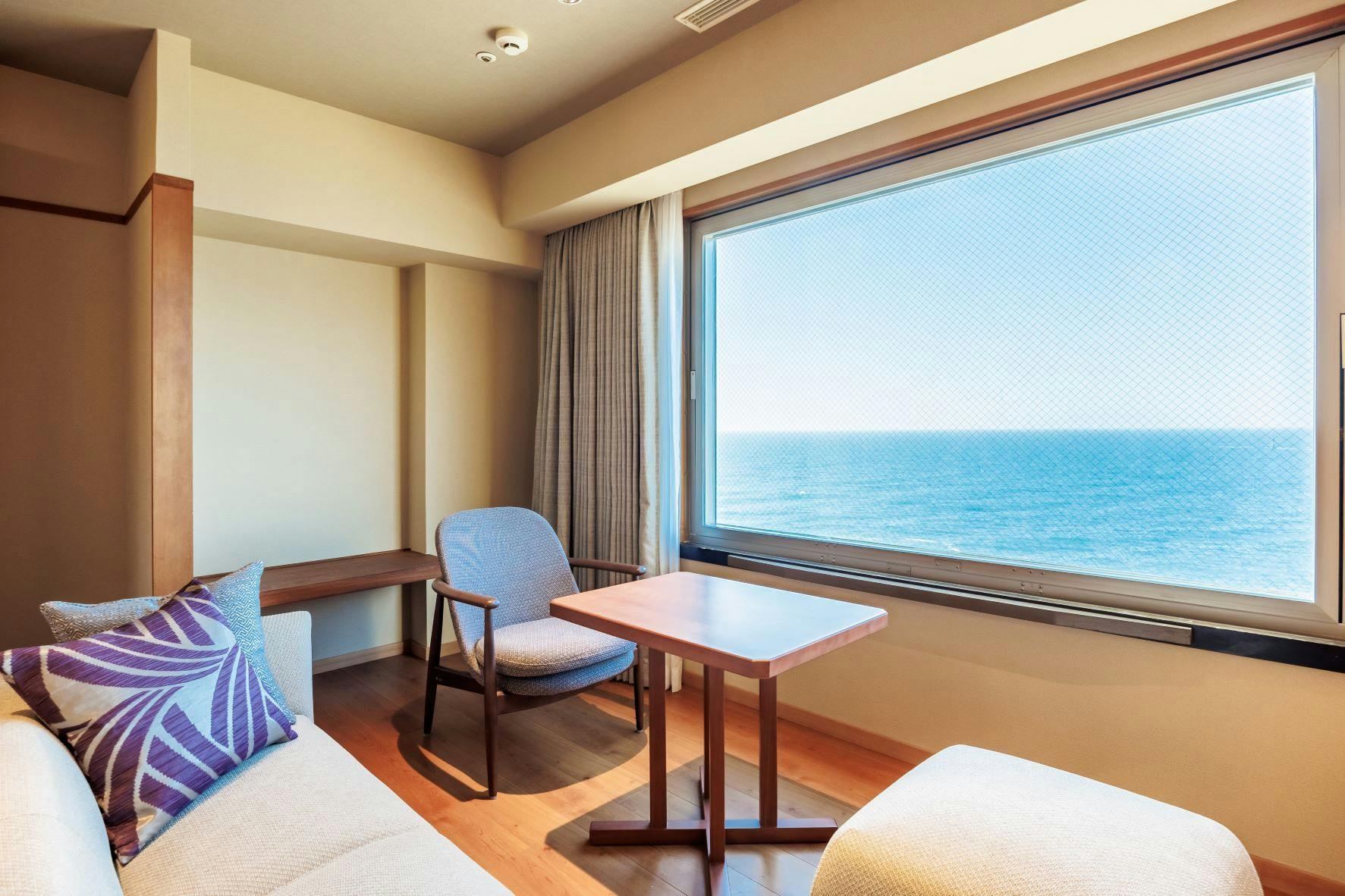 2023年・春に、和室ベッドルームとしてリニューアルしたお部屋です。ソファに座り紺碧の日本海を眺めてゆったりとお過ごしいただけます。ベッドのマットレスは上質な眠りへと誘うシモンズを採用。