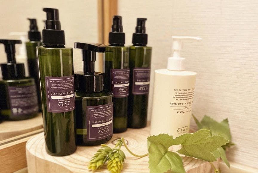 OSAJIスキンケアコスメ、歯ブラシ、タオル、ヘアブラシ、ヘアゴム、綿棒&コットン、シャンプー、コンディショナー、ボディウォッシュ、浴衣、帯、足袋、半纏、館内履き、巾着バッグ、コーヒー(マドラーセット)、煎茶、佐渡海洋深層水、御茶菓子