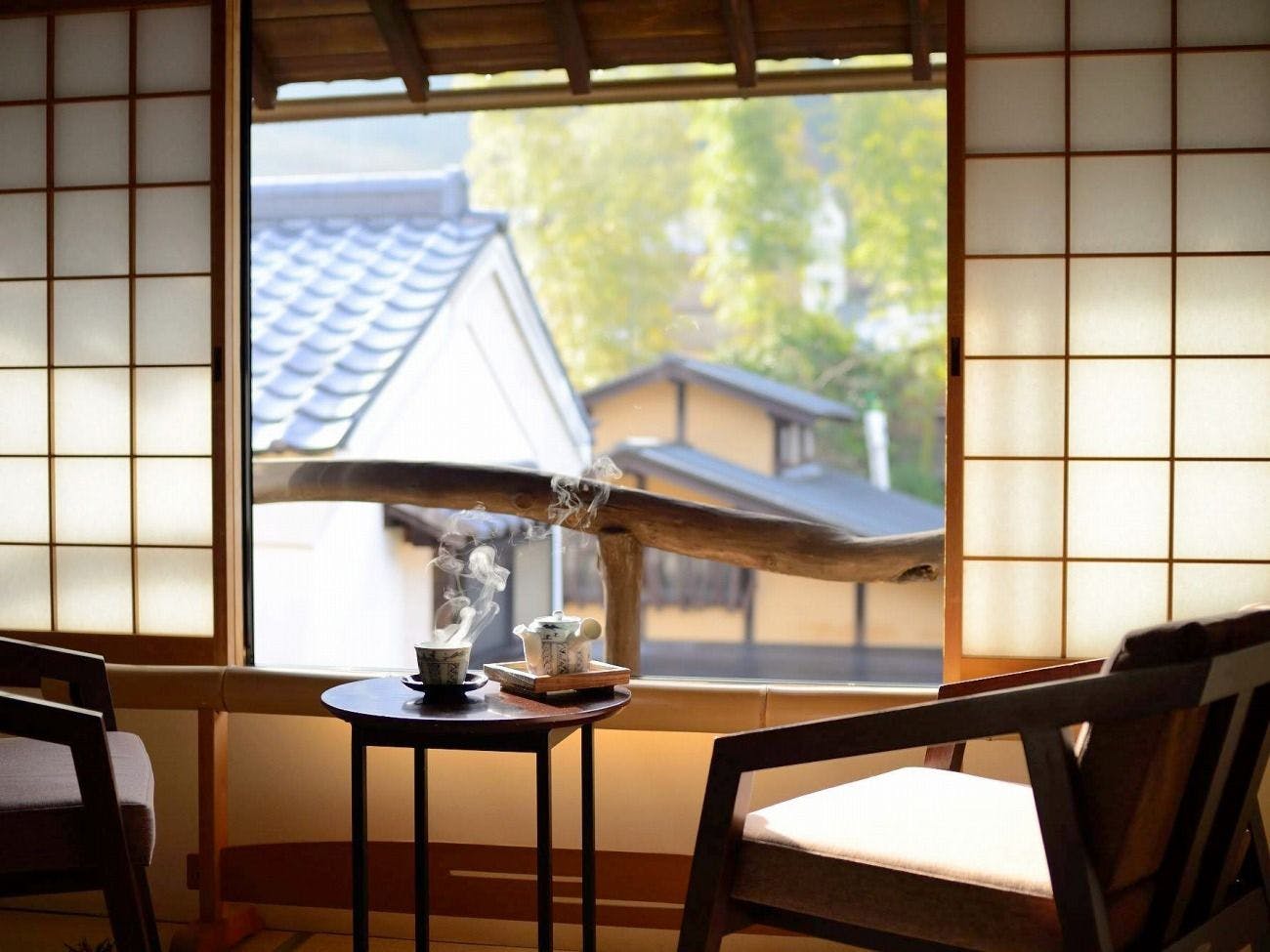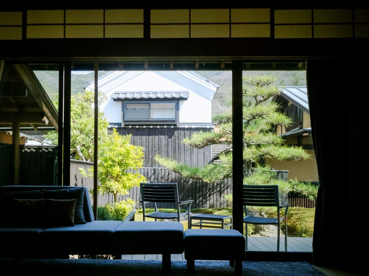 自家温泉の展望風呂+中庭に面した縁側テラス