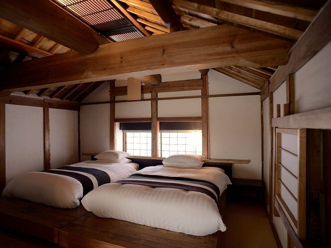 二階には、古い梁をあしらった開放感あるツインベッドの寝室。