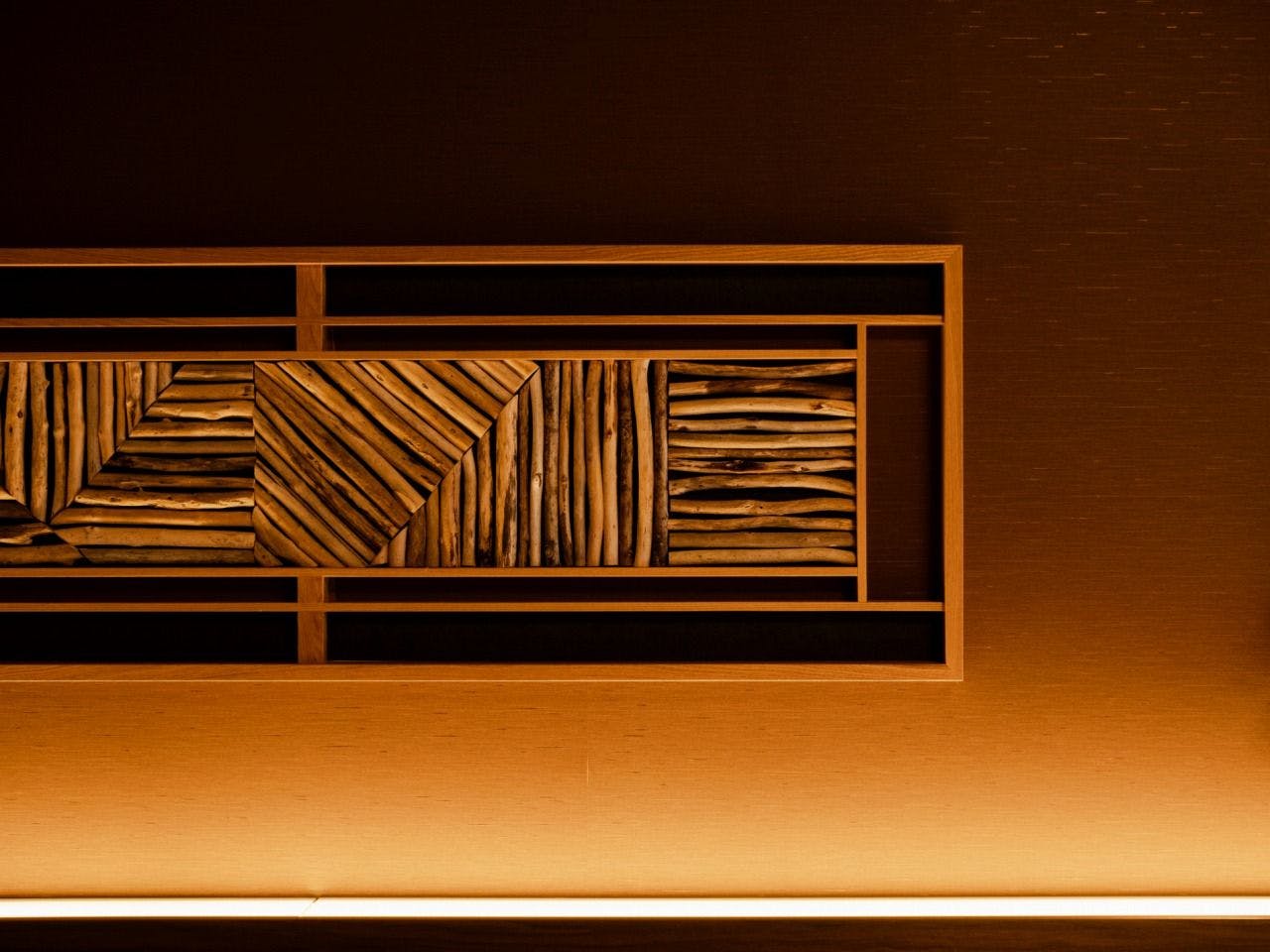 坪庭に面したガラス張りの空間で、昼夜で表情を変える光の移ろいに、