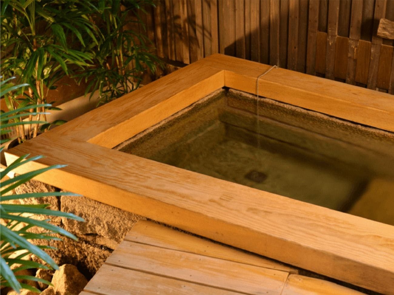 居室からガラス越しに続く、自家温泉の桶風呂には、